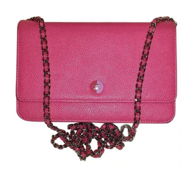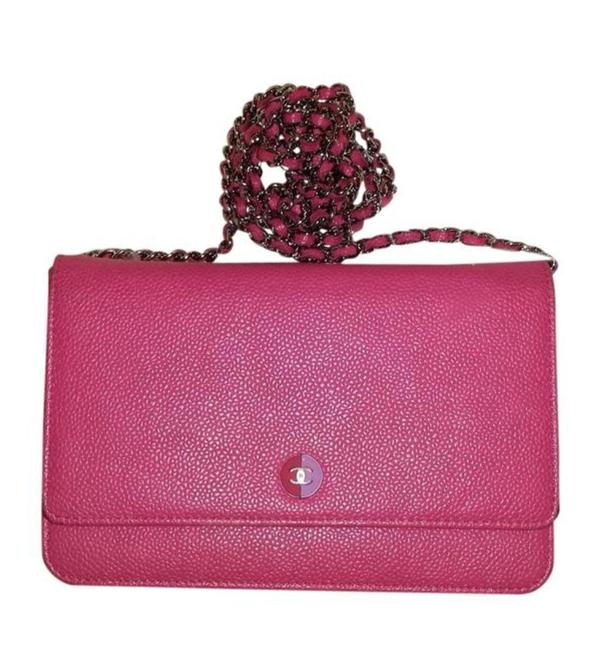 Chanel Classic and Timeless Wallet on a Chain in Fuchsia PINK Caviar Leather with CC Enamel Button Logo Silver link Chain and Hardware SHW.