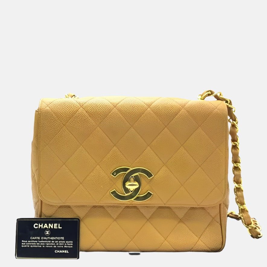 Experience timeless elegance with the Chanel Vintage Classic Flap Square Shoulder Bag. Crafted with luxurious caviar leather and 24k gold plated hardware, this stunning bag exudes sophistication. The iconic big CC logo stands out against the warm caramel color, making it a statement piece for any occasion.