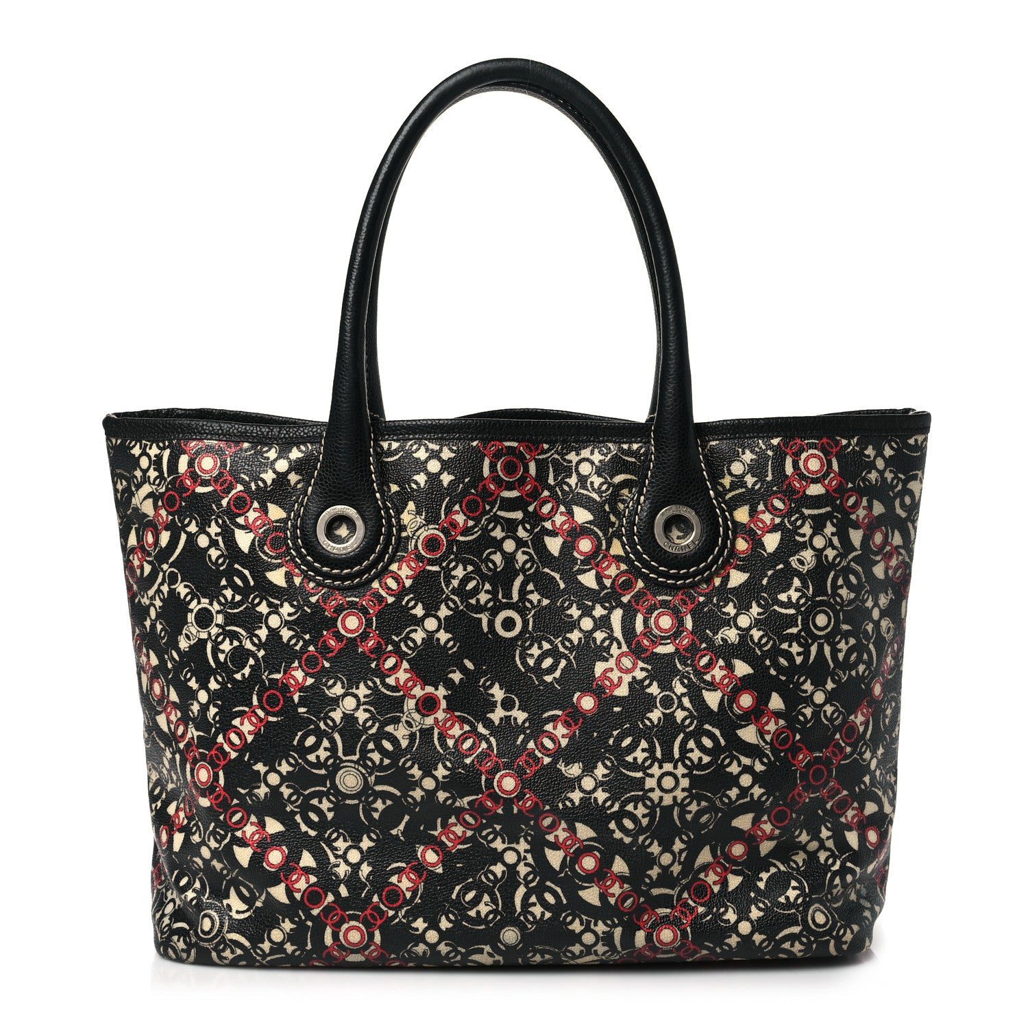 This is a CHANEL Coated Canvas Coco Small Tote in Black, a bold and eye-catching piece crafted from coated canvas featuring an overlapping black and white Chanel CC print, accented by a striking red diamond-patterned CC motif. The bag is designed with rolled leather top handles detailed in white contrast stitching and trim, adding a refined touch to its edgy aesthetic.