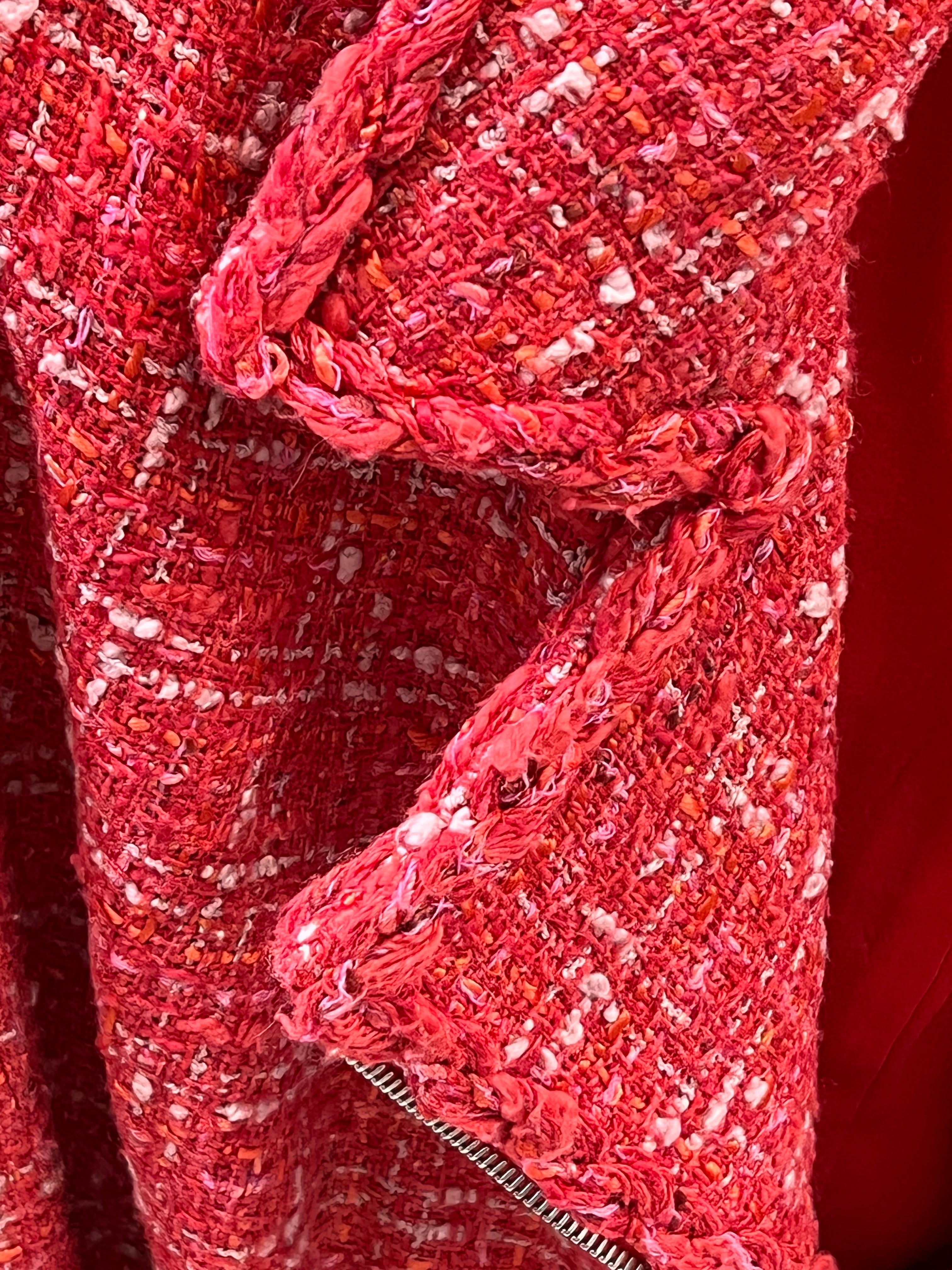 Features the world-tweed treatment in colors ranging from ripe strawberry to orange. Two slanted, zippered pockets. Asymmetric, zippered front closure. A substantial collar literally begs to be “turned up”! Luxuriously lined, An adjustable woven chain belt and buttons that mimic bottle caps!