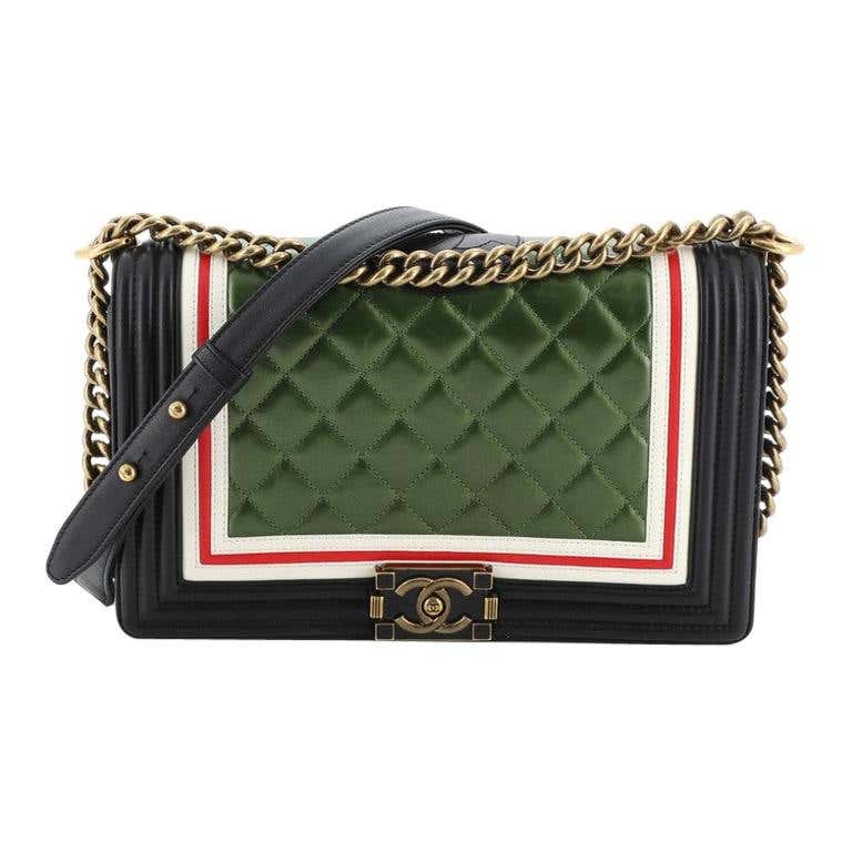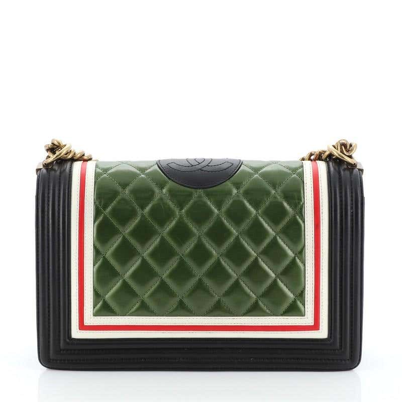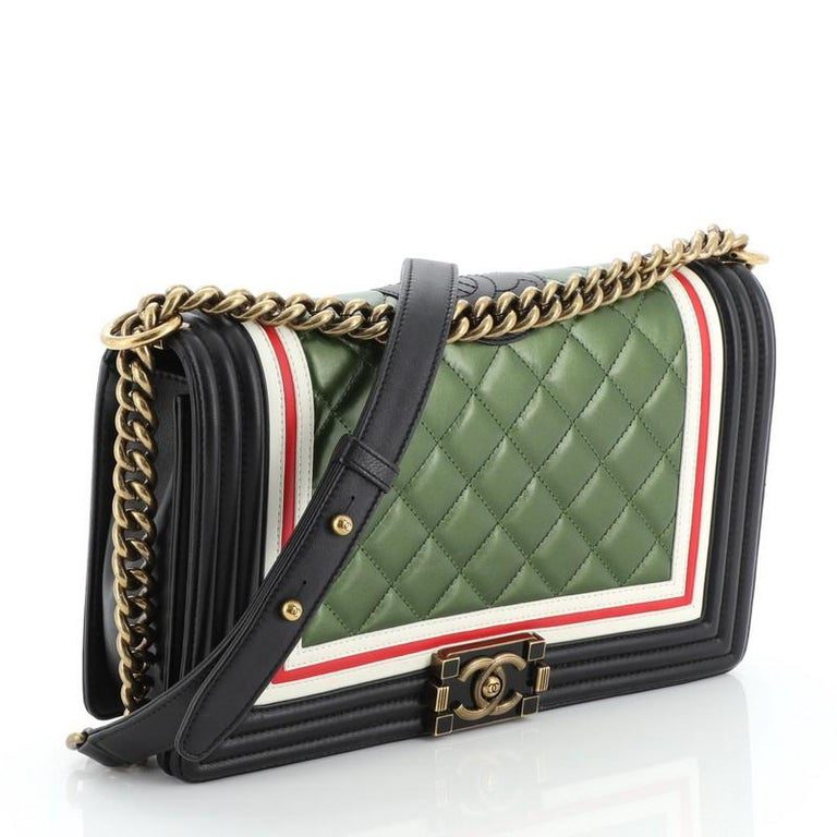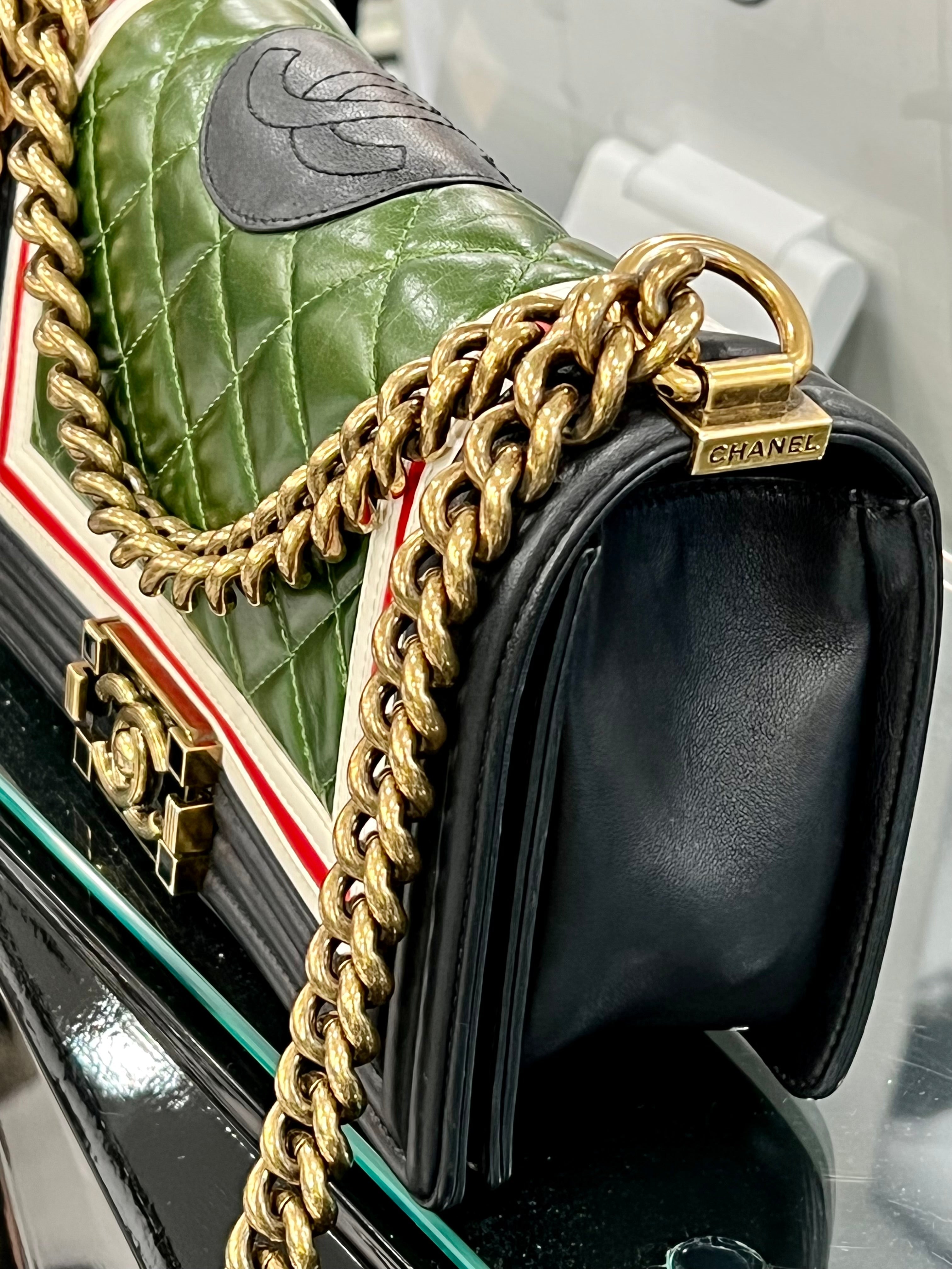 crafted from black, red, and green multicolored quilted lambskin leather features a chunky chain-link strap with leather shoulder pad, red and white border trims, and aged gold-tone hardware. Its CC Boy logo push-lock closure opens to a black fabric interior with a zip pocket.