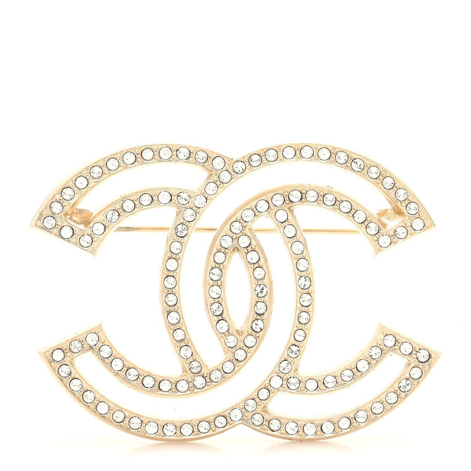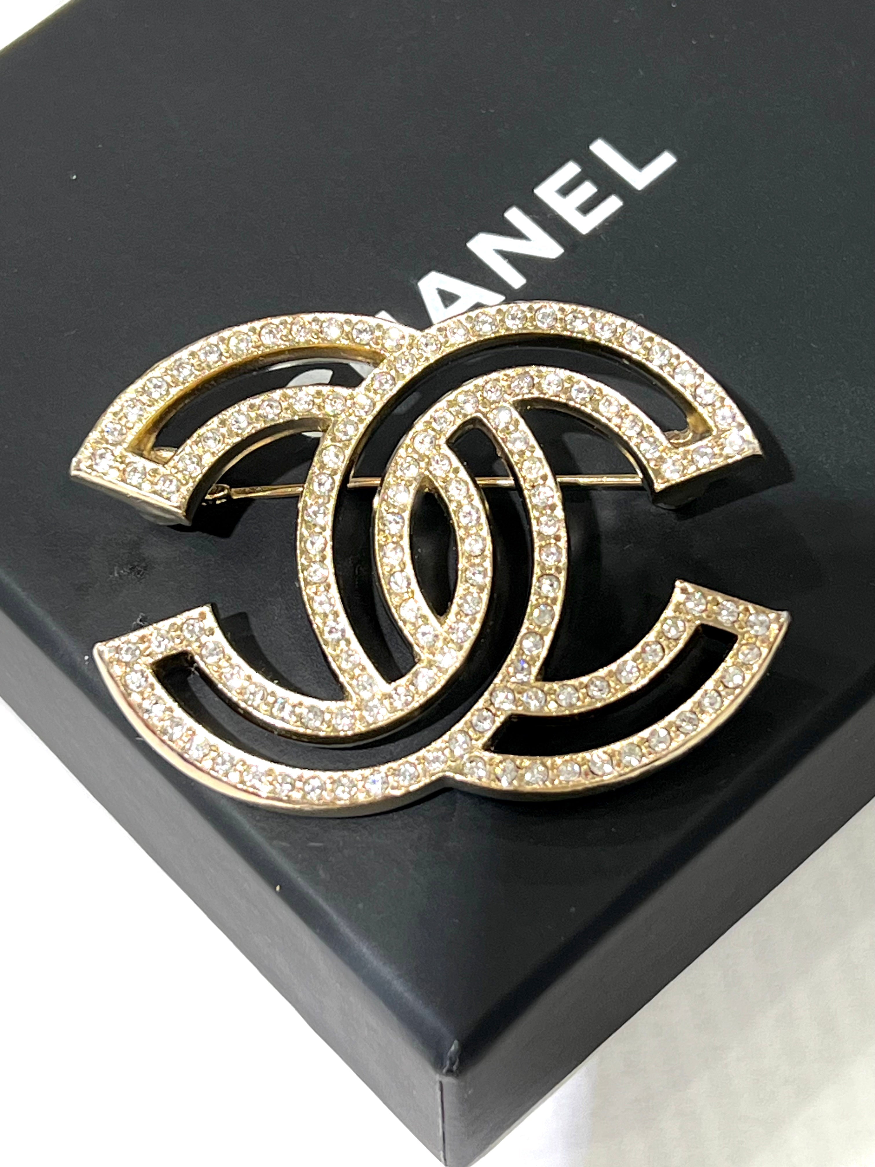CHANEL Crystal CC Brooch in Light Gold. This elegant brooch features a polished light gold-tone,Chanel CC logo lined with crystals.