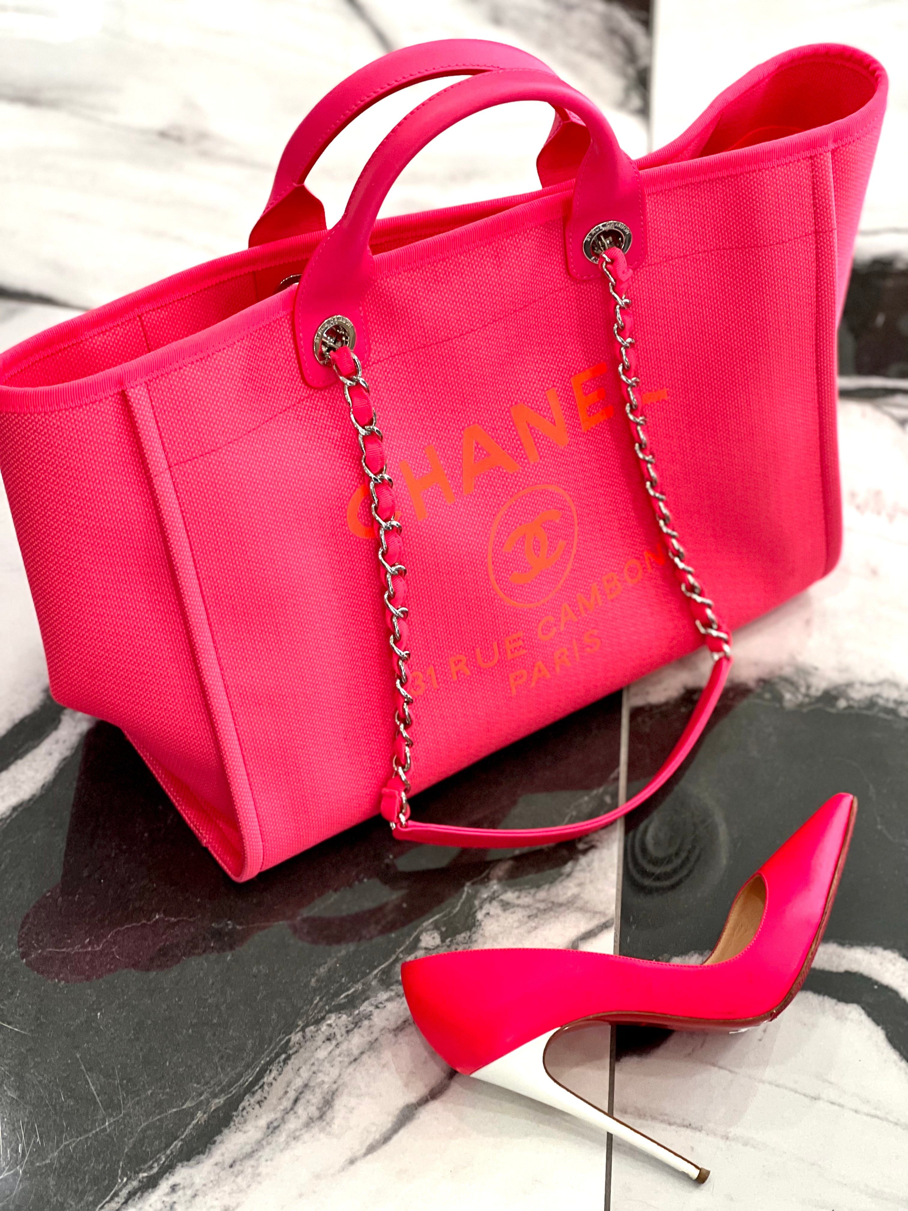 CHANEL DEAUVILLE MIXED FABRIC LARGE TOTE PINK & ORANGE