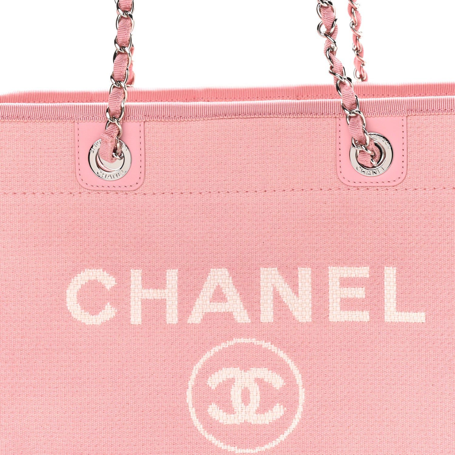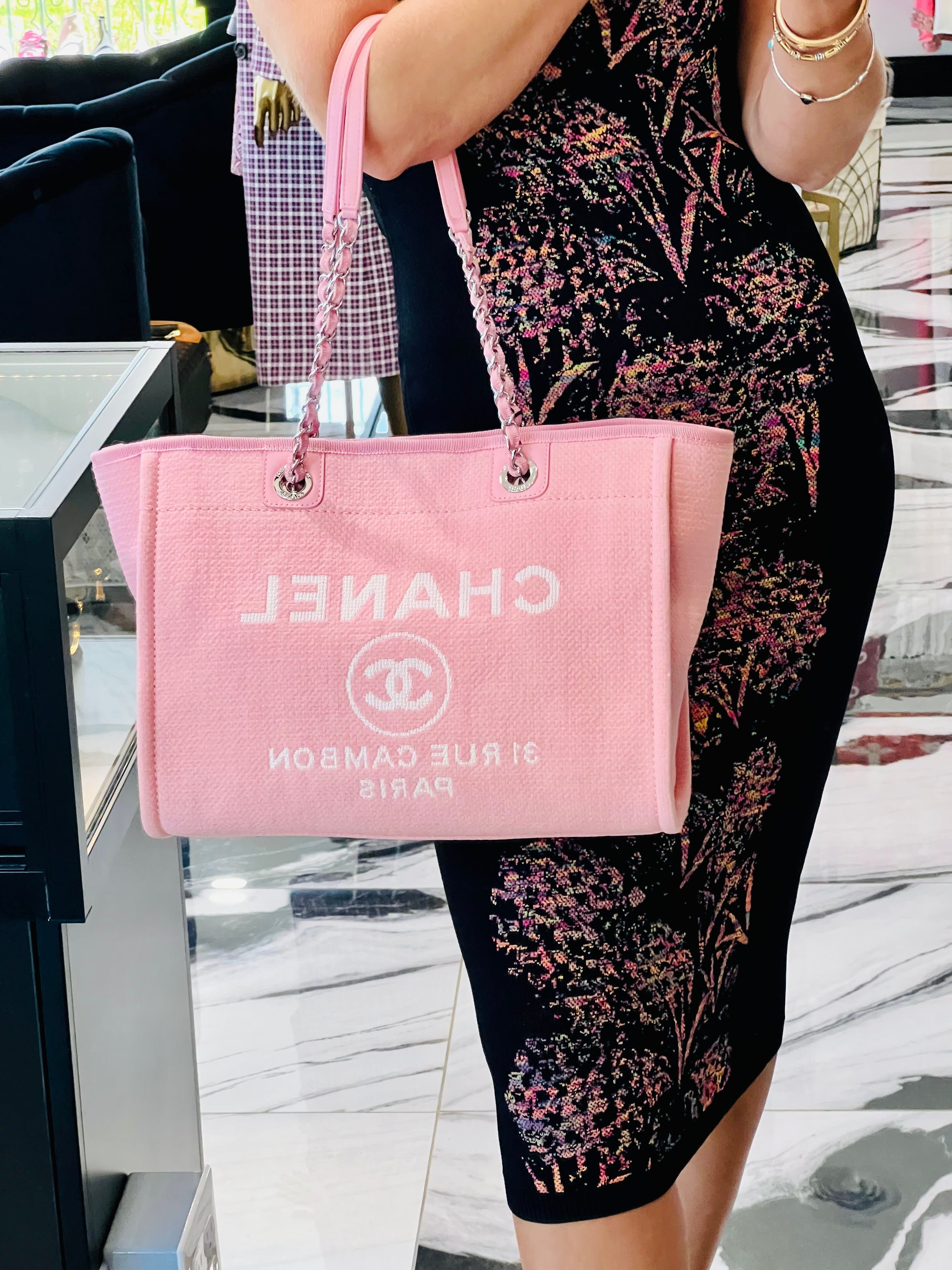 Deauville bag is made of pink boucle fabric with silver-tone hardware; featuring a large CC signature and Chanel logo on the front, removable pouch and interwoven silver tone chain link, and pink leather shoulder straps.