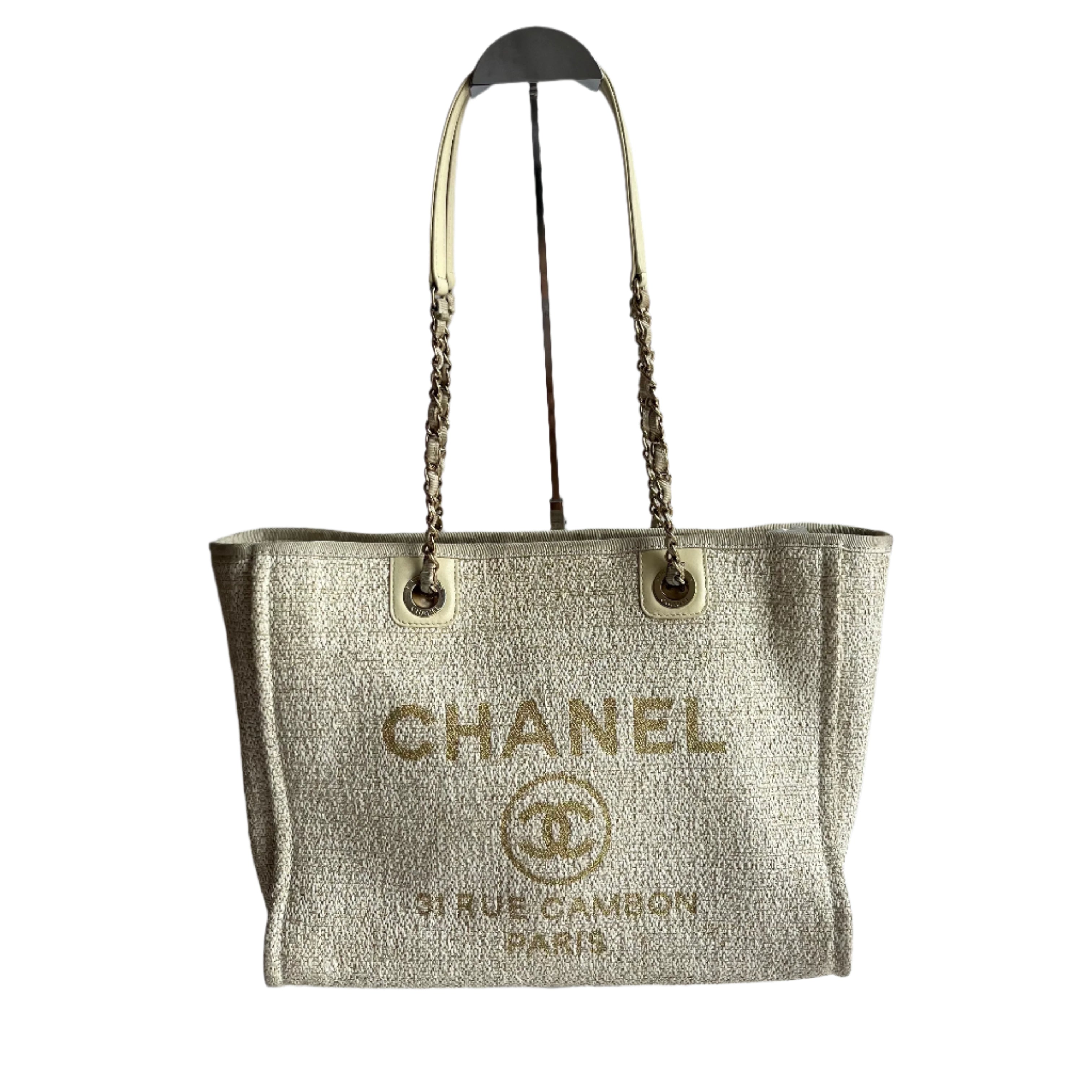 Be the first to review “Chanel Deauville Tote Gold Beige Cloth Leather Chain Strap Small 34cm”