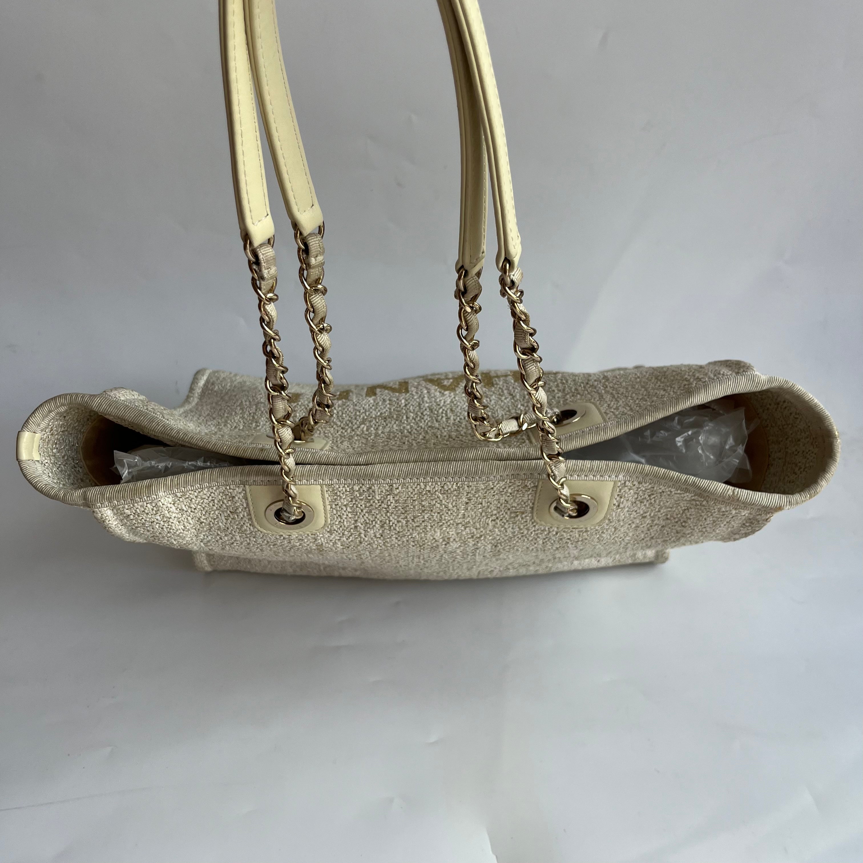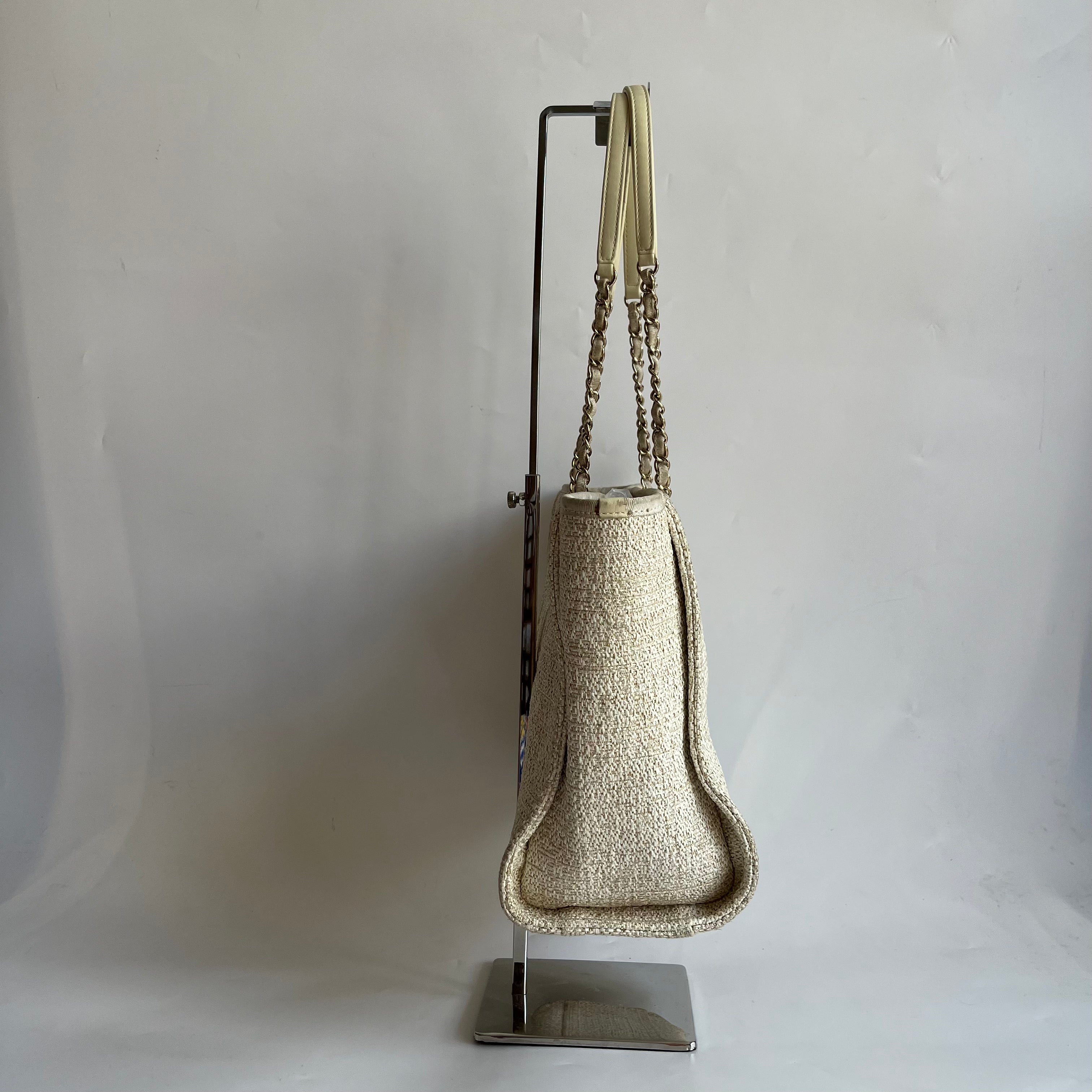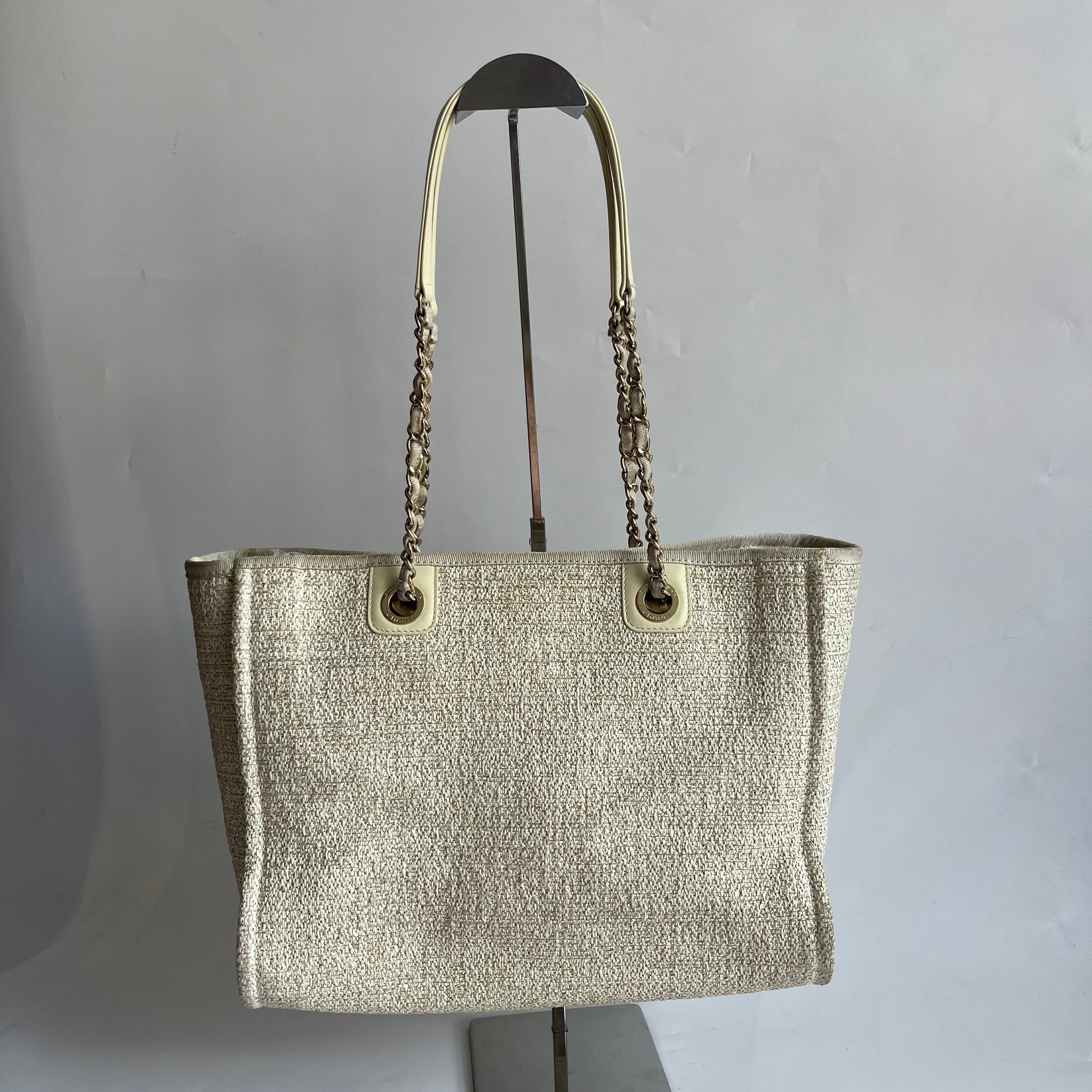 Chanel Deauville Tote Gold Beige Cloth Leather Chain Strap Small 34cm