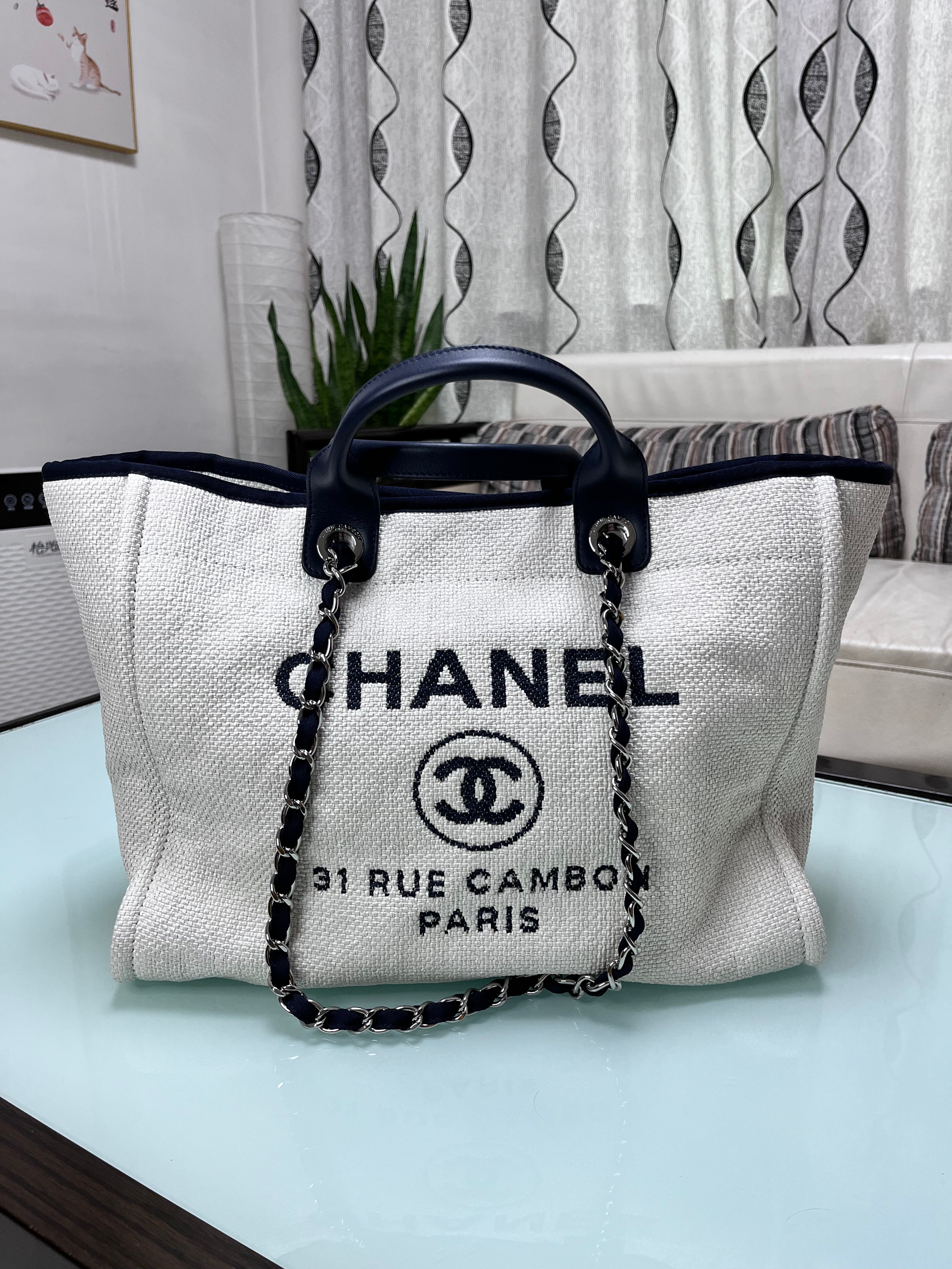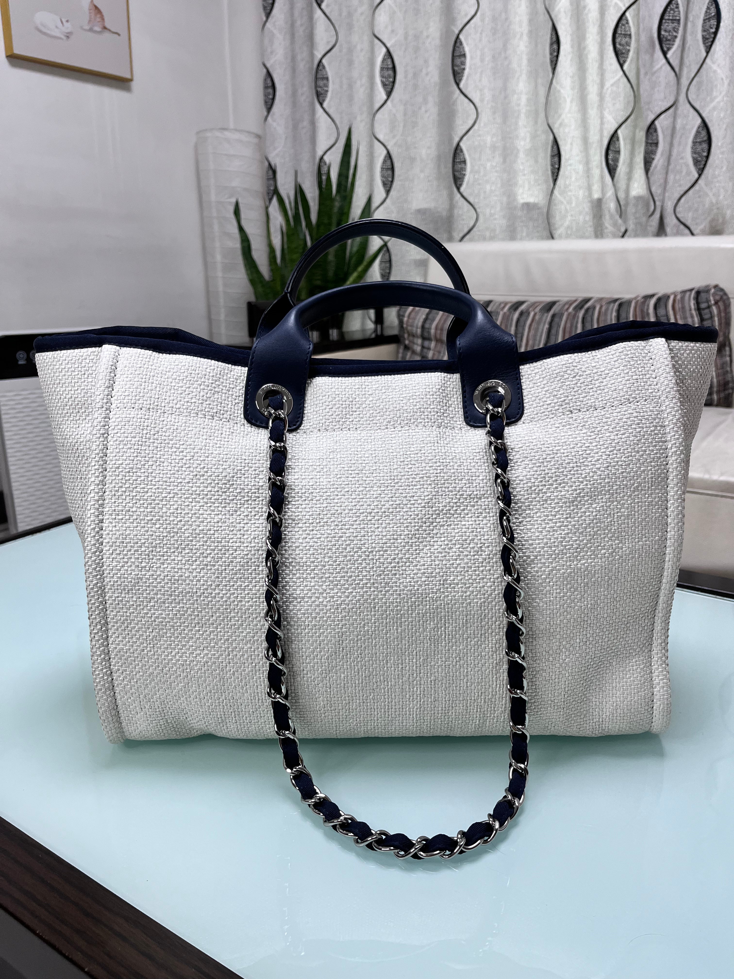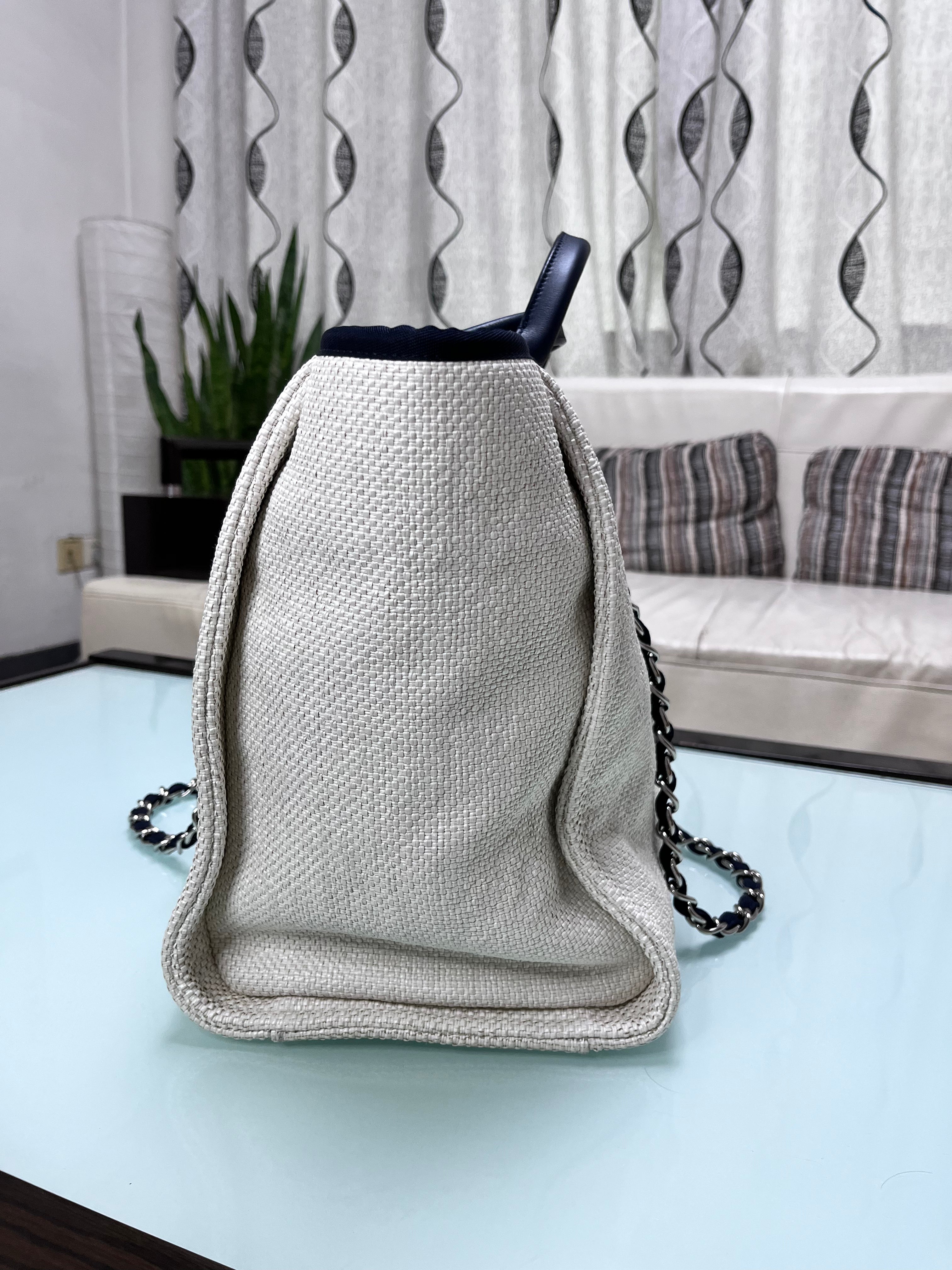 Chanel Deauville Whire Tote bag with top handle and chain. Material is woven raffia like fabric. Strong and soft.Â