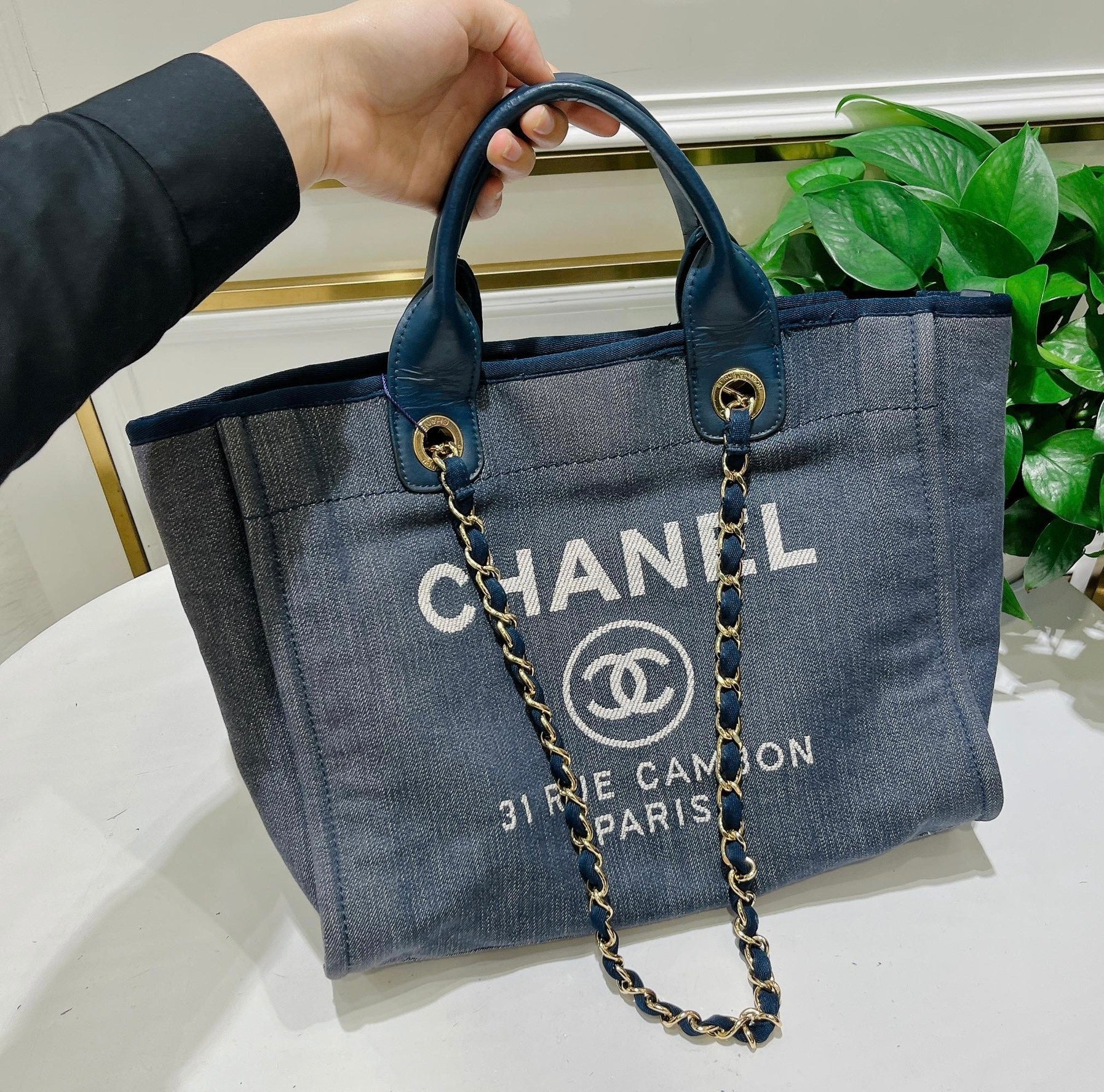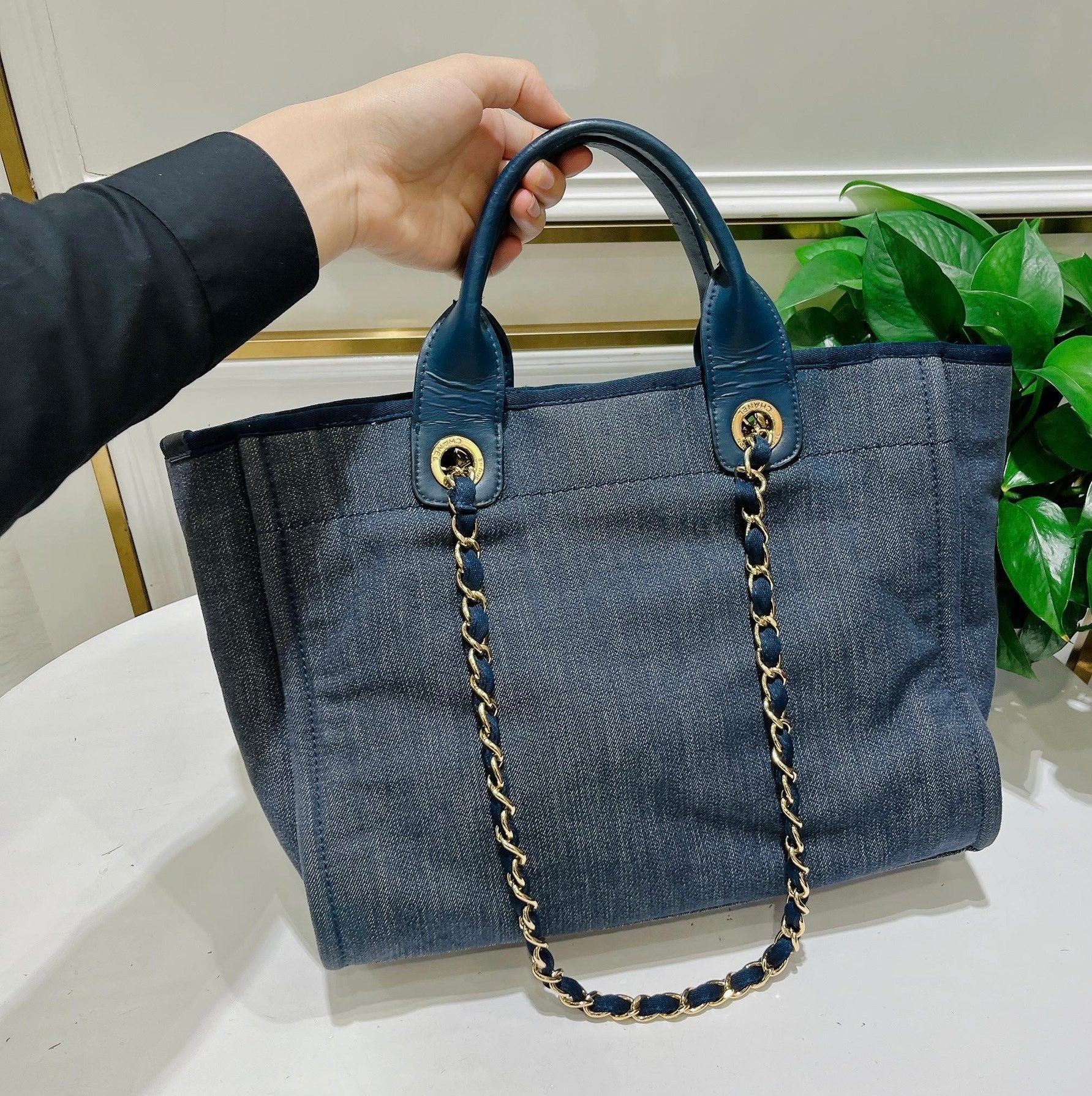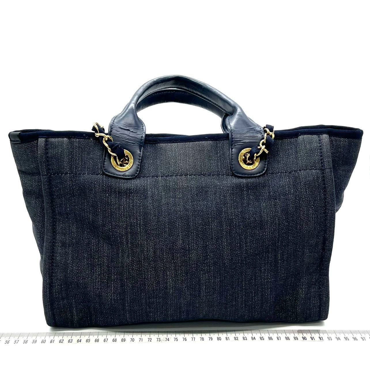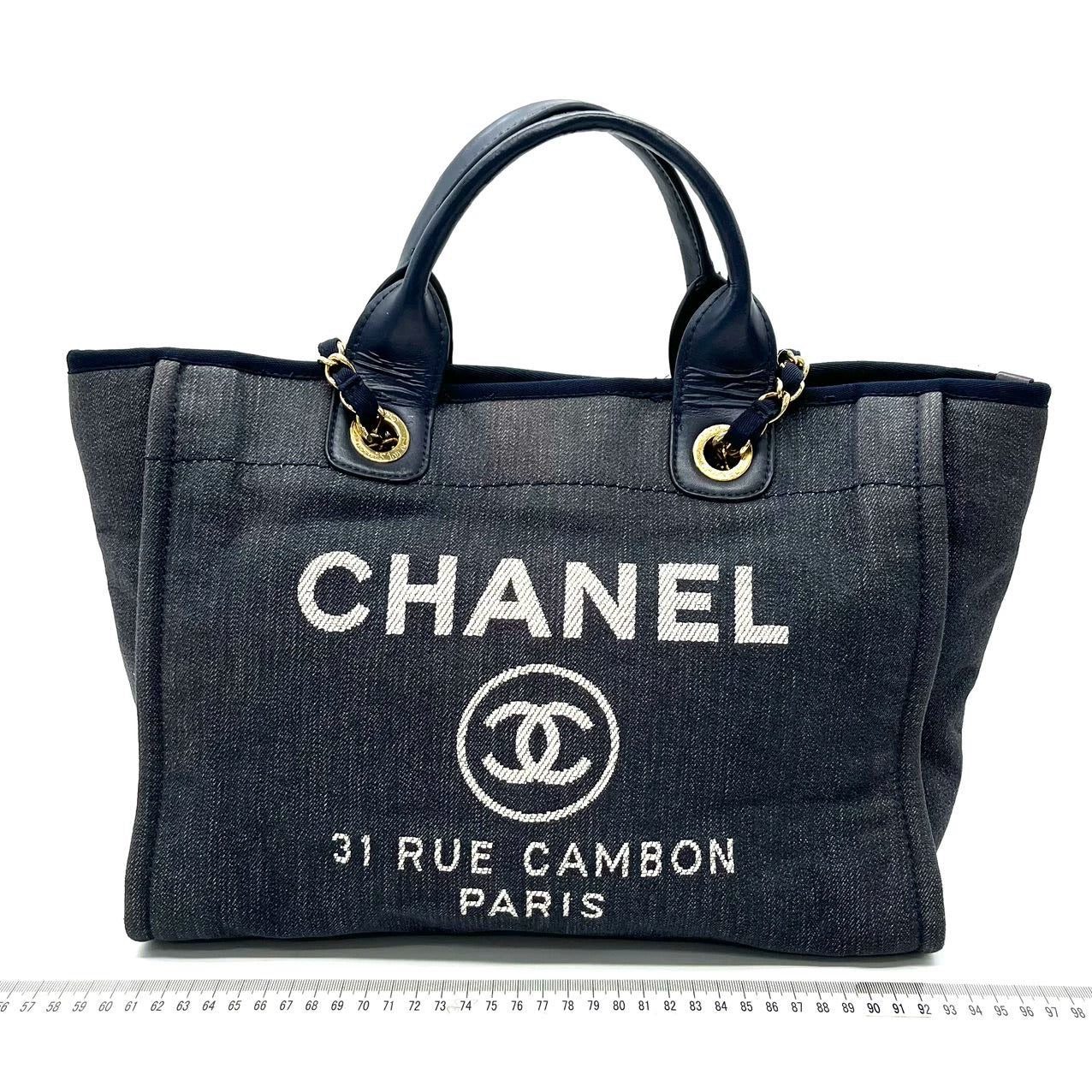 Chanel Deauville Denim Tote bag with top handle and chain.Â