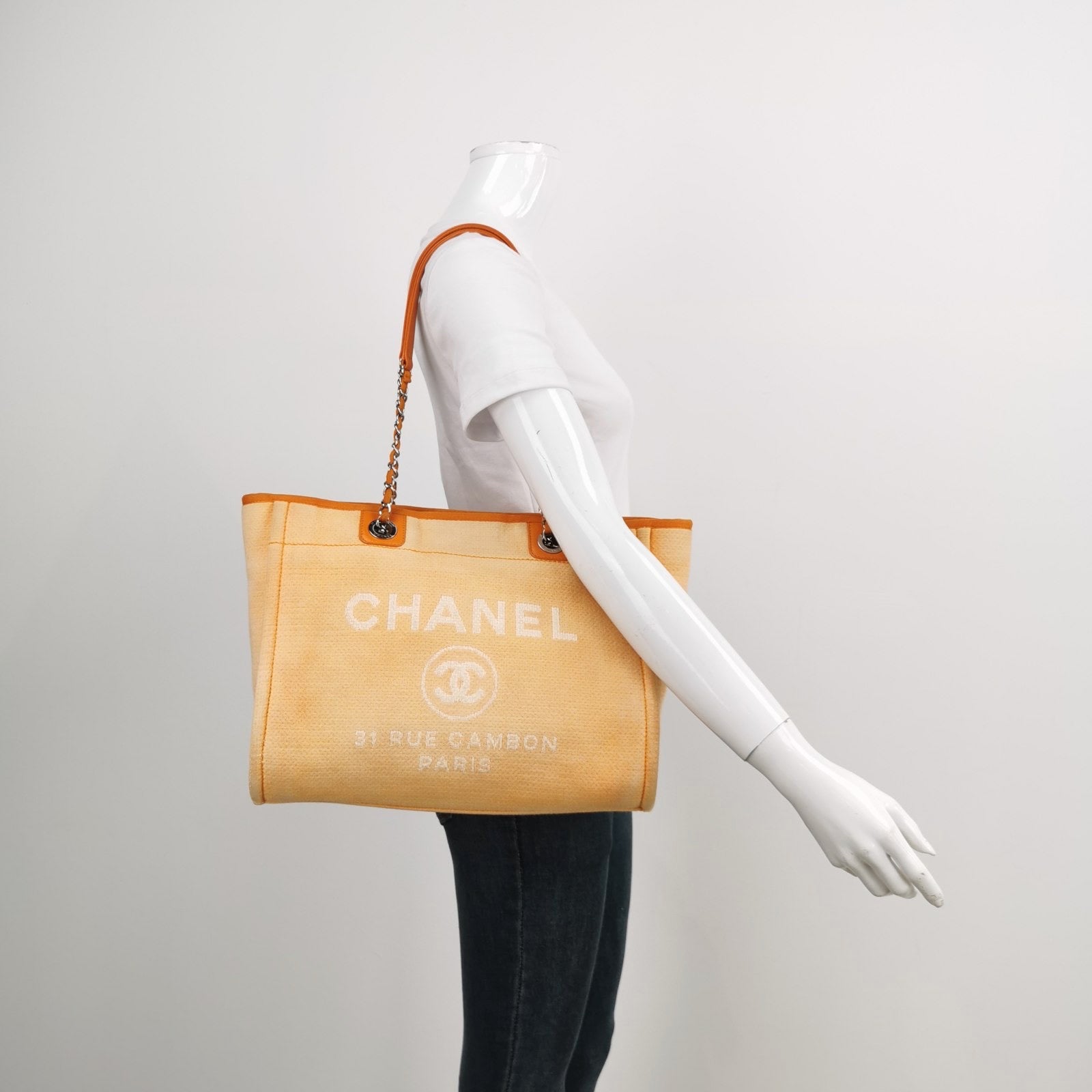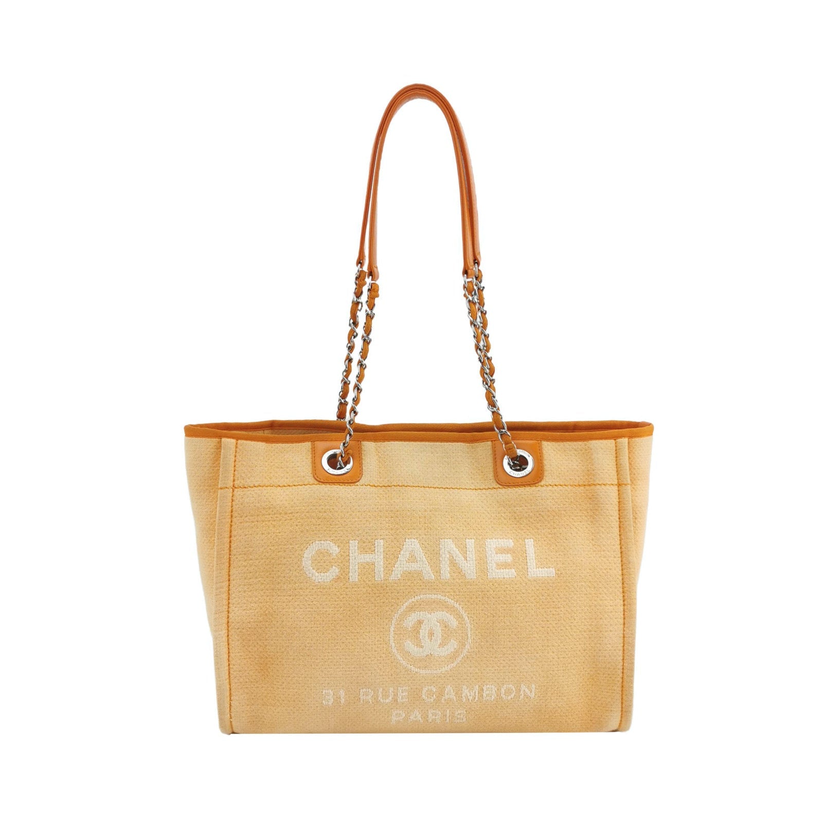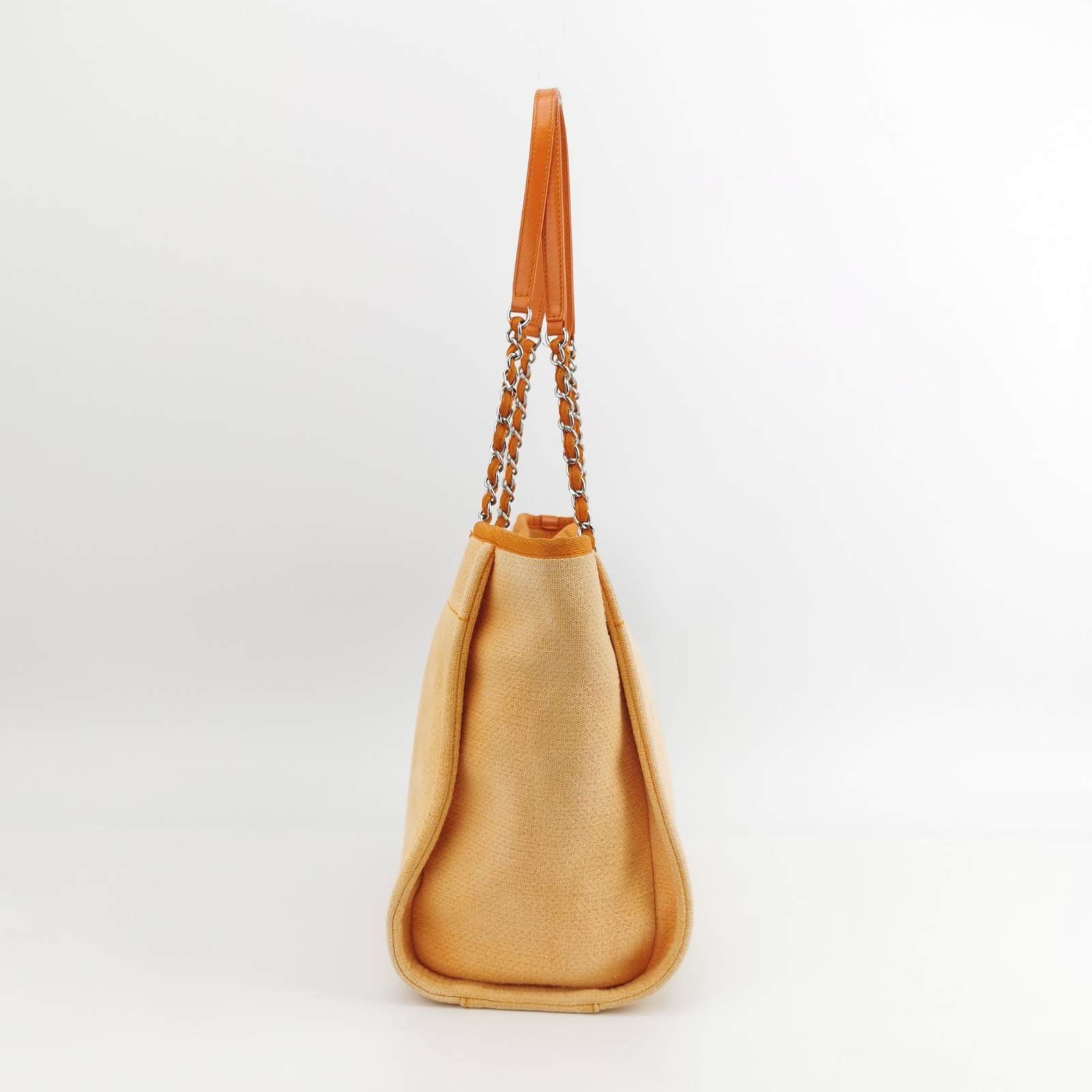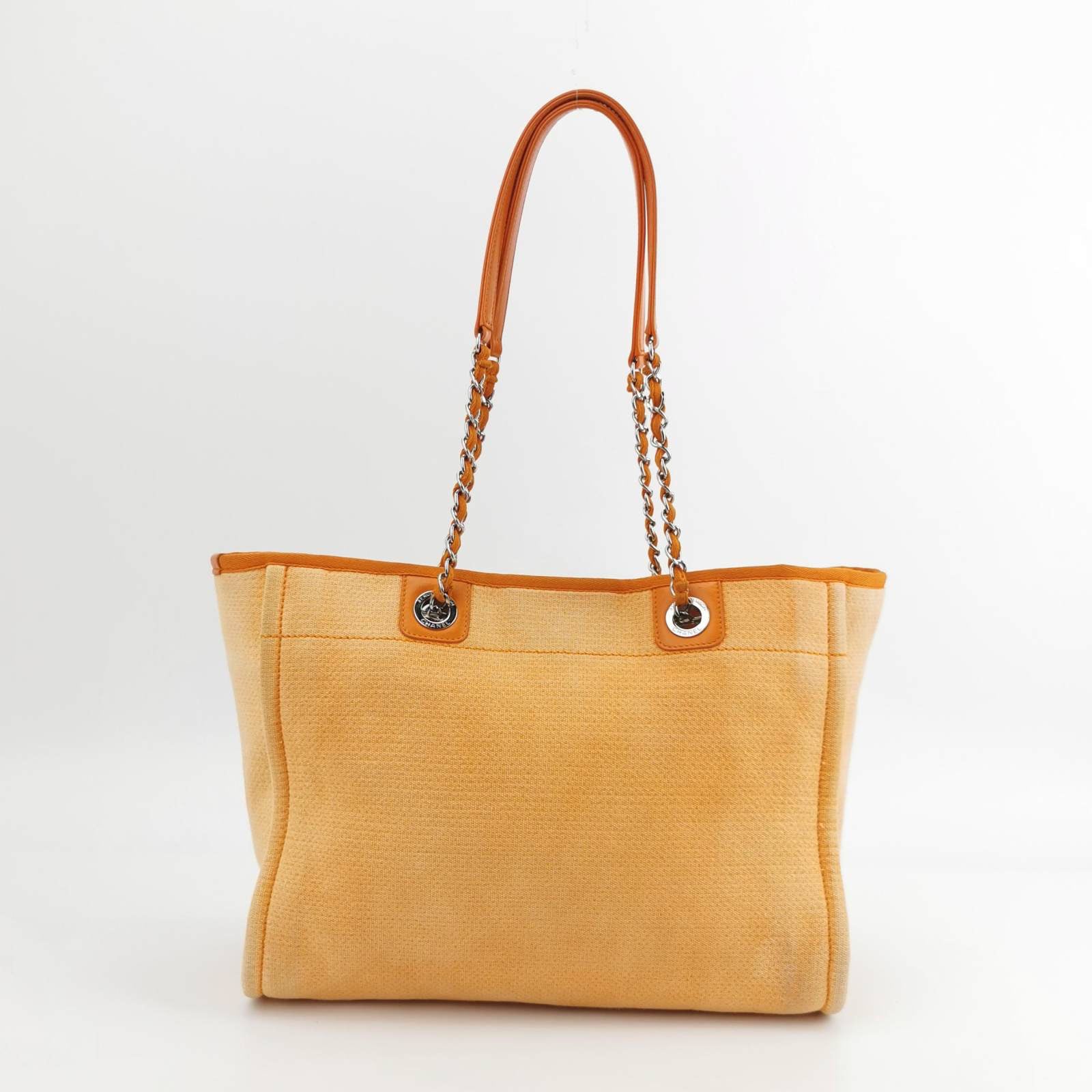 The Chanel Deauville Tote bag is a stylish accessory for everyday use. Crafted from durable orange denim, this tote is perfect for all season wear. Despite signs of use, this bag is in very good condition. Show off your effortless chic with the Chanel Deauville Tote.Â