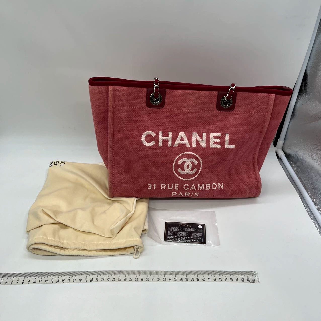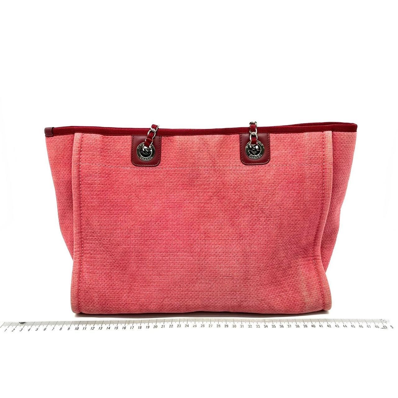 The Chanel Deauville Tote bag is a medium-sized stylish accessory for everyday use. Crafted from durable red denim, this tote is perfect for all season wear. The bag features a top handle and chain, and a 38cm-wide bottom for convenience. Despite signs of use, this bag is in very good condition. Show off your effortless chic with the Chanel Deauville Tote.