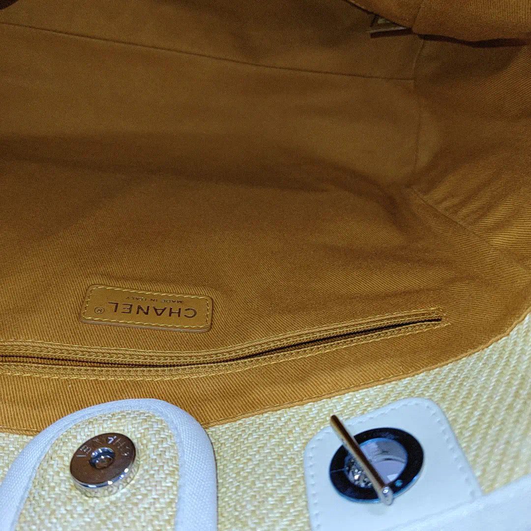 This is the small size measuring 33cm wide at the bottom. It features a metalasse chain strap. It is fairly light, weighing just 700g, it is your perfect go to beach bag or summer bag.Â