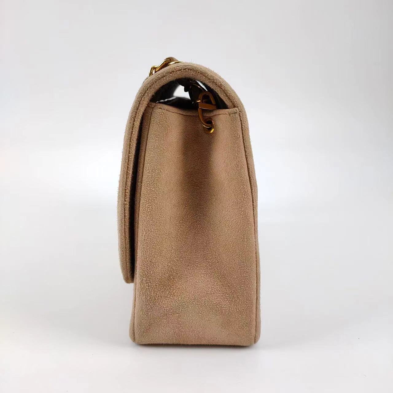 The Chanel Diana Bag Medium Suede Beige with 24k Gold Plated Hardware is crafted with exquisite attention to detail. Its high-grade suede leather and beige hue make for timeless beauty, while its 24k gold-plated hardware offers a subtle, sophisticated shine. Its long metellase chain allows for comfortable shoulder or crossbody wear, and it drops elegantly around the hip area when carried on one shoulder.