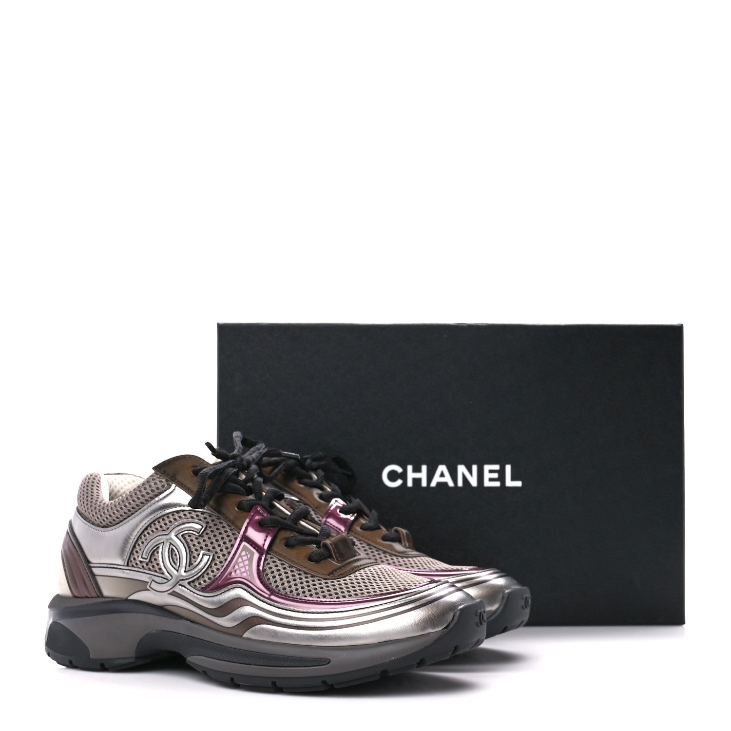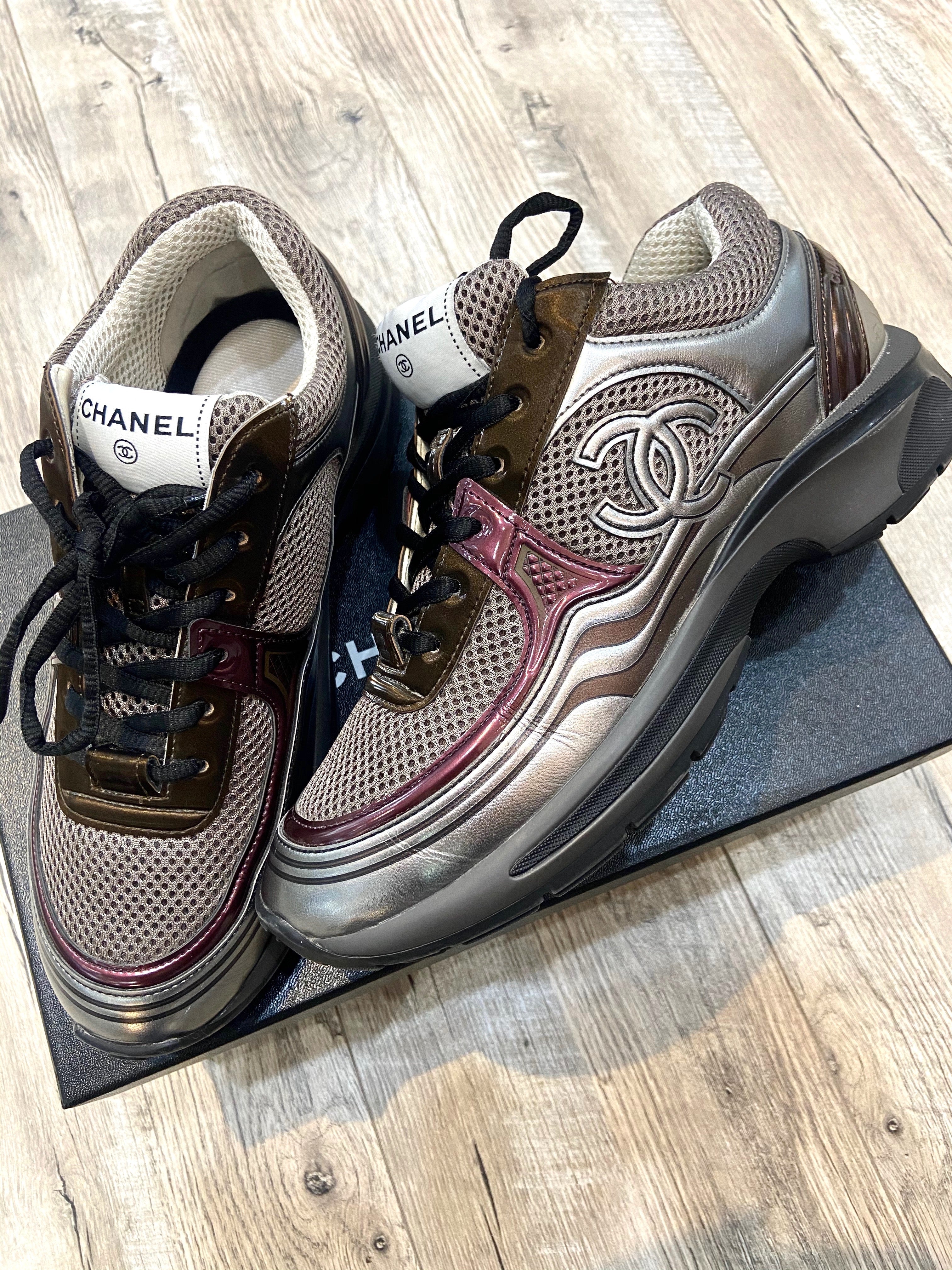 These Stunning Sneakers are Crafted of Laminated fabric with Grey and Silver Calfskin leather. The shoes feature black shoelaces, black soles, and Chanel CC logos on one side.