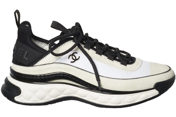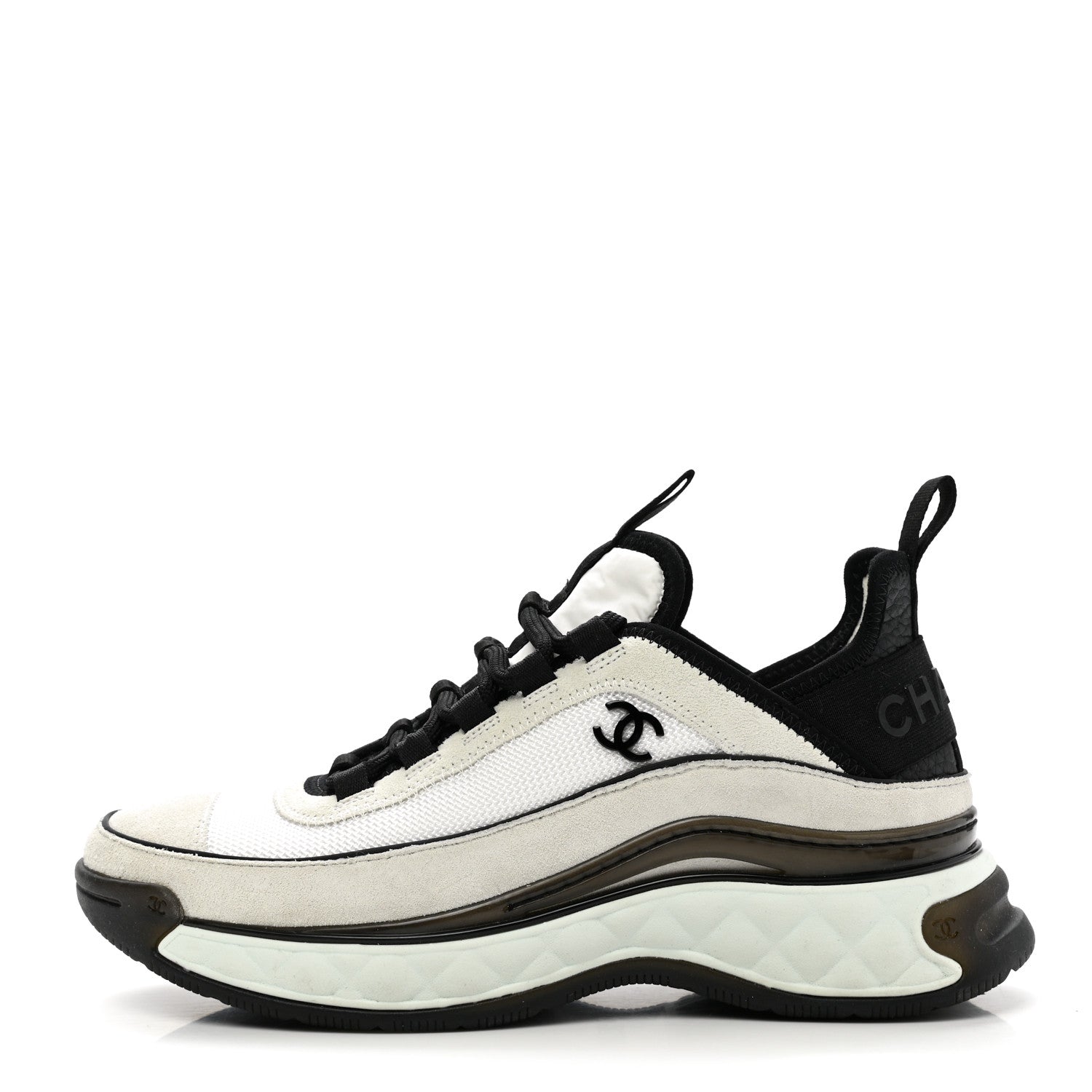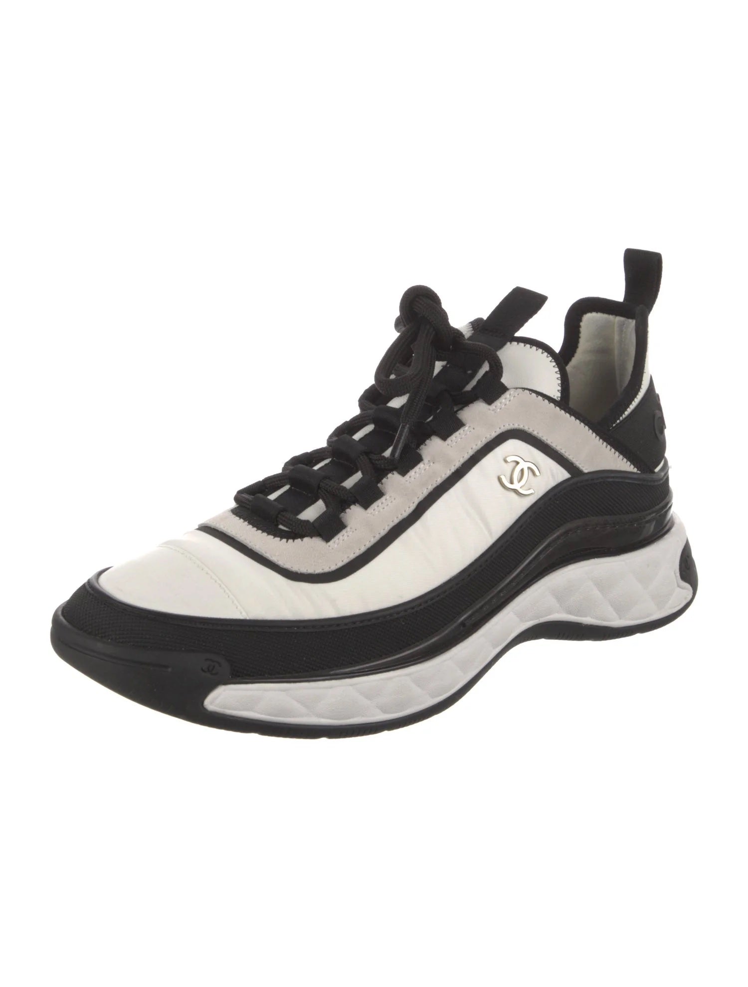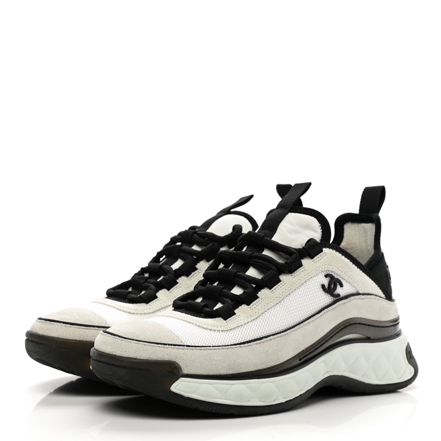 These Stunning Sneakers are Crafted of White fabric, Ivory suede, white Calfskin leather, and had black accents with a gold Chanel CC on each shoe.