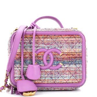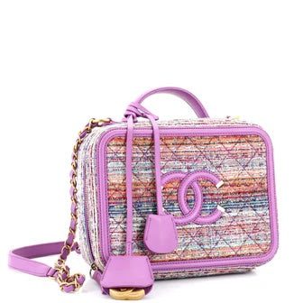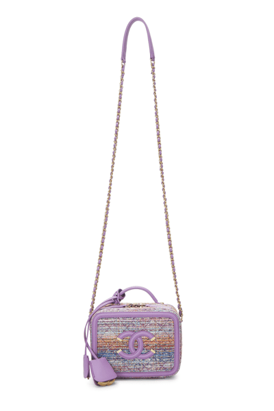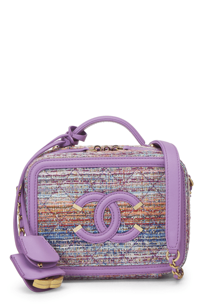 The exterior is crafted in multicolor quilted tweed, featuring purple leather trim and finished with Filigree ‘CC’ logo appliqué on the front. In addition to a leather top handle.