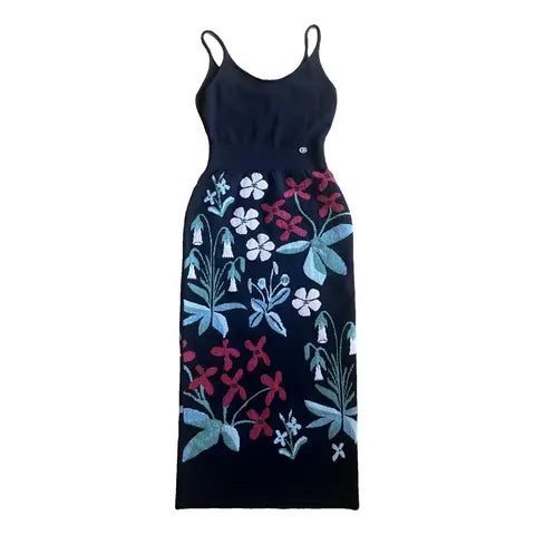 The dress features a sleek black top with delicate, thin shoulder straps that exude Timeless sophistication. Flowing into a long, maxi-style the design showcases a mesmerizing floral paisley print interwoven with subtle CC logos, embodying Chanel’s signature touch of refinement.