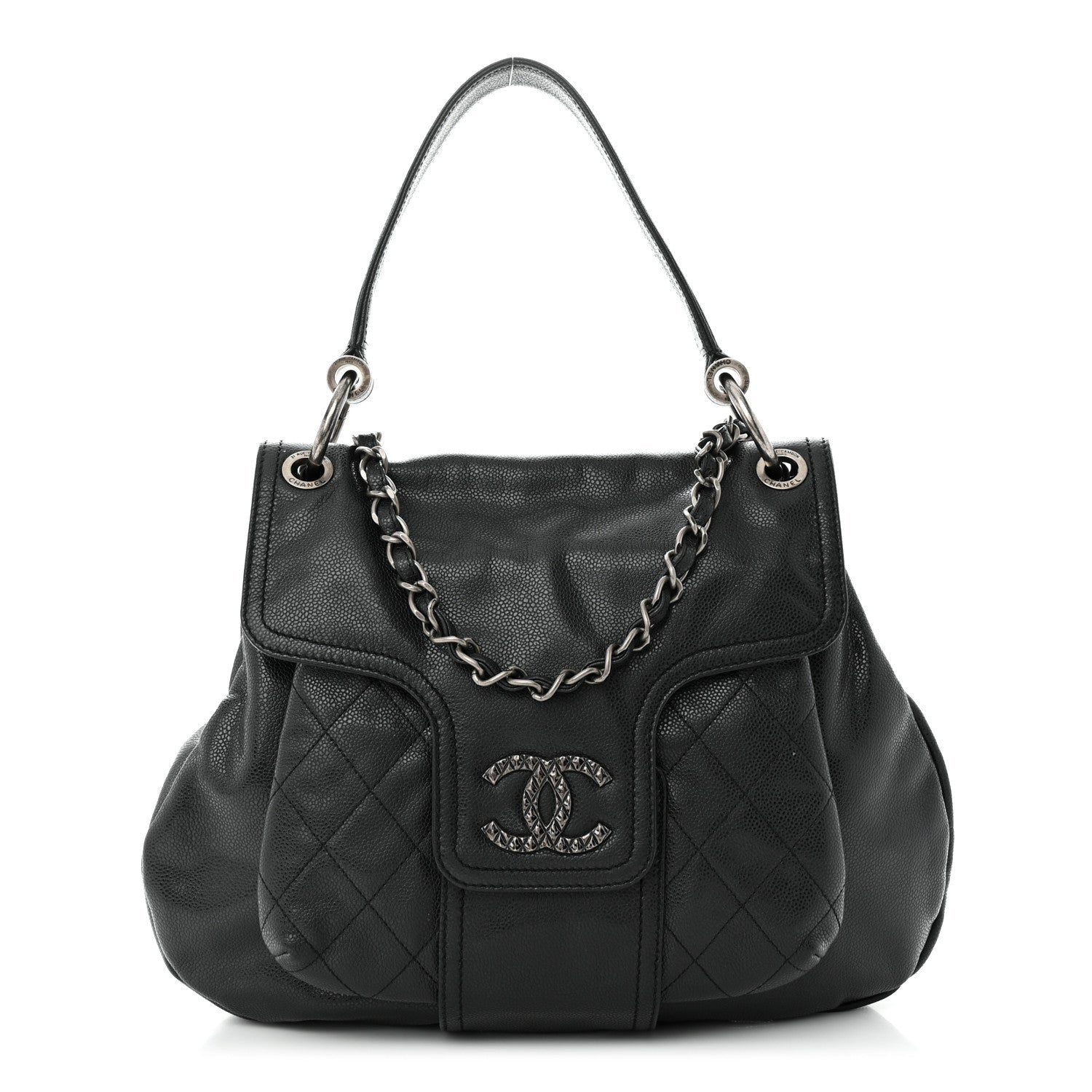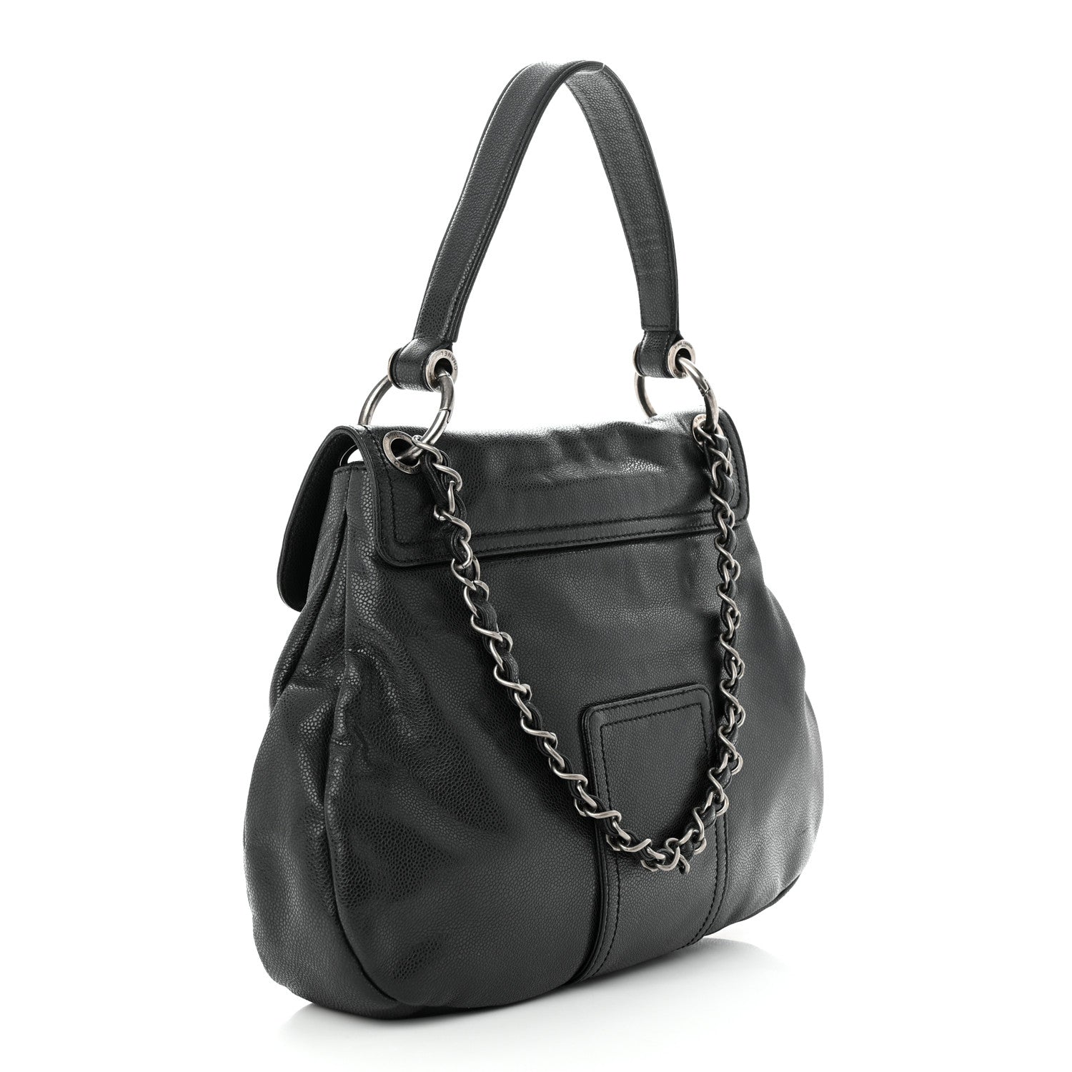 This Stunning Flap Bag is crafted of Glazed Caviar leather in Dark Grey with a silver undertone. The bag features a leather strap handle with ruthenium links, a matching chain-link strap threaded with leather, and a fitted crossover flap with a quilted textured ruthenium Chanel CC magnetic closure. The flap opens to a silver satin interior.Â