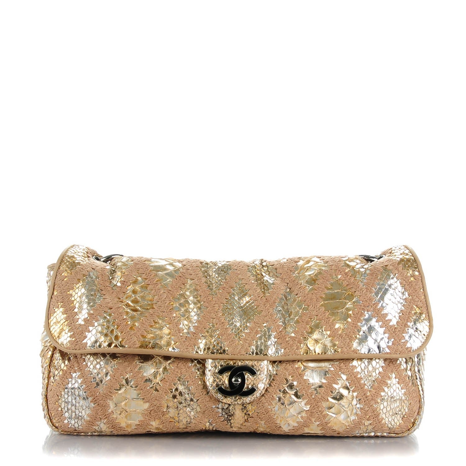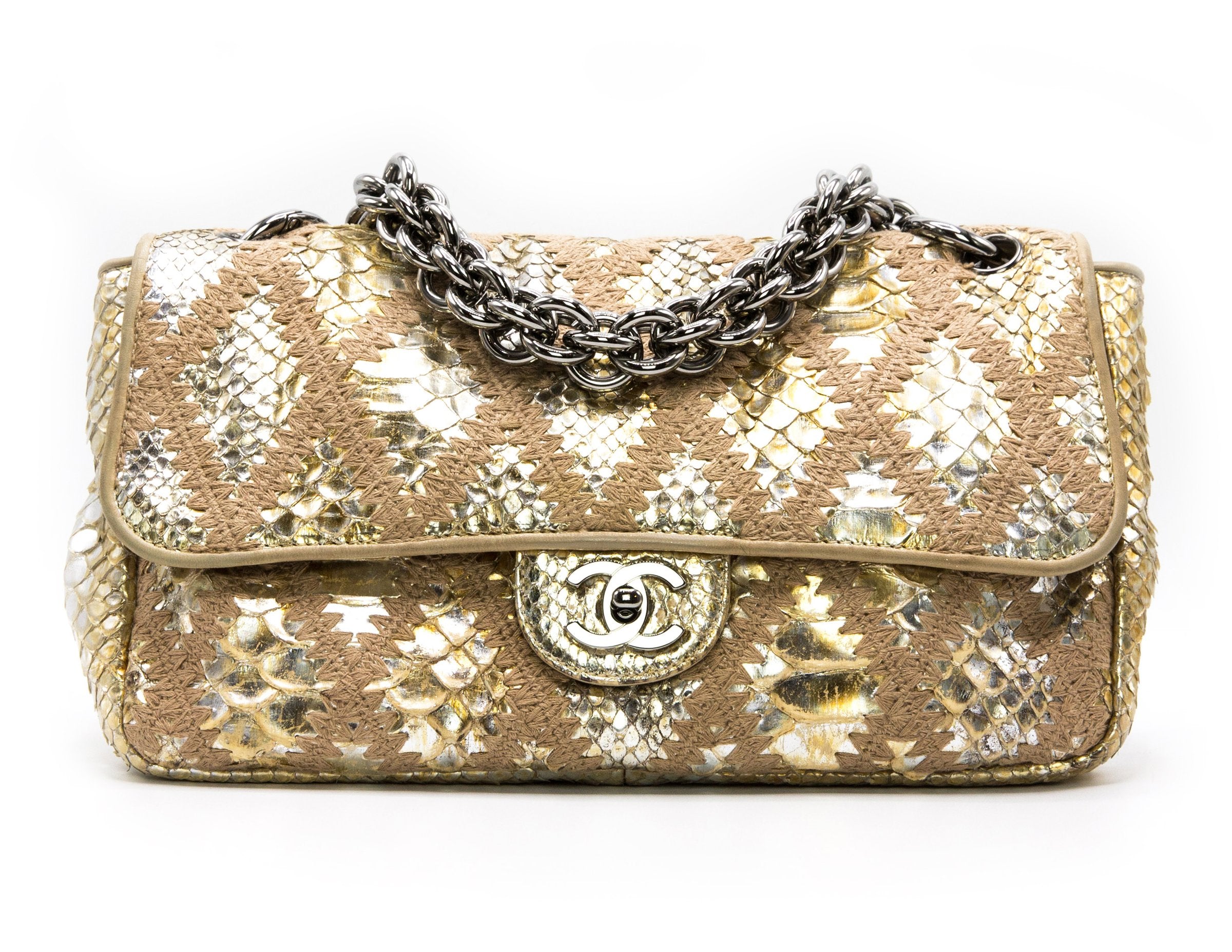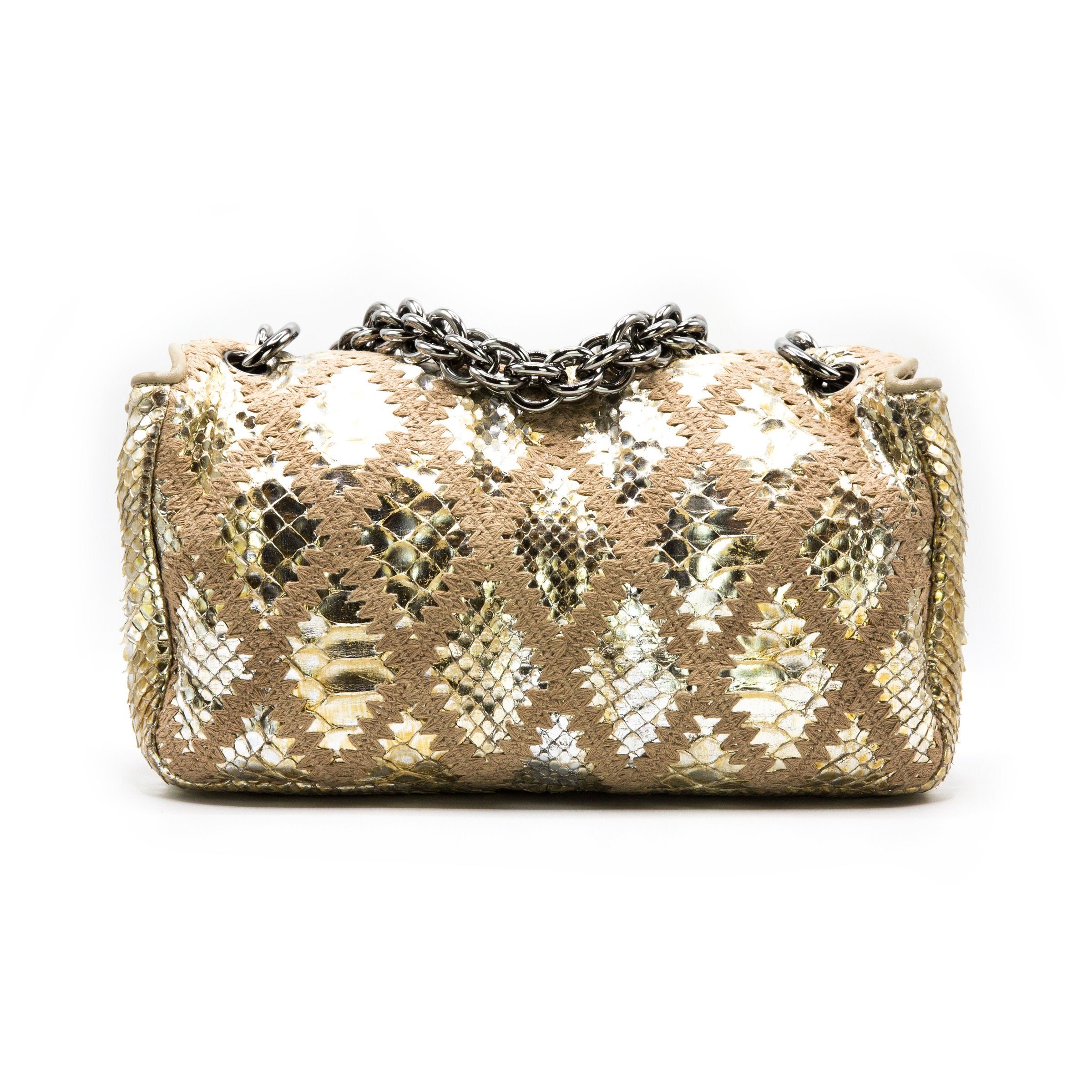 CHANEL METALLIC GOLD PYTHIN CROCHET FLAP BAG