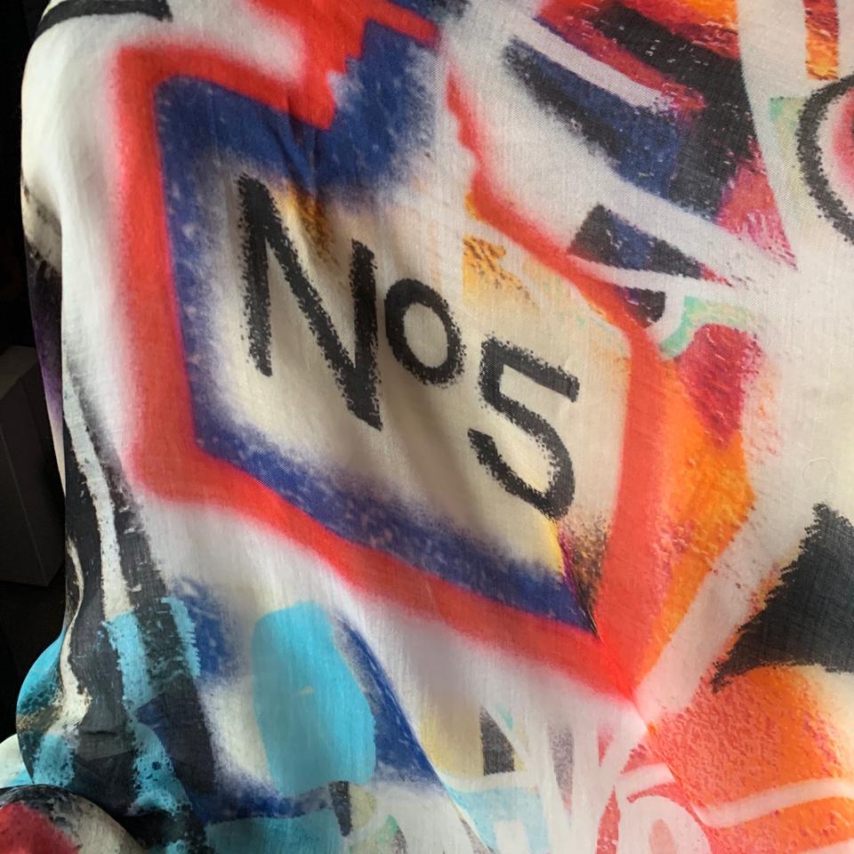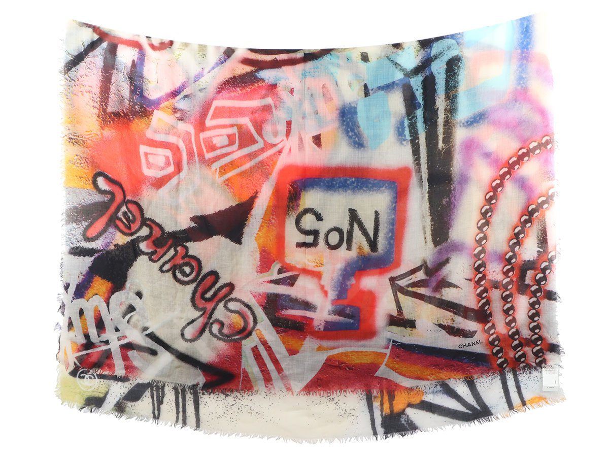 Street style goes high fashion with Chanelâs Multicolor Graffiti Stole! Made of a lightweight semi-sheer 100% cashmere, itâs a graffiti print in cream, black, red, purple, and orange.Â