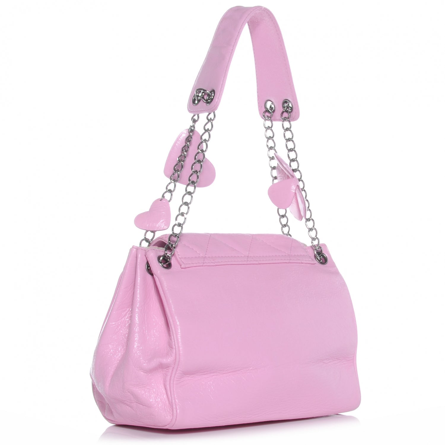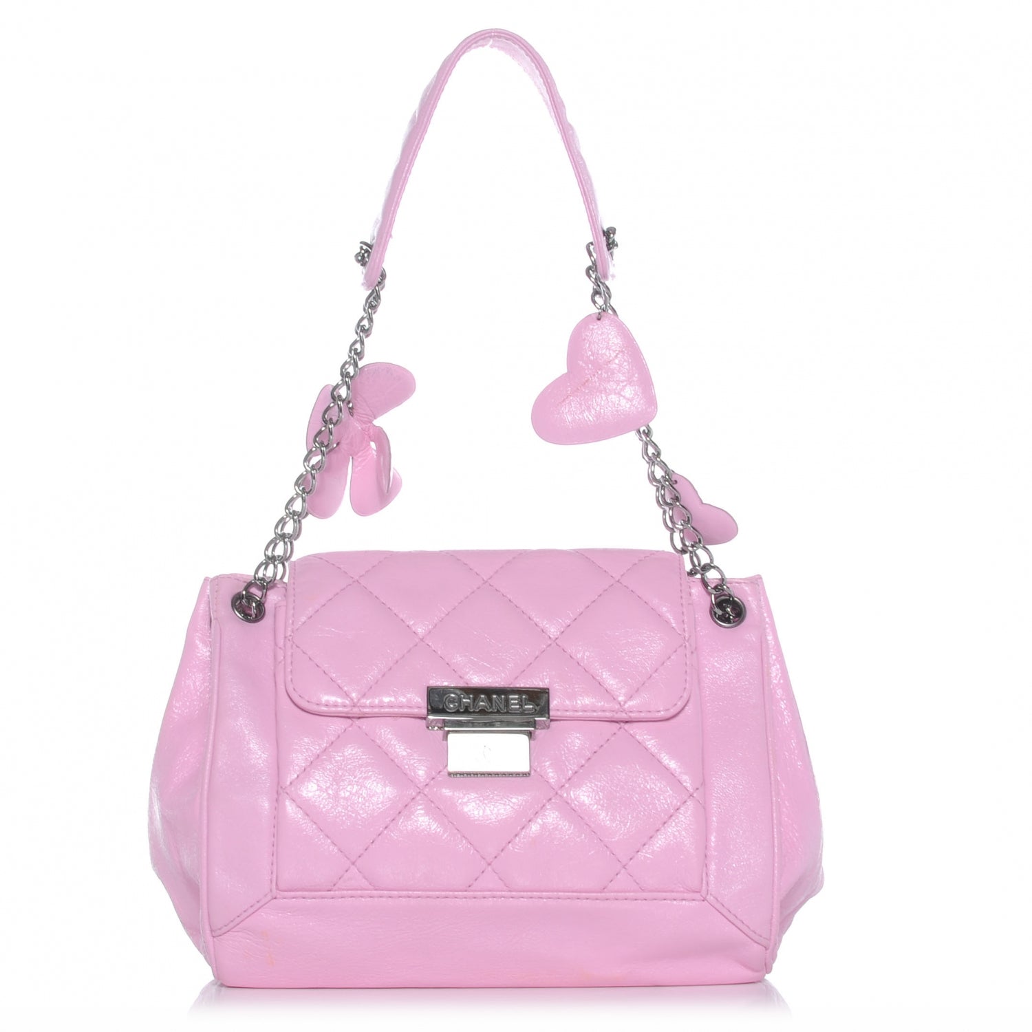 This chic yet playful shoulder bag is crafted of calfskin leather with a quilted flat and front detail. The bag features silver chain links with a shoulder pad shoulder strap with flower and heart leather charms attached with a frontal silver Chanel press lock. This opens to a white logo fabric multiple compartment interior.