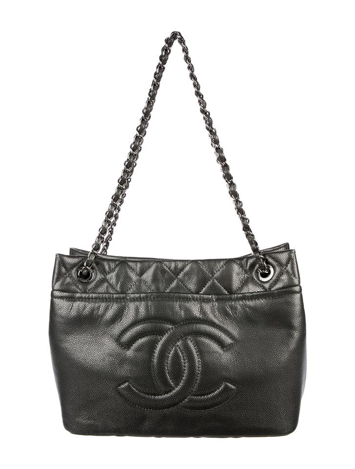 This bag is crafted of calfskin leather in black with silver-tone hardware and a leather/chain-link strap. The exterior features a jumbo CC logo at front. The interior has a large main compartment in black fabric lining with a key chain lariat holder, two patch pockets, and one zip pocket.