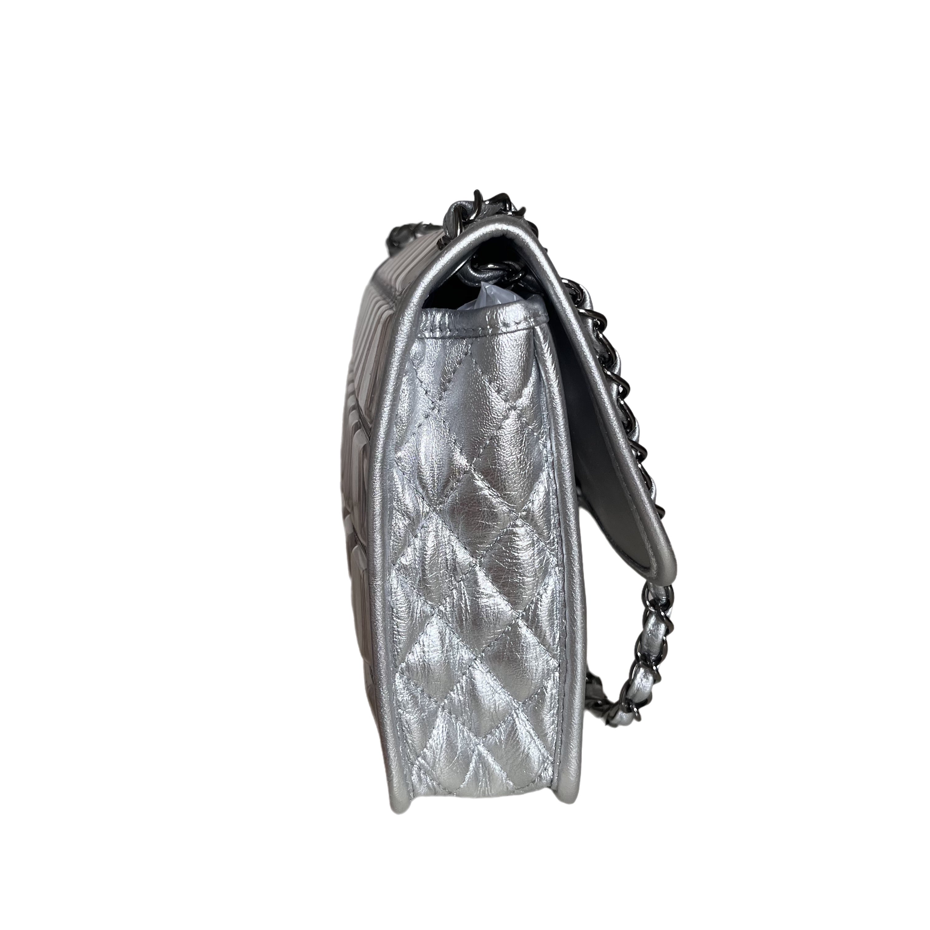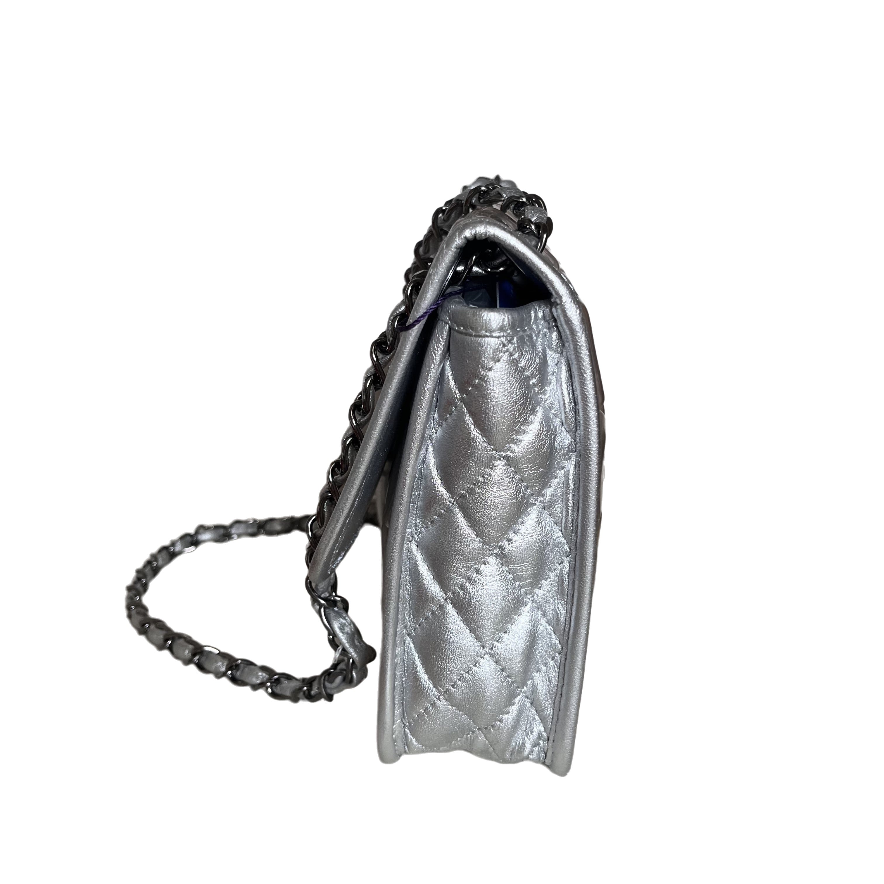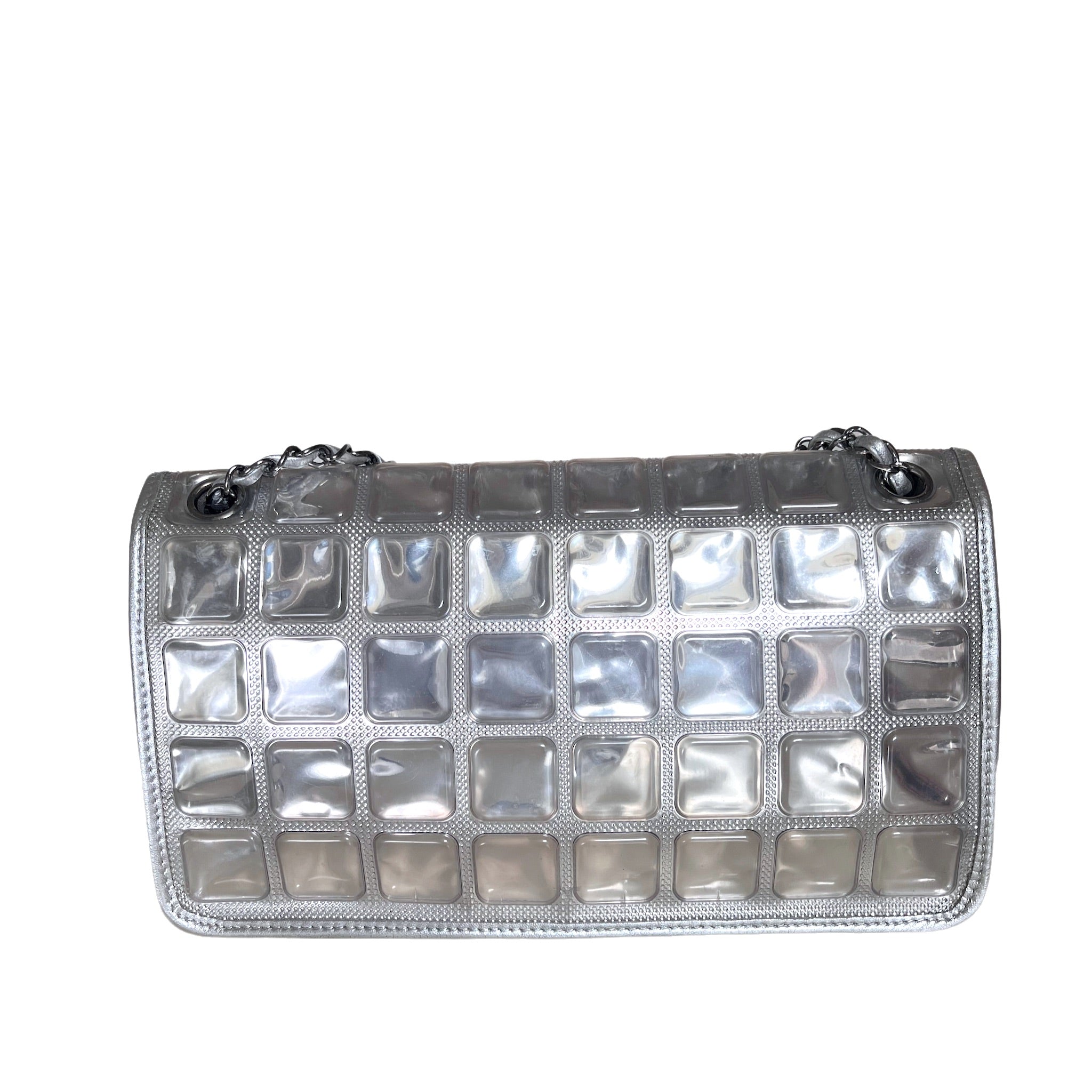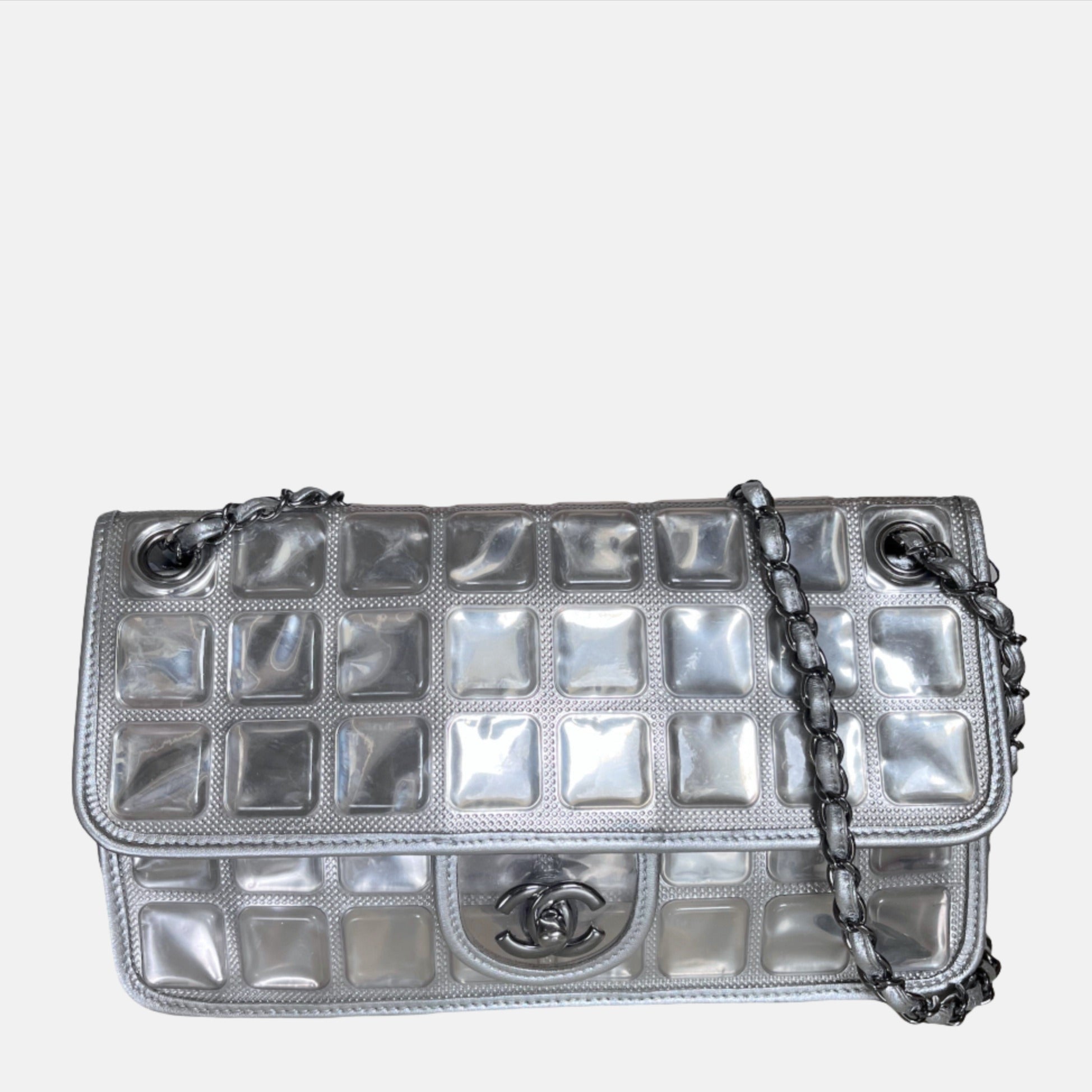 This charming collectible and highly sought after Chanel Ice Cube 2006-2008 is a stylish mix of classy and casual. Featuring a chain and leather strap, foldover top with twist-lock closure, and a square quilted finish, this bag is crafted from high-quality silver-tone PVC and leather and boasts a full lining, main internal compartment, internal zipped pocket, and internal logo patch. Silver-tone hardware adds a touch of sophistication to the textured style of this must-have accessory.
