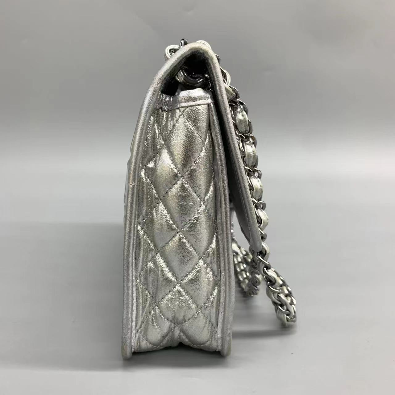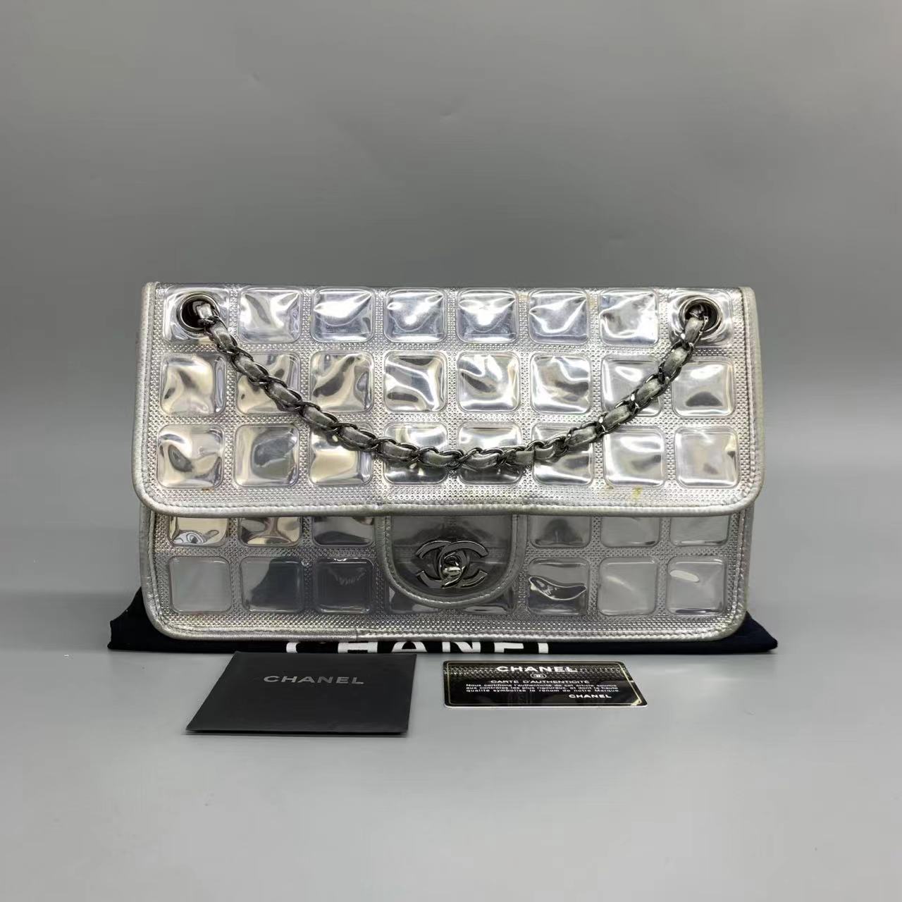 This charming collectible and highly sought after Chanel Ice Cube 2006-2008 is a stylish mix of classy and casual. Featuring a chain and leather strap, foldover top with twist-lock closure, and a square quilted finish, this bag is crafted from high-quality silver-tone PVC and leather and boasts a full lining, main internal compartment, internal zipped pocket, and internal logo patch. Silver-tone hardware adds a touch of sophistication to the textured style of this must-have accessory.