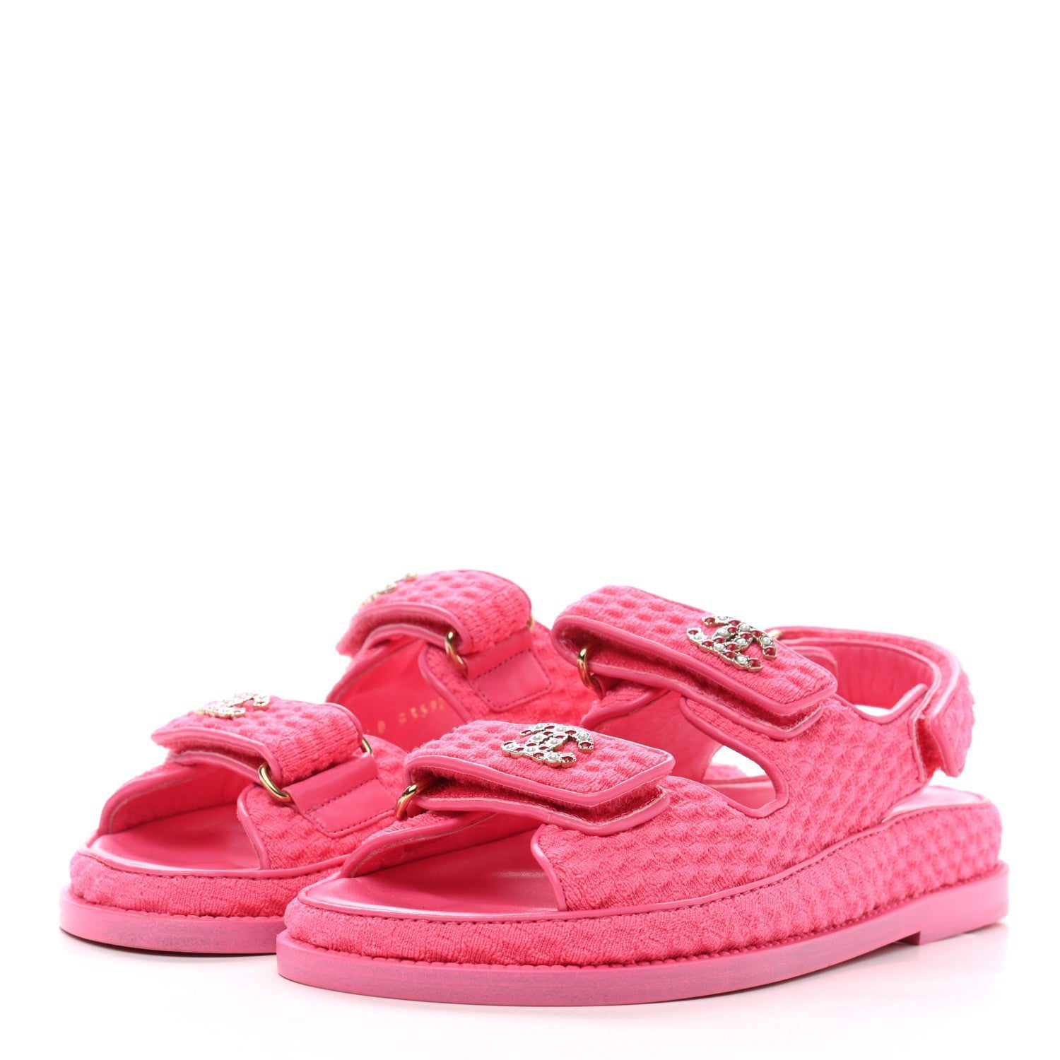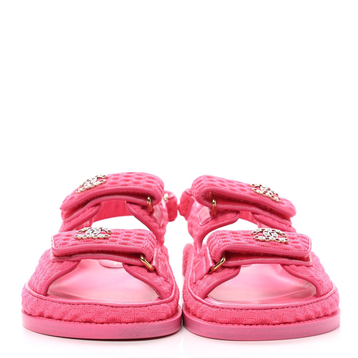 These sandals are crafted of pink knit fabric and feature velcro straps with an embellished gold CC logo with red resin and white pearls.