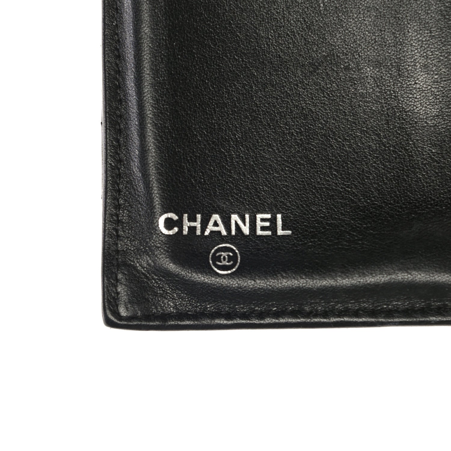 This stylish clutch wallet is crafted of luxurious lambskin quilted leather in black with a small silver Chanel CC on the front flap. The wallet opens to a black leather and fabric interior with a card slot panel, a central zipper compartment, patch pockets, and a bill compartments.
