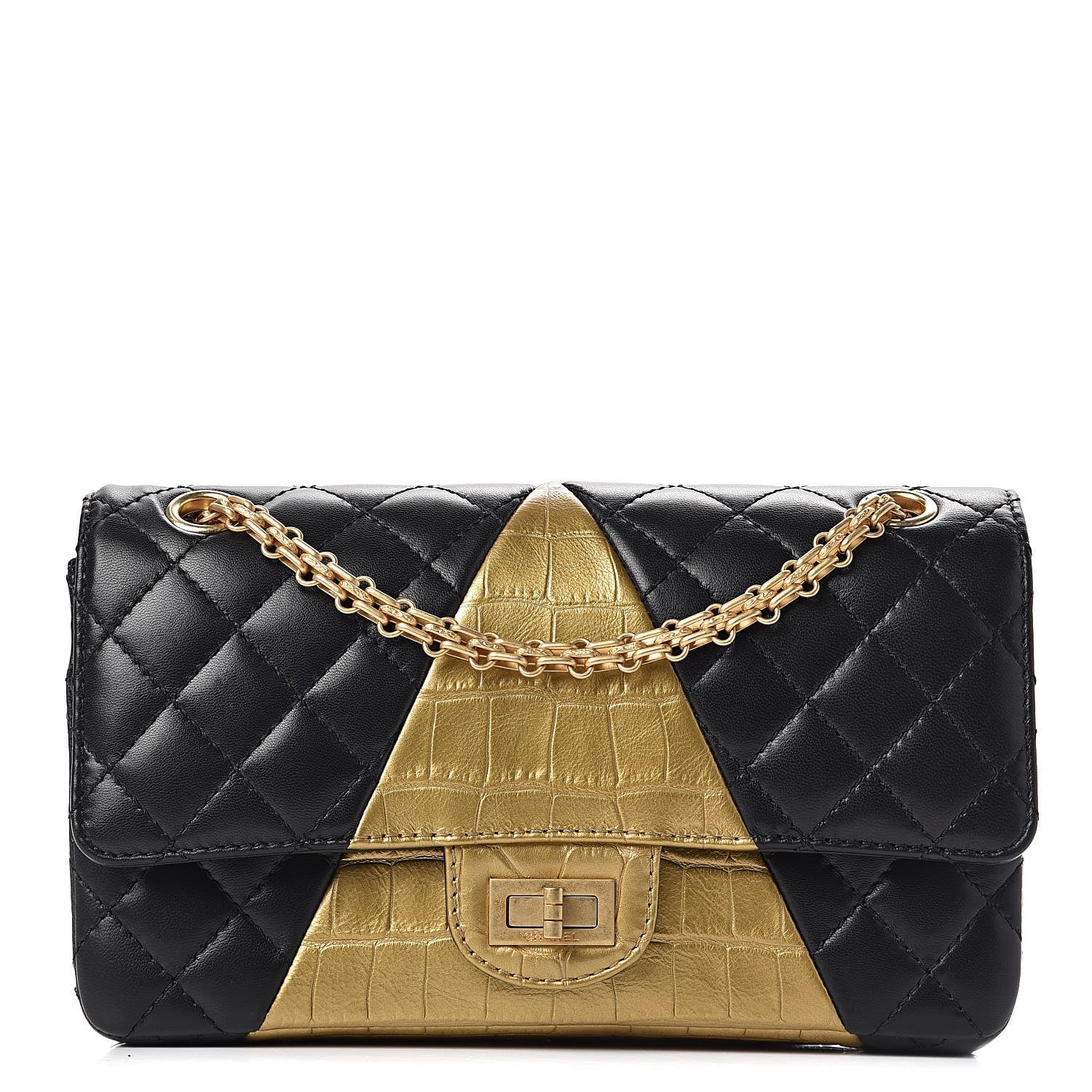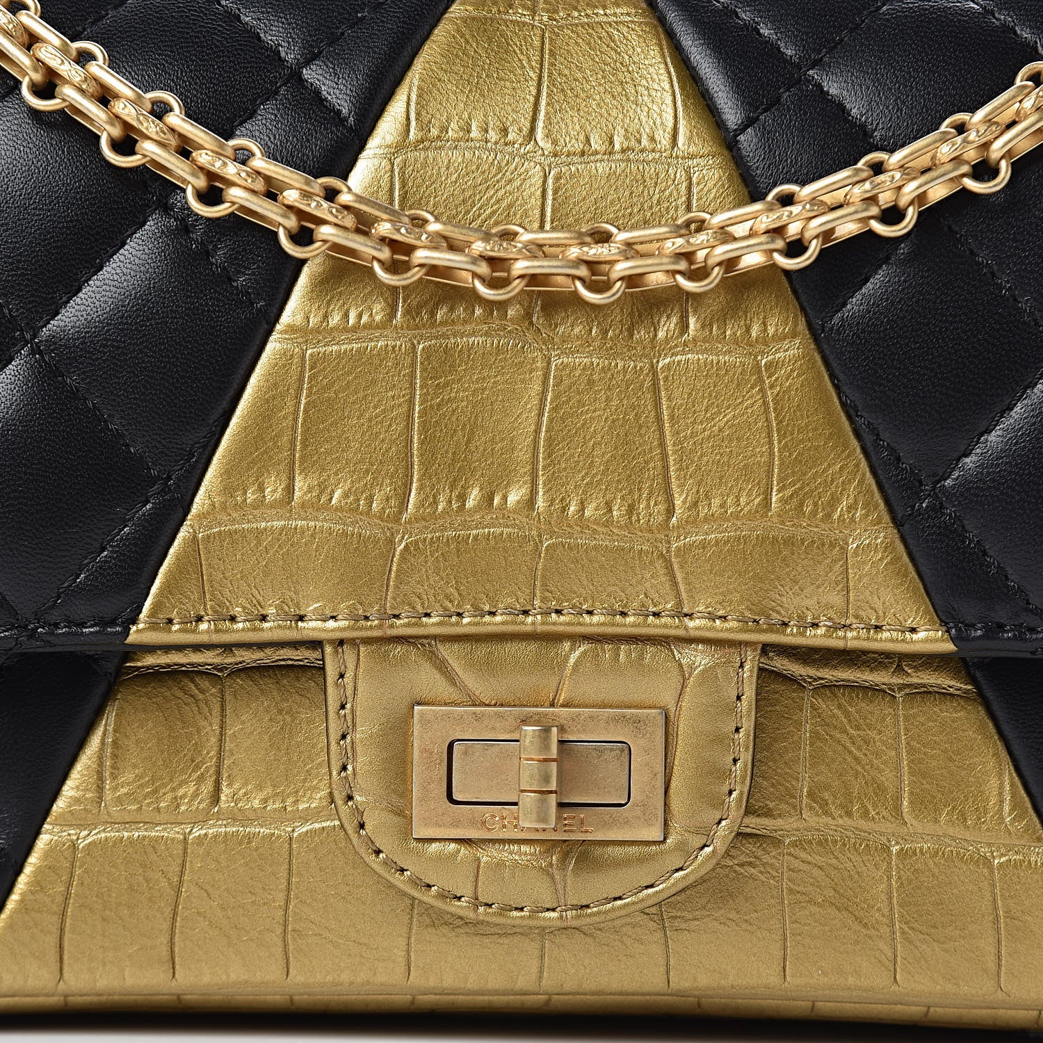 CHANEL Lambskin Metallic Calfskin Crocodile Embossed 2.55 Crocodile Reissue 225 Flap Black Gold.