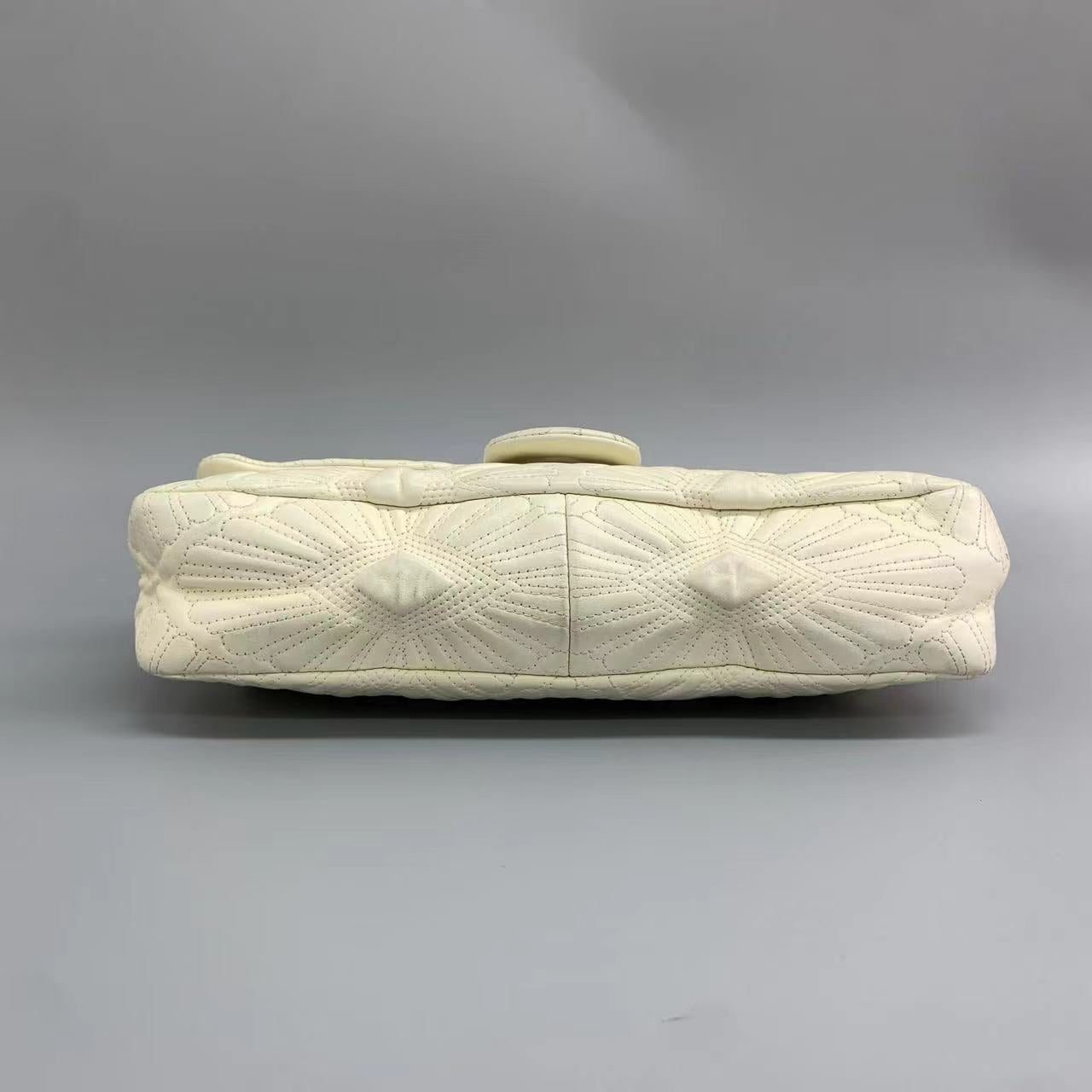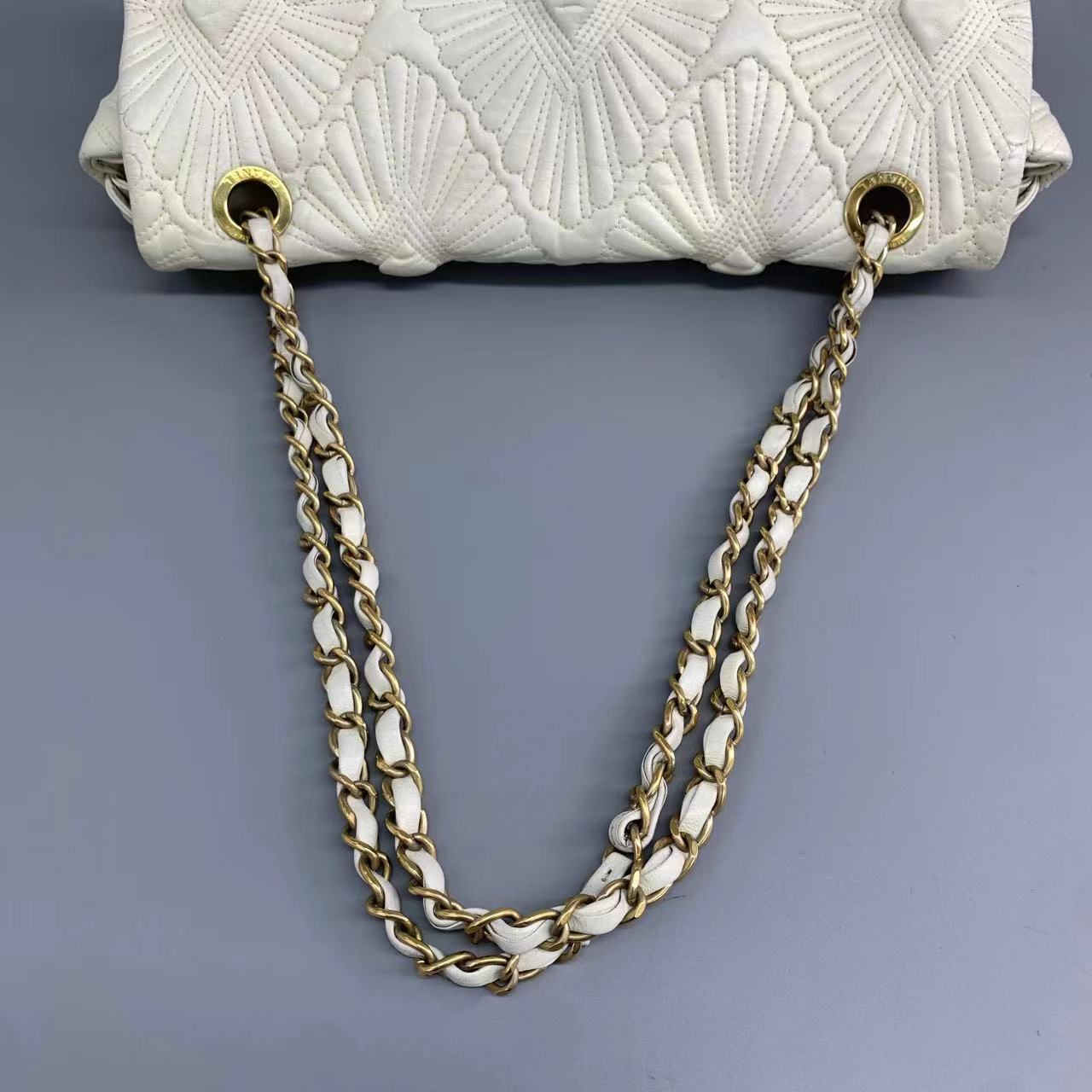 This item is a genuine CHANEL Lambskin Quilted Ca D’Oro Flap in Off White. The elegant handbag bag is exquisitely crafted from soft lambskin leather and showcases intricate embroidery. It boasts shoulder straps made of gold chain links with leather threading, as well as a front flap adorned with a gold-tone Chanel CC turn lock.Â