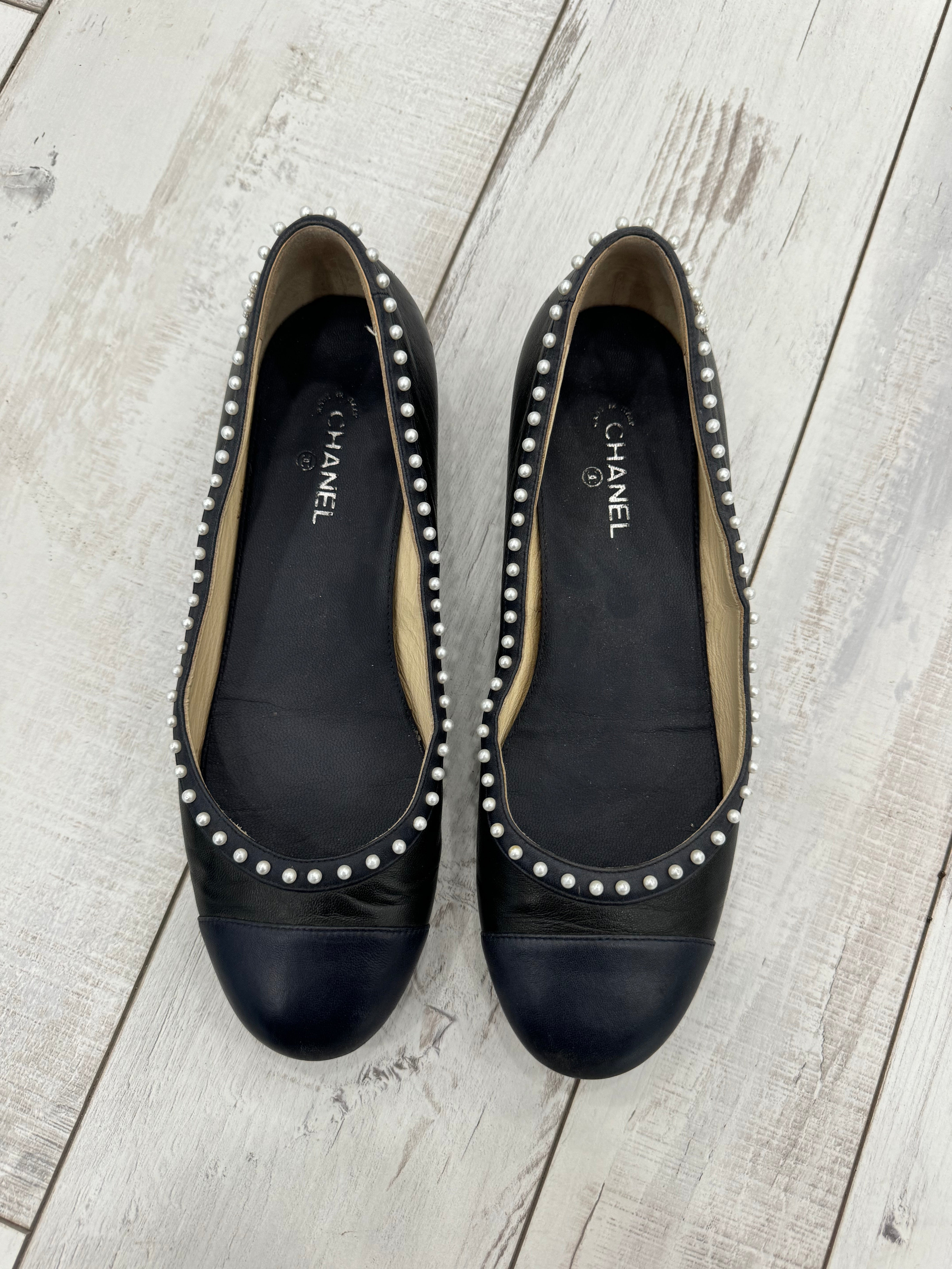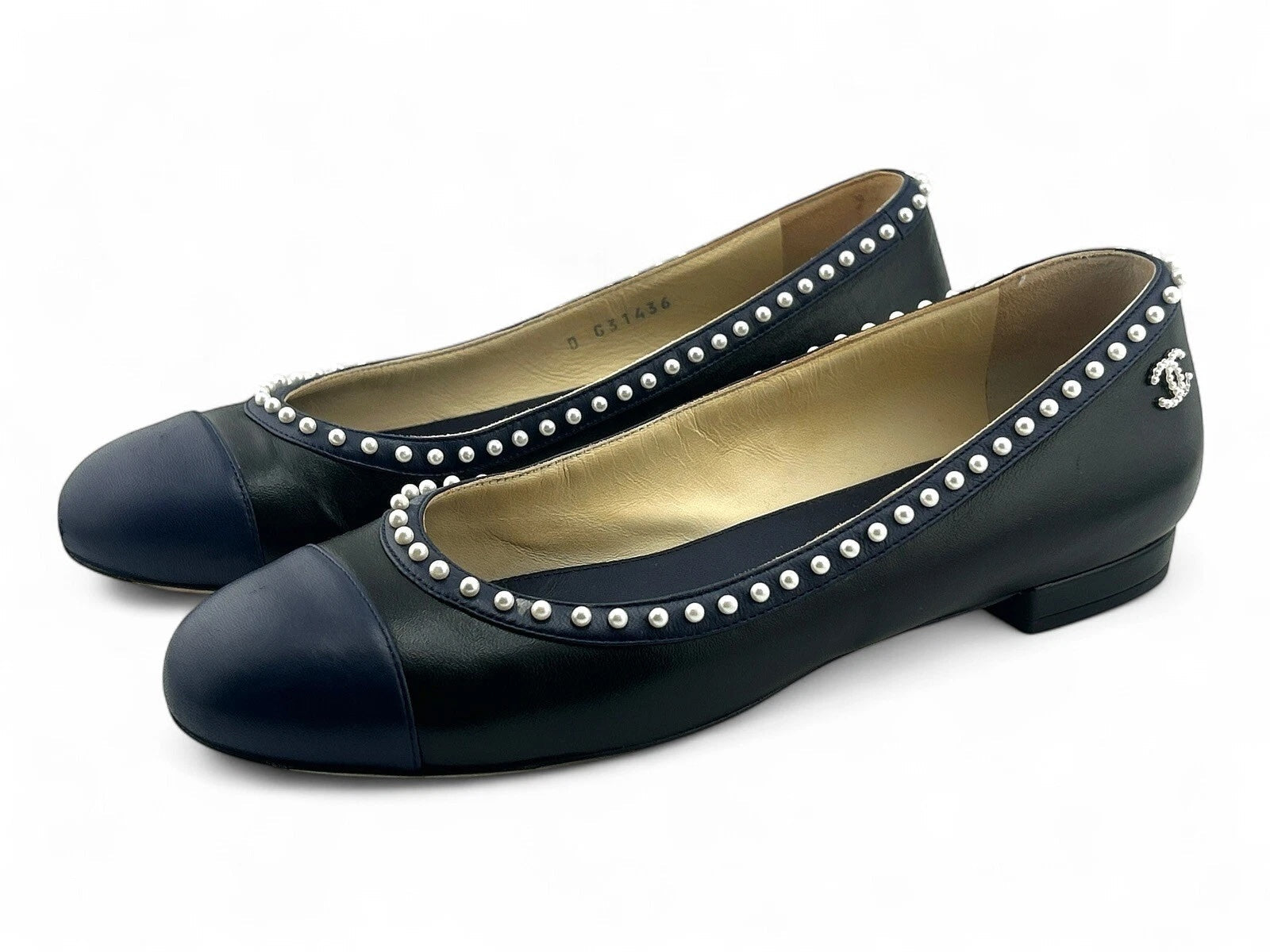 From the iconic Cruise 2016 Collection by Karl Lagerfeld, these elegant Chanel ballet flats are crafted from supple navy lambskin leather and black satin. The classic round cap toe silhouette is elevated by silver-tone interlocking CC logos and delicate faux pearl beading, adding a touch of timeless Parisian charm.