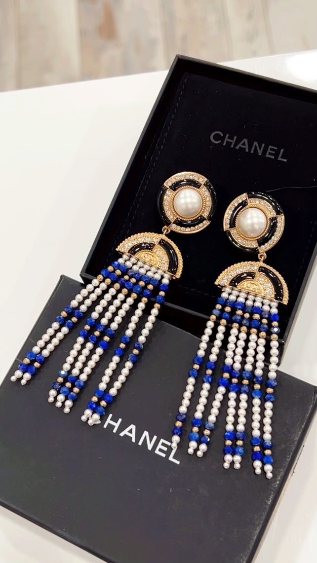 CHANEL LAPIS LAZULI FAUX PEARL & STRASS CC CHANDELIER EARRINGS