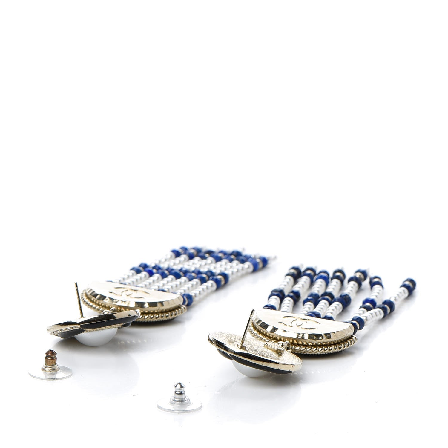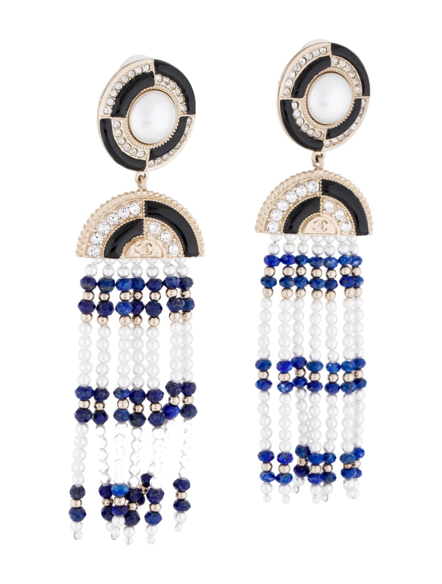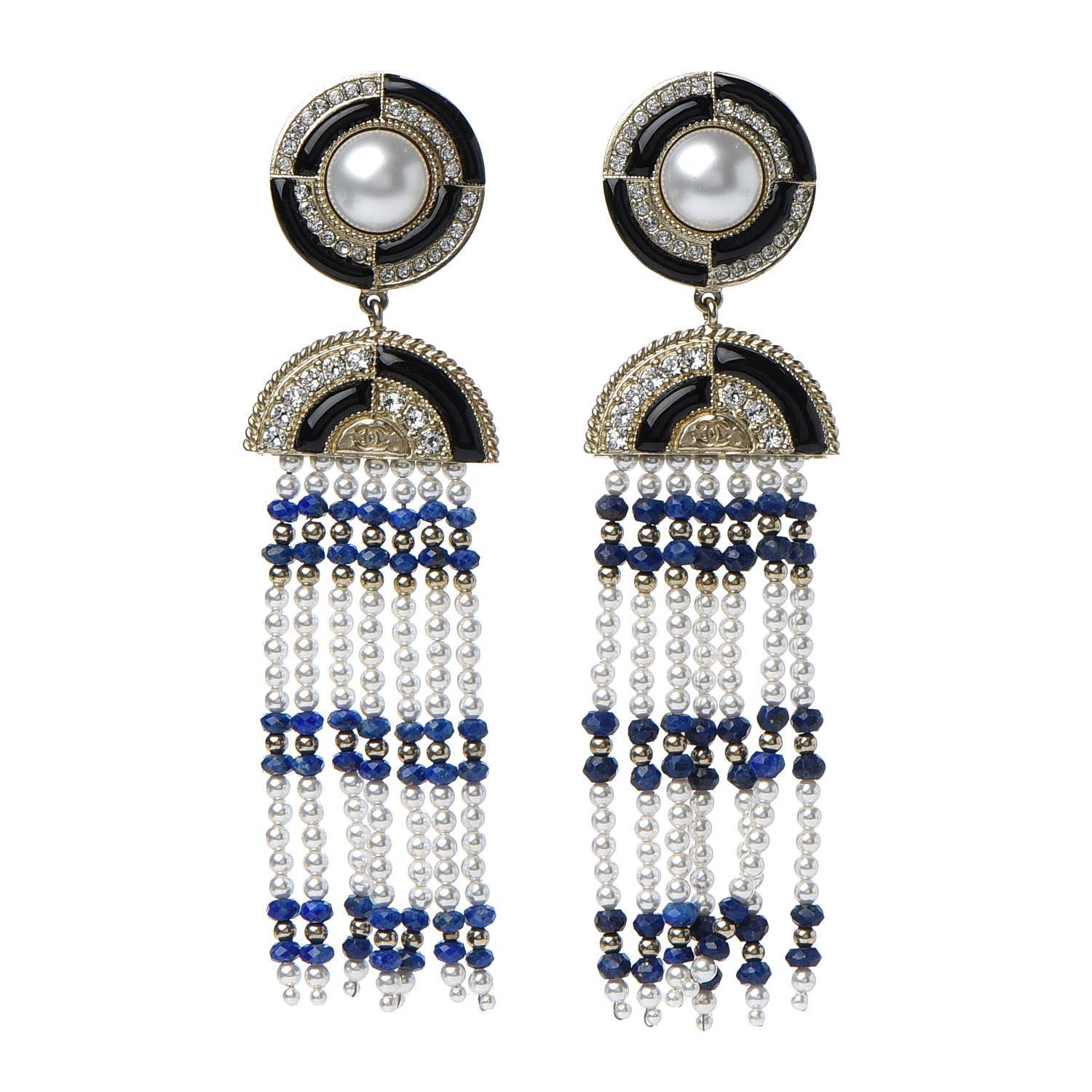 From the Fall 2019 Collection. Gold-tone Chanel CC chandelier earrings featuring faceted lapis lazuli beads, white faux pearls, faceted strass, black enamel inlays and clutch back closures.Â