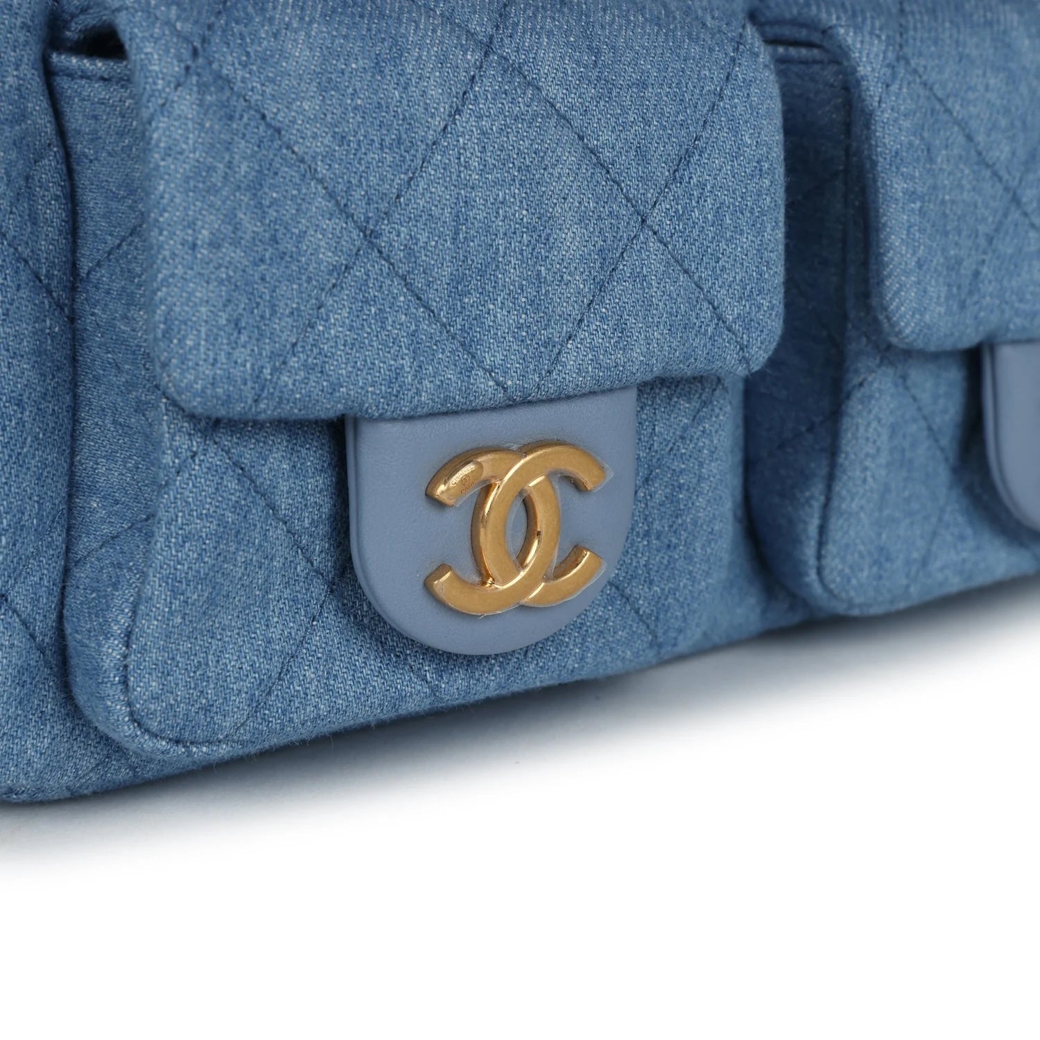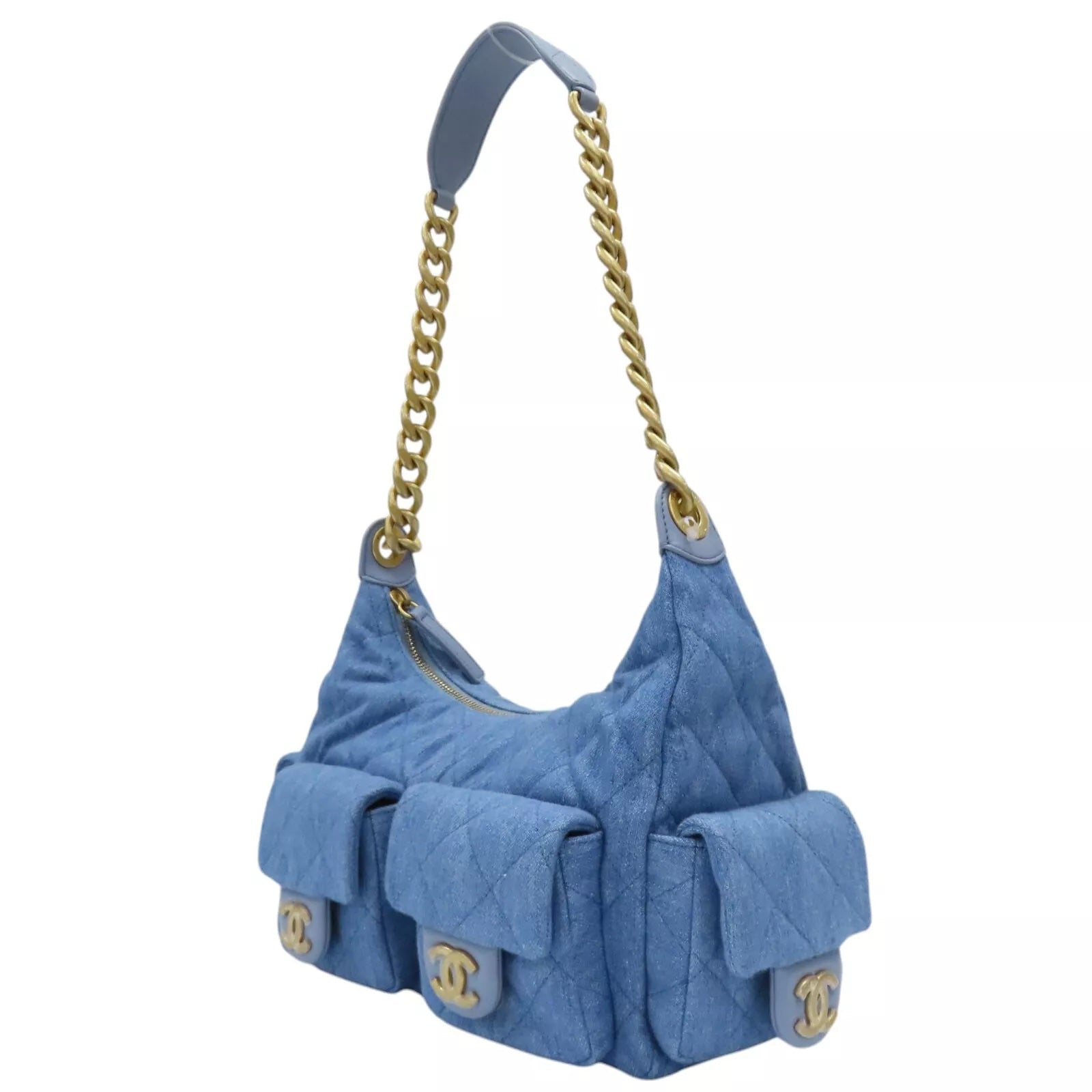 This Super Stylish Chanel Large Cargo Hobo Bag is in light blue Washed Denim with Brushed Gold-tone hardware, Featuring Signature Diamond quilt, four exterior cargo snap pockets; one on each side and two on the front, zipper closure, and one brushed gold tone chainlink and leather shoulder strap.