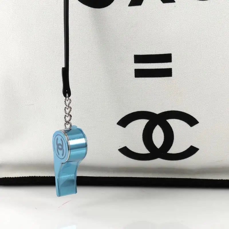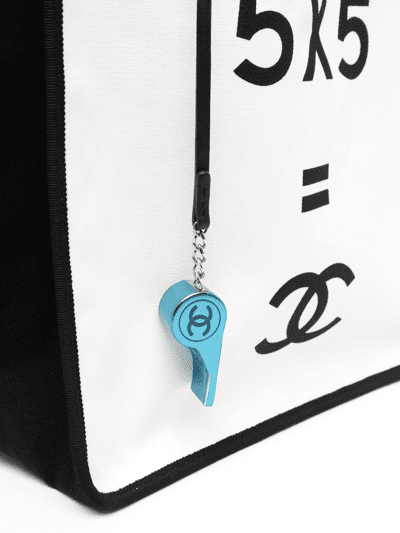 CC 5×5 tote bag from Chanel featuring black, white, canvas, leather, signature interlocking CC logo, two top handles, open top, main compartment, internal slip pocket, internal logo patch, silver-tone hardware, whistle charm.