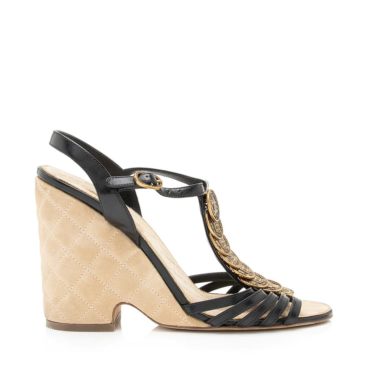 Chanel wedge sandals designed with an antiqued gold-toned coin embellishment and patent leather straps. Features a wedge heel with quilted suede throughout and buckle closure strap.Â