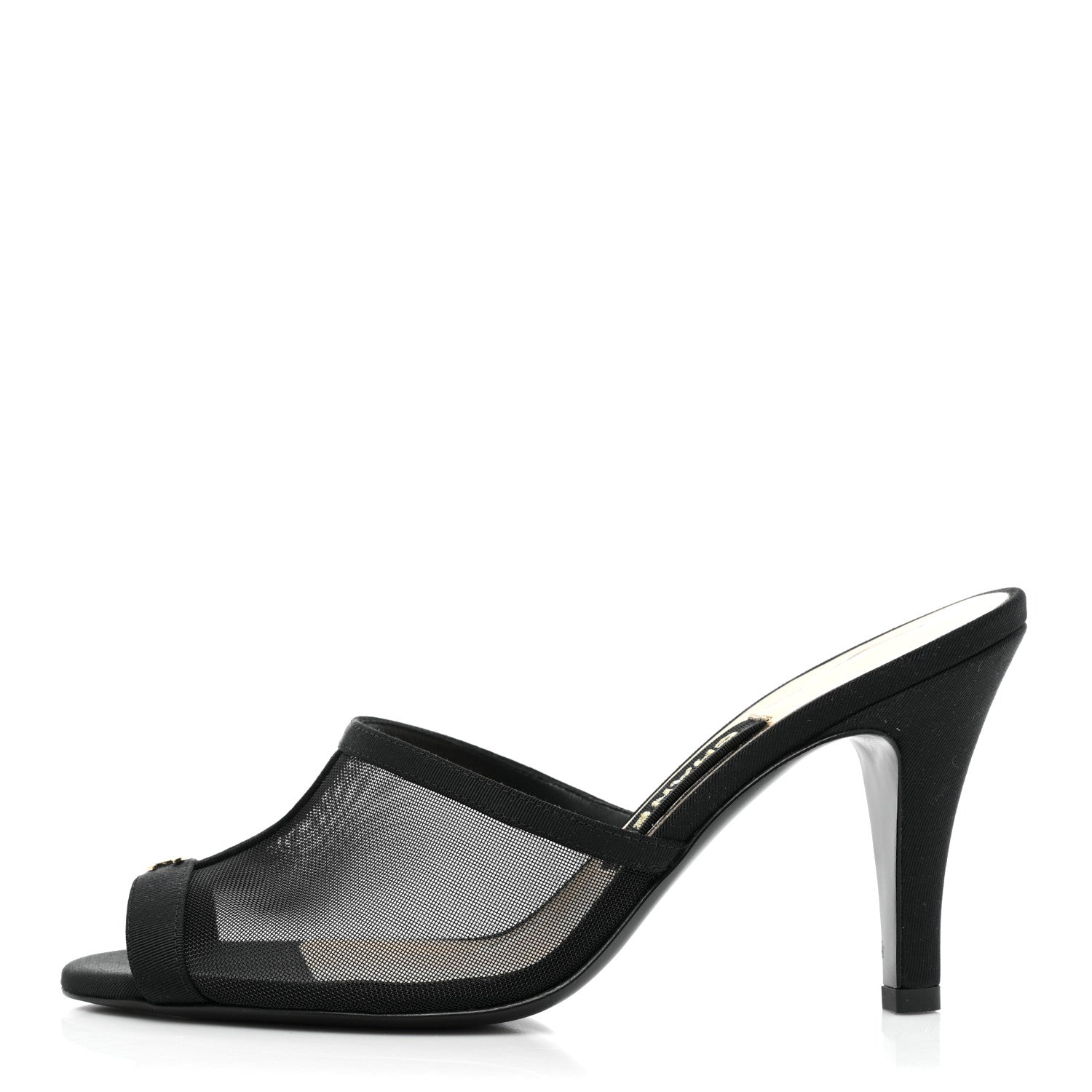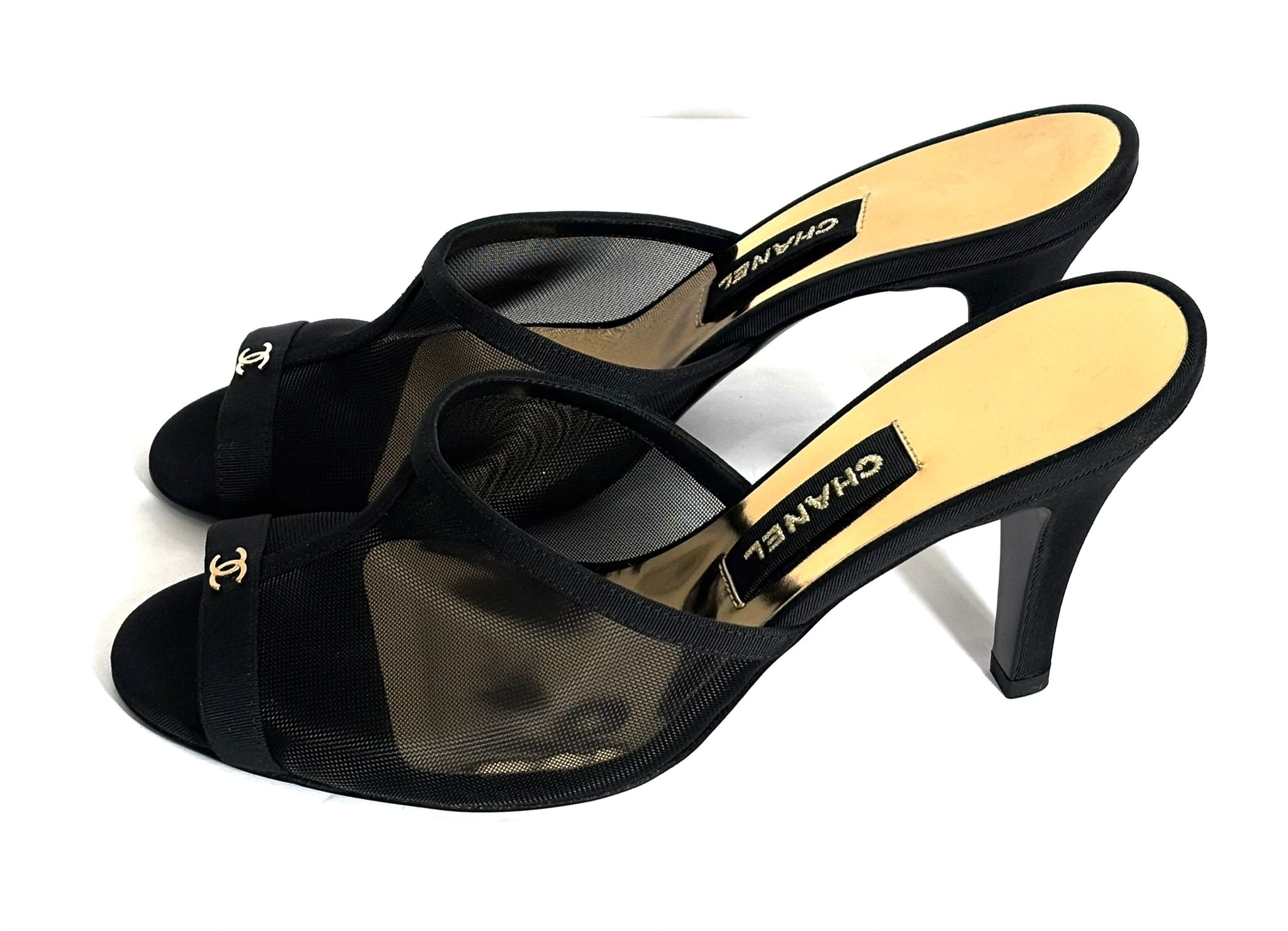 CHANEL MESH GROSGRAIN CC HEELED MULES