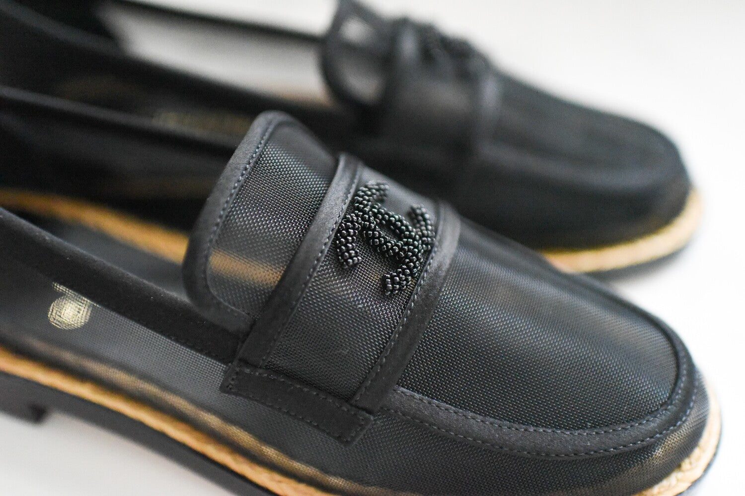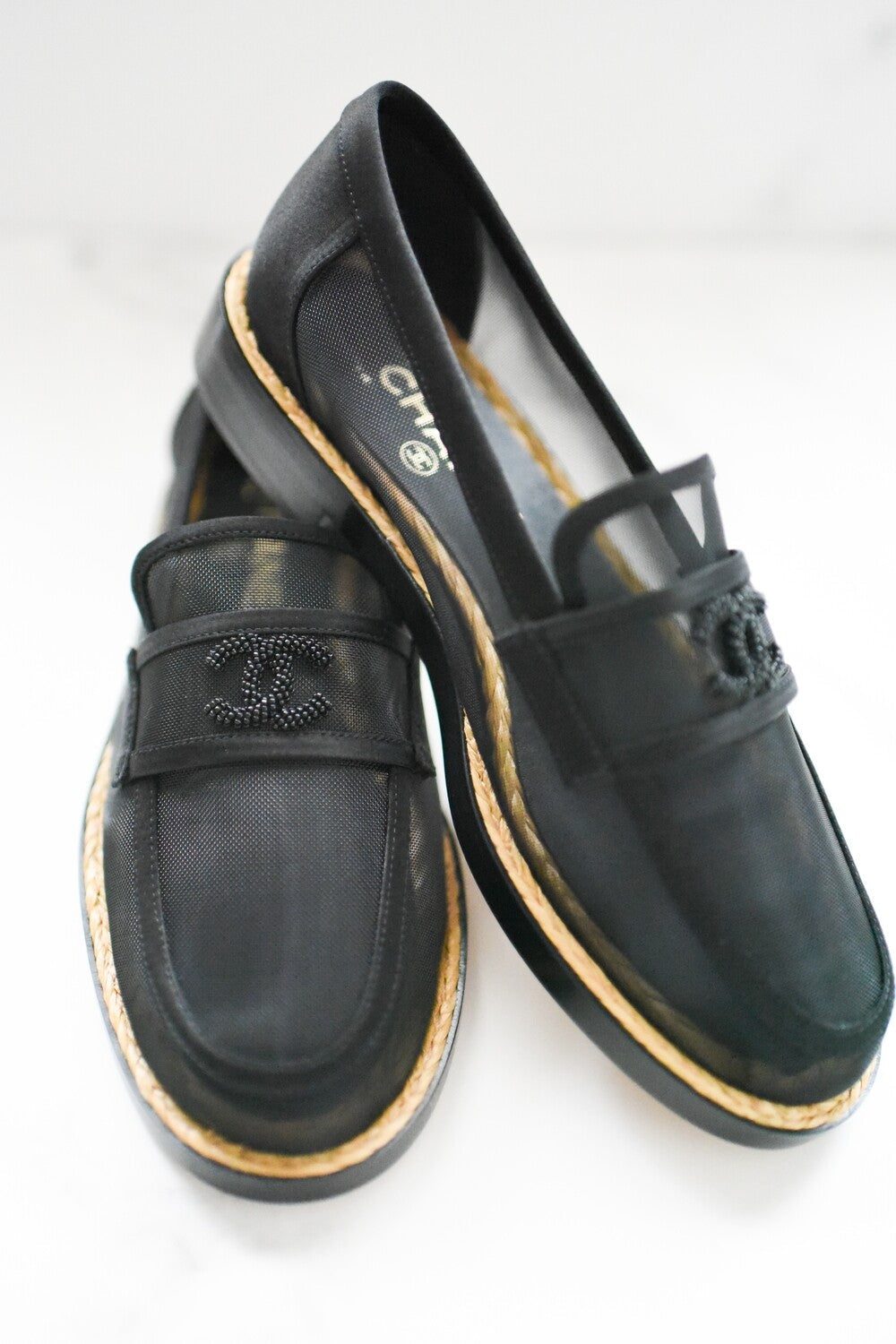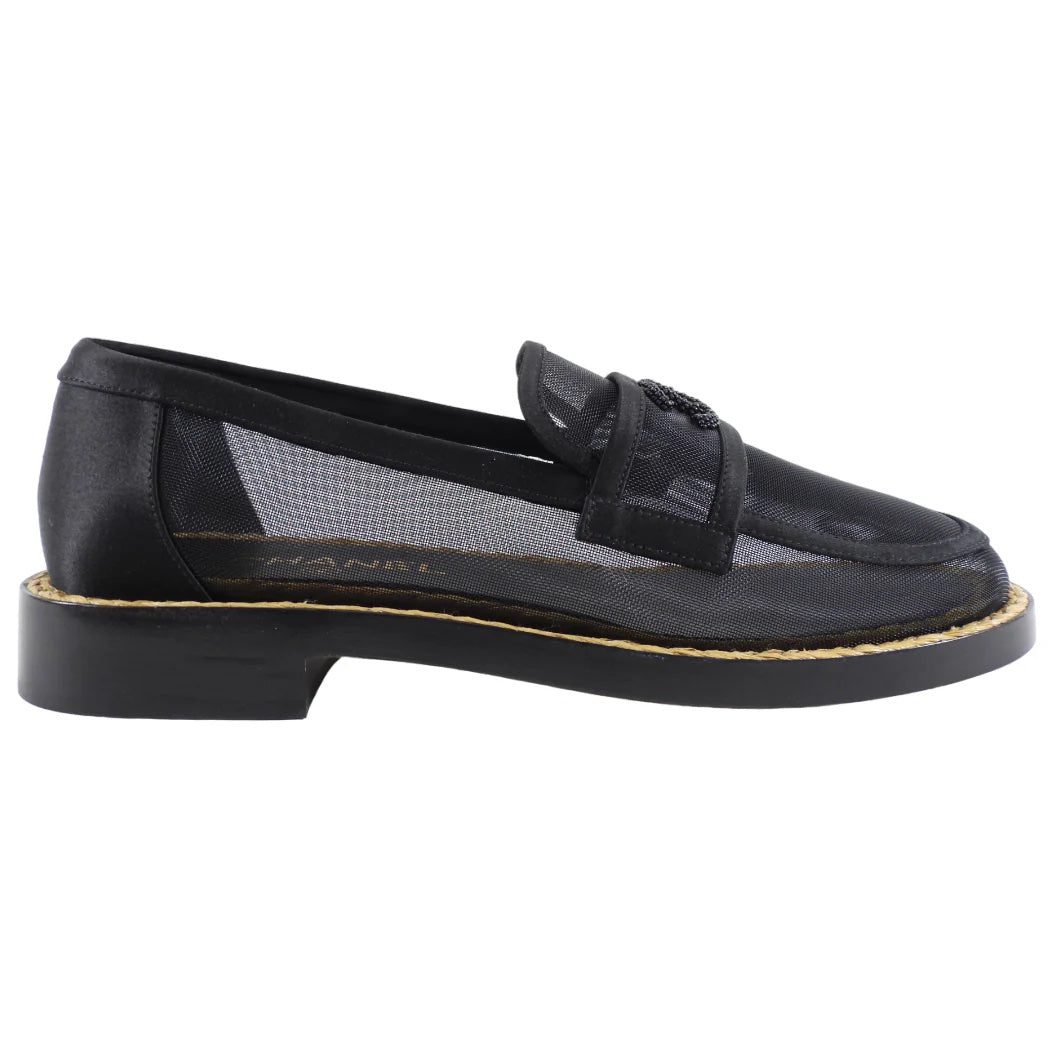 Exude Effortless Sophistication with the Chanel Mesh & Satin Beaded CC Slip-On Loafers, a perfect blend of Elegance and Comfort.