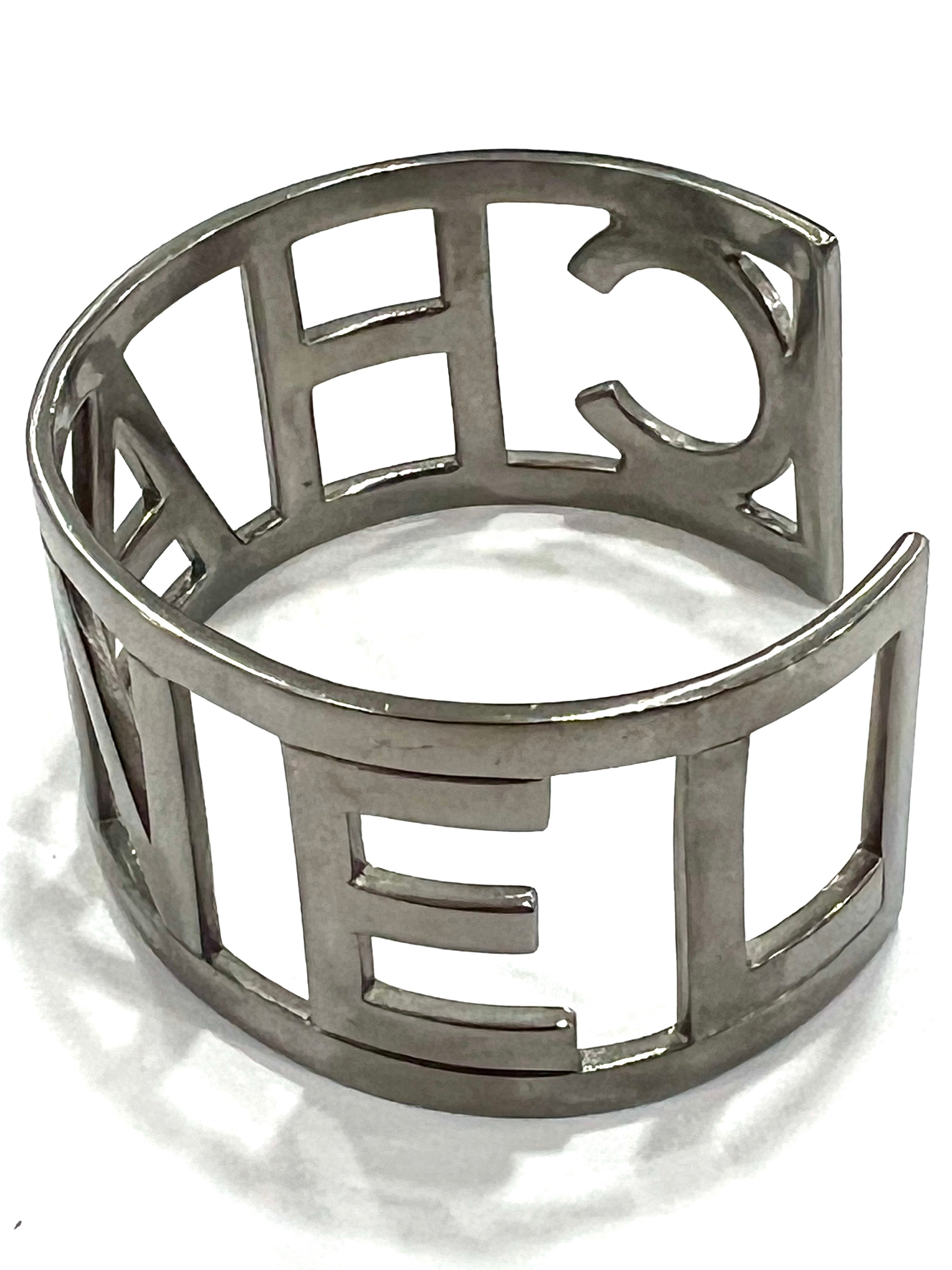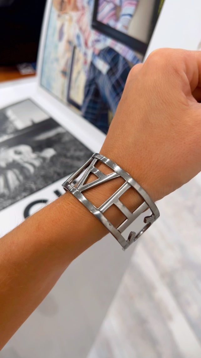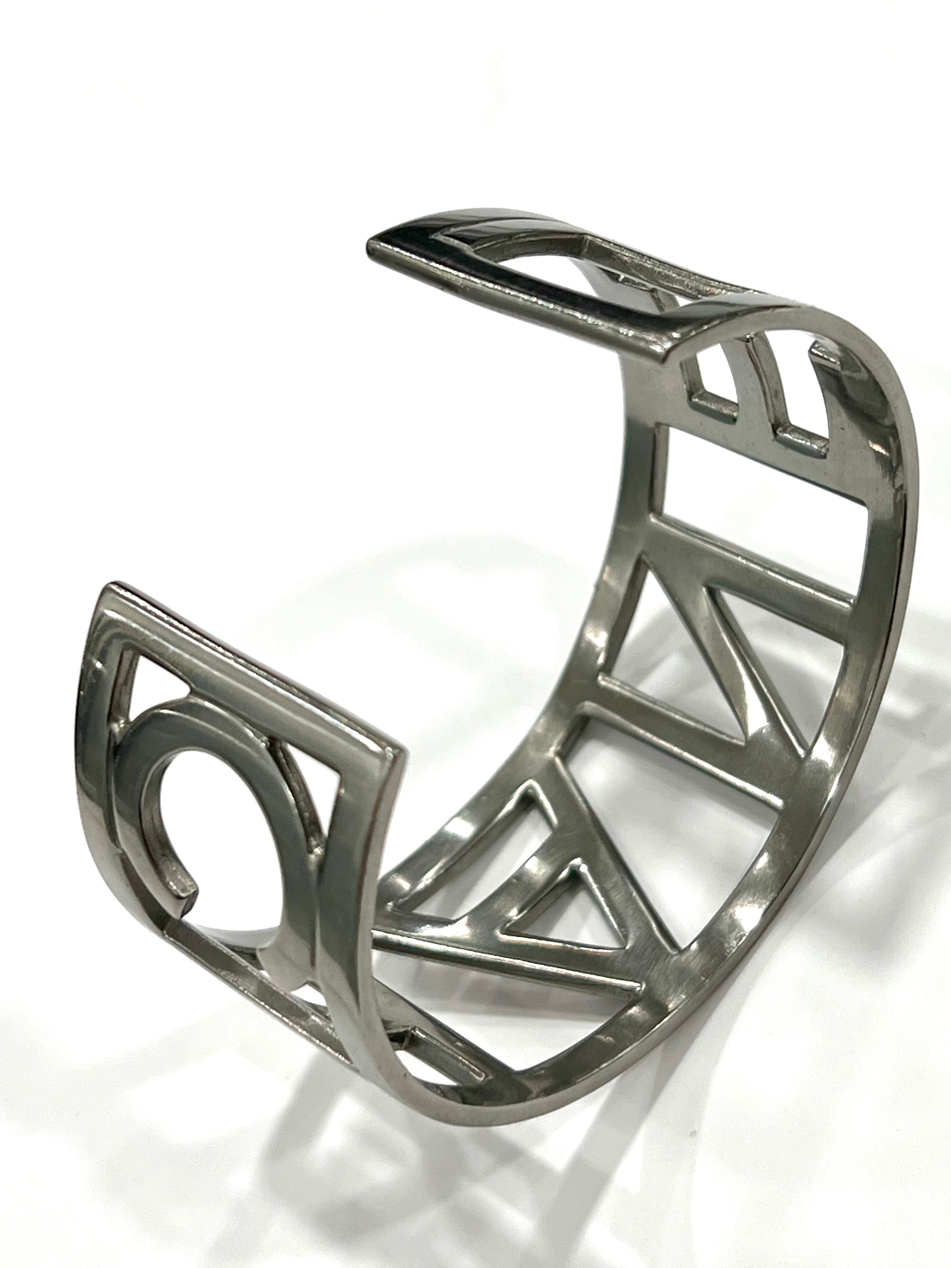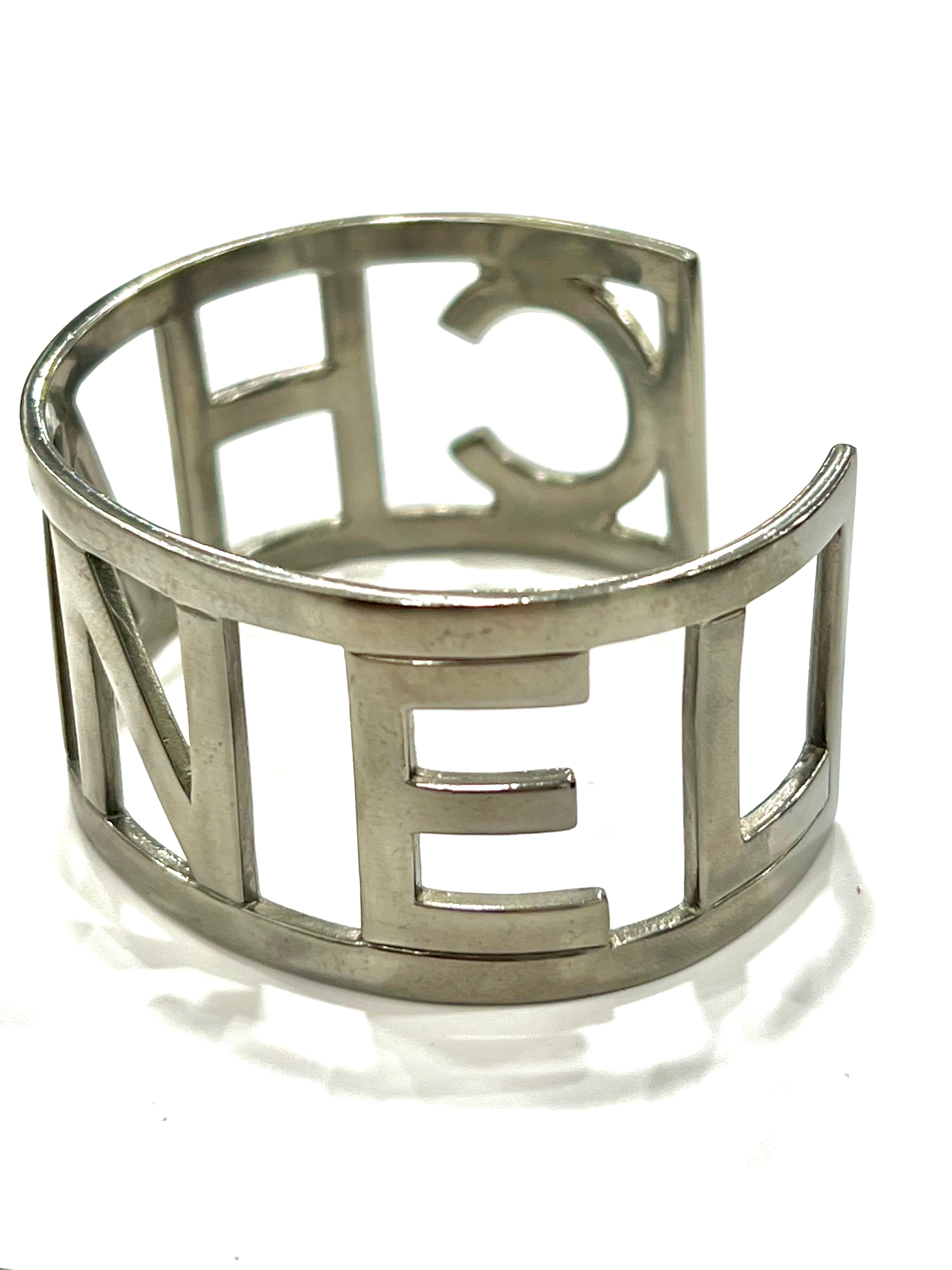 This Striking Cuff Bracelet features the Chanel logo in Silver-tone letters.Â