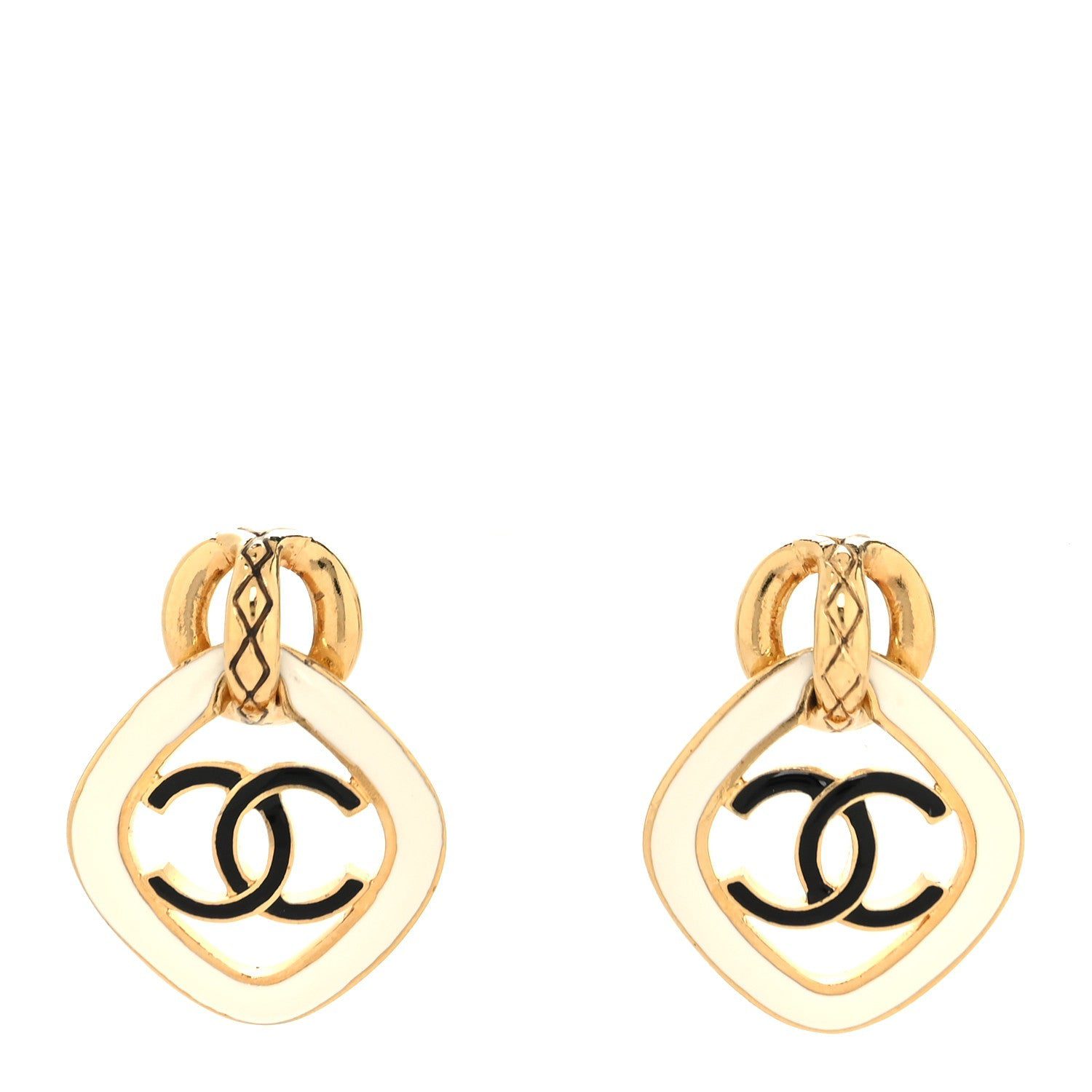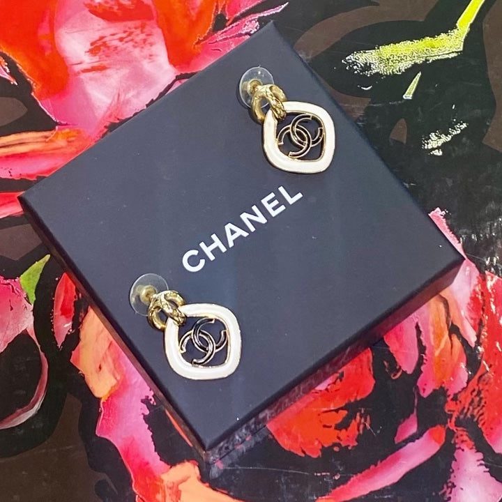 These Iconic Stylish Earrings feature a dangling enameled black and white Chanel CC logo.