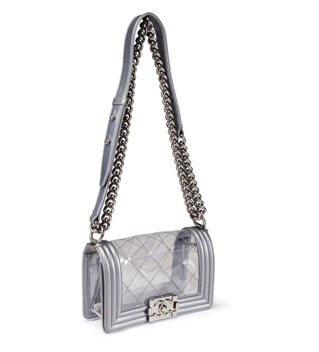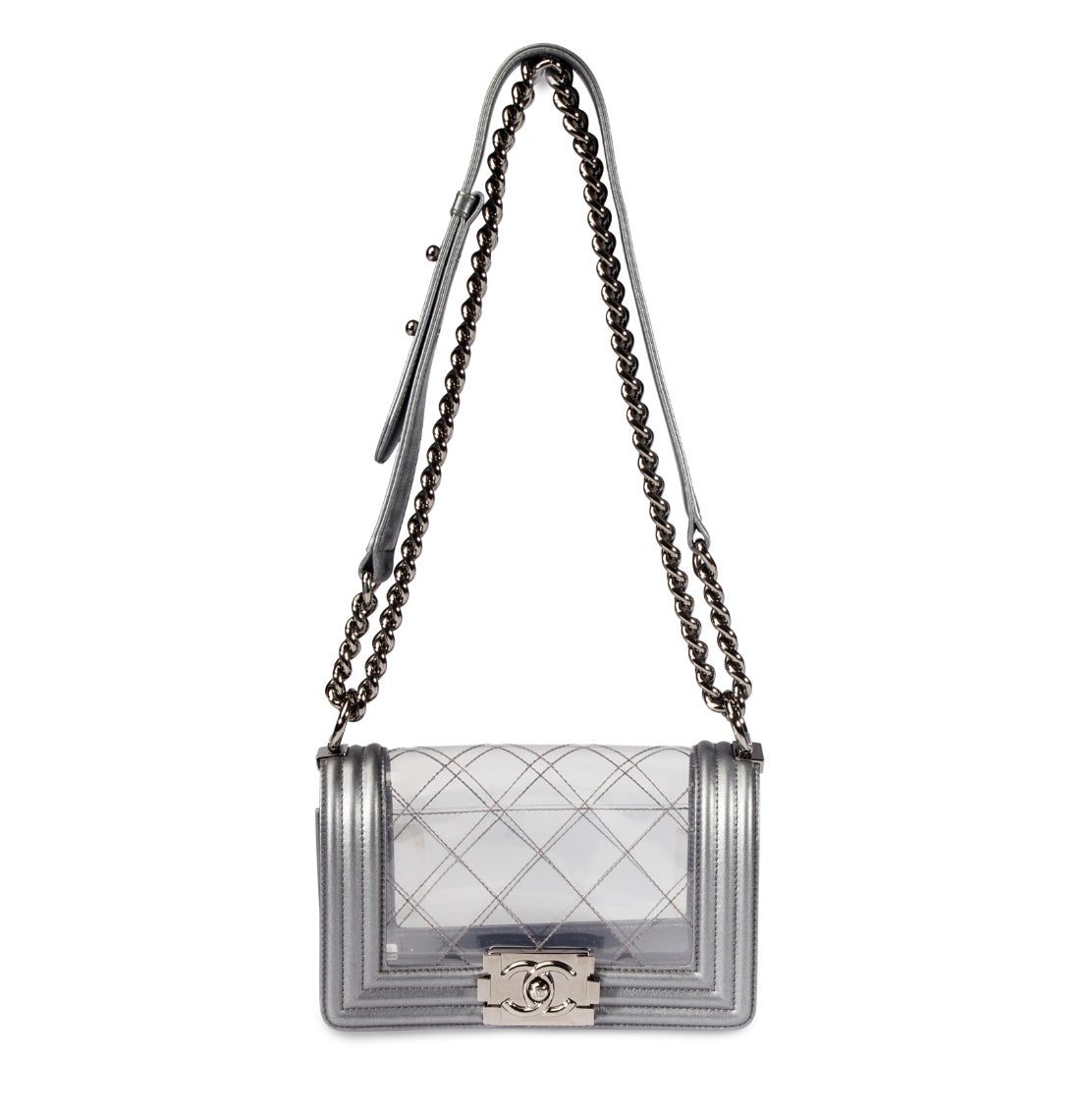 The bag features a dark Ruthenium silver chain shoulder strap with a shoulder pad and a facing dark silver boy CC press lock.Â