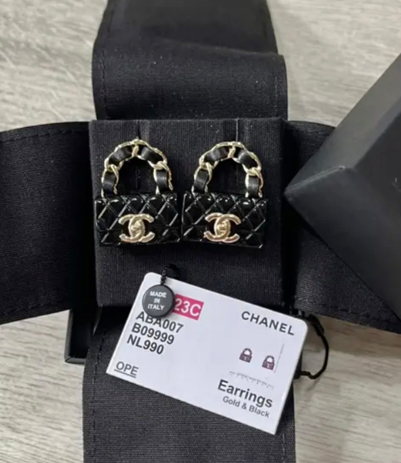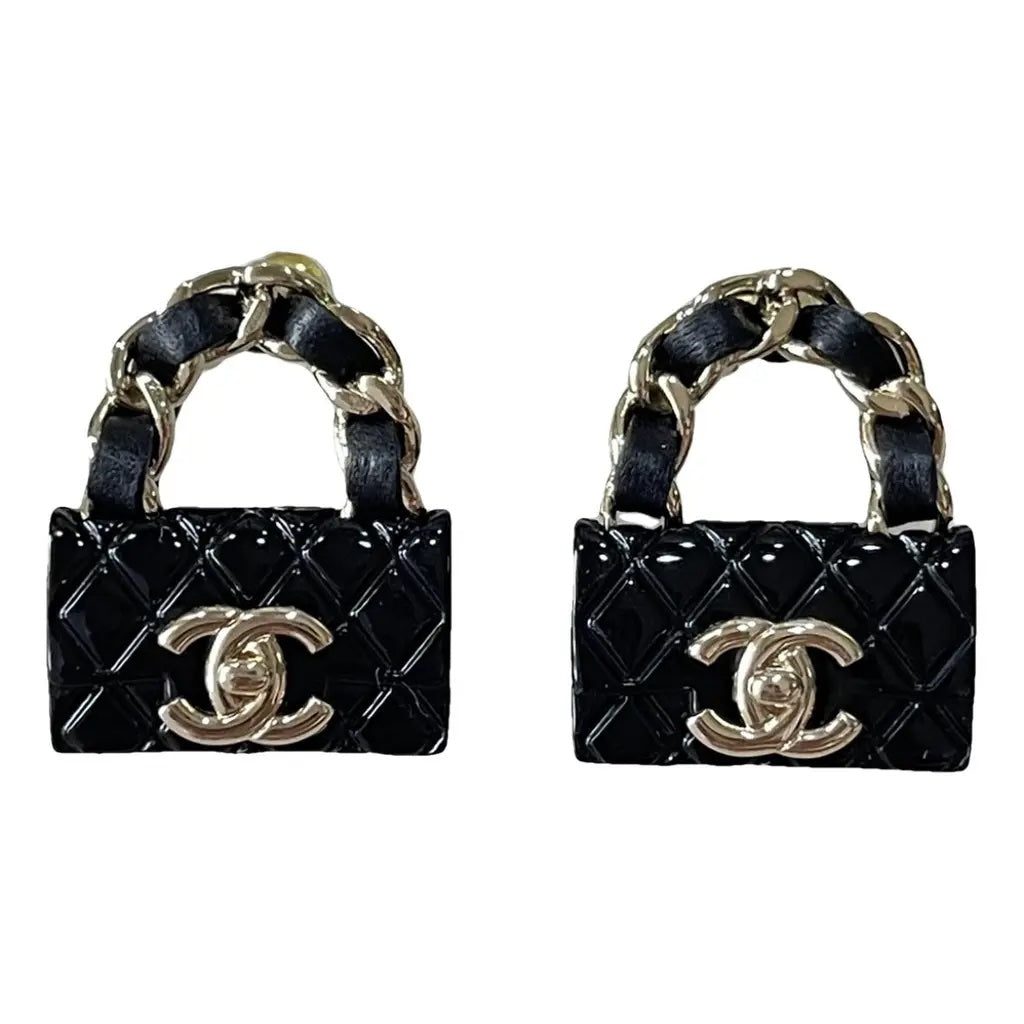 These Stunning Chanel Earrings Feature a Black resin Chanel purse with a gold small CC logo.