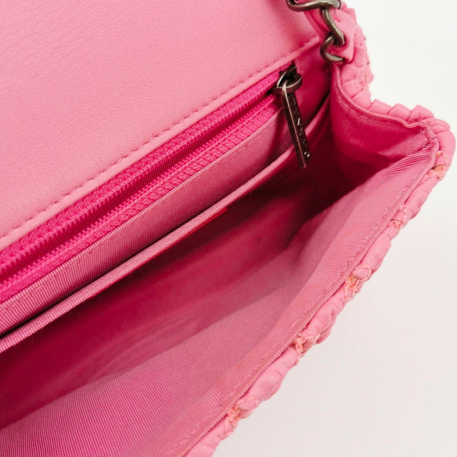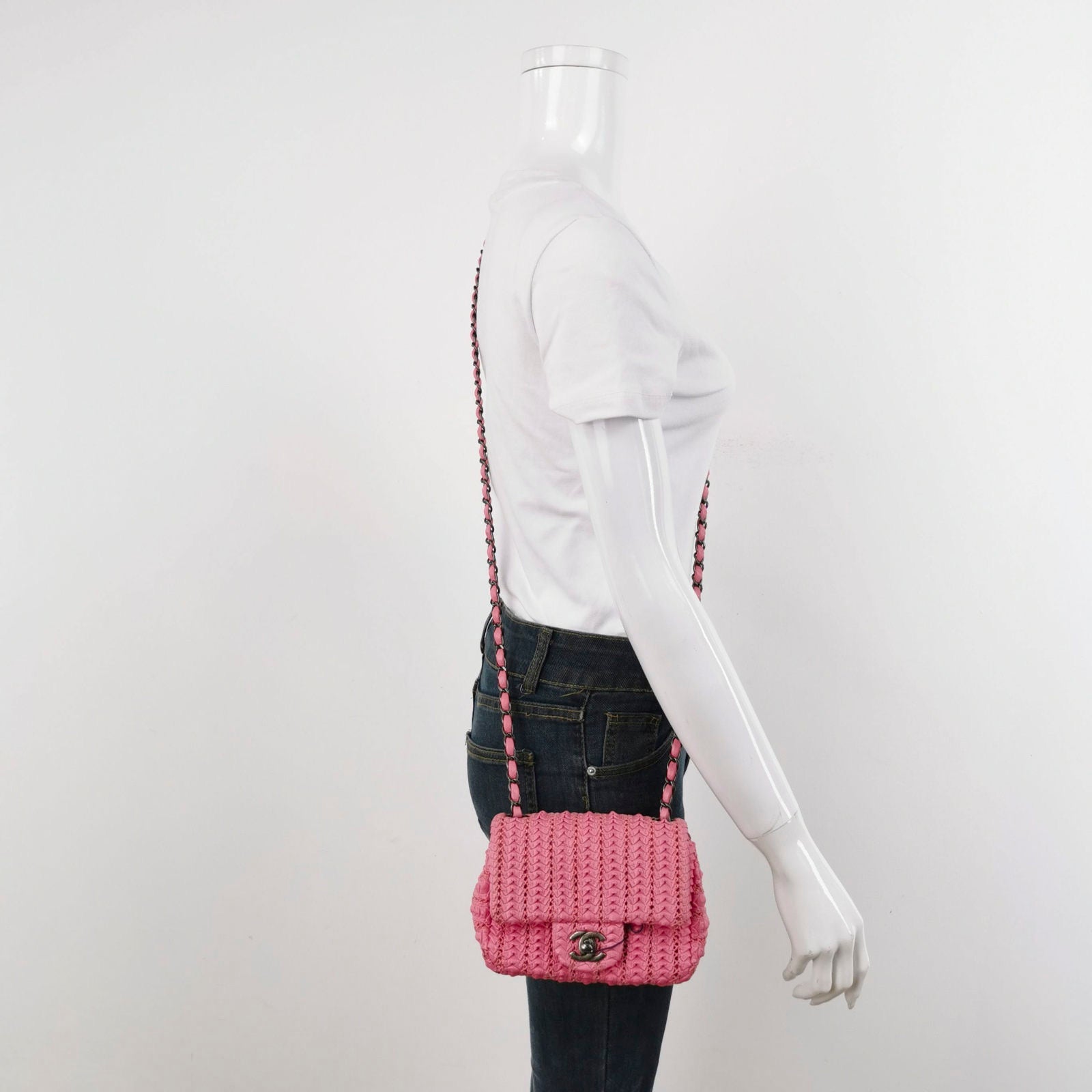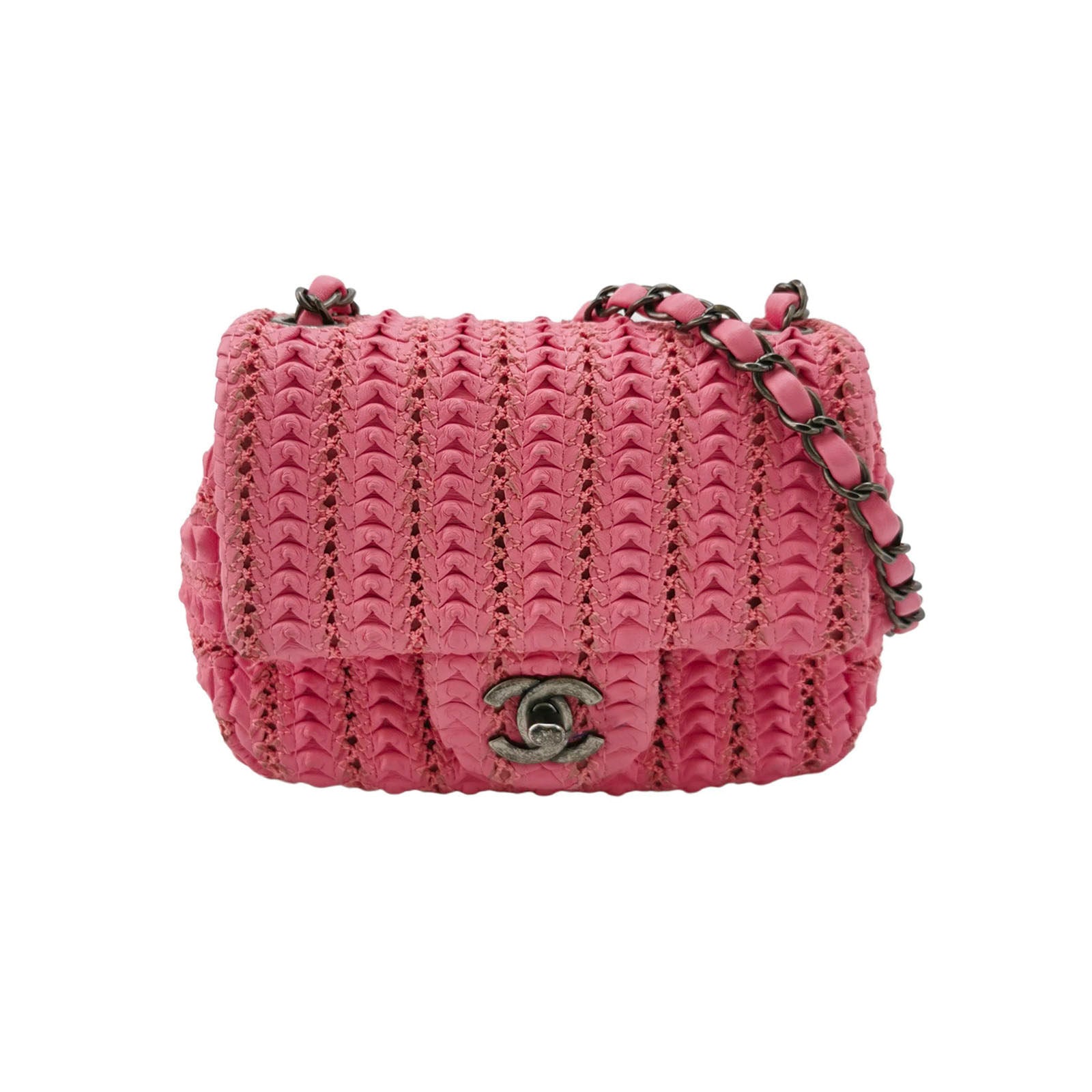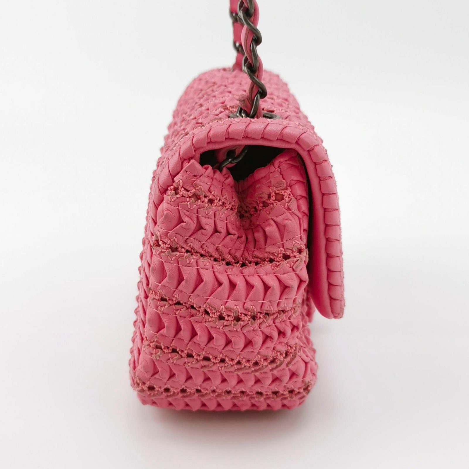 This one-of-a-kind Chanel Classic Flap bag exudes sophistication and timeless elegance. Crafted from luxurious pink lambskin leather in a crochet style, it is adorned with silver hardware.