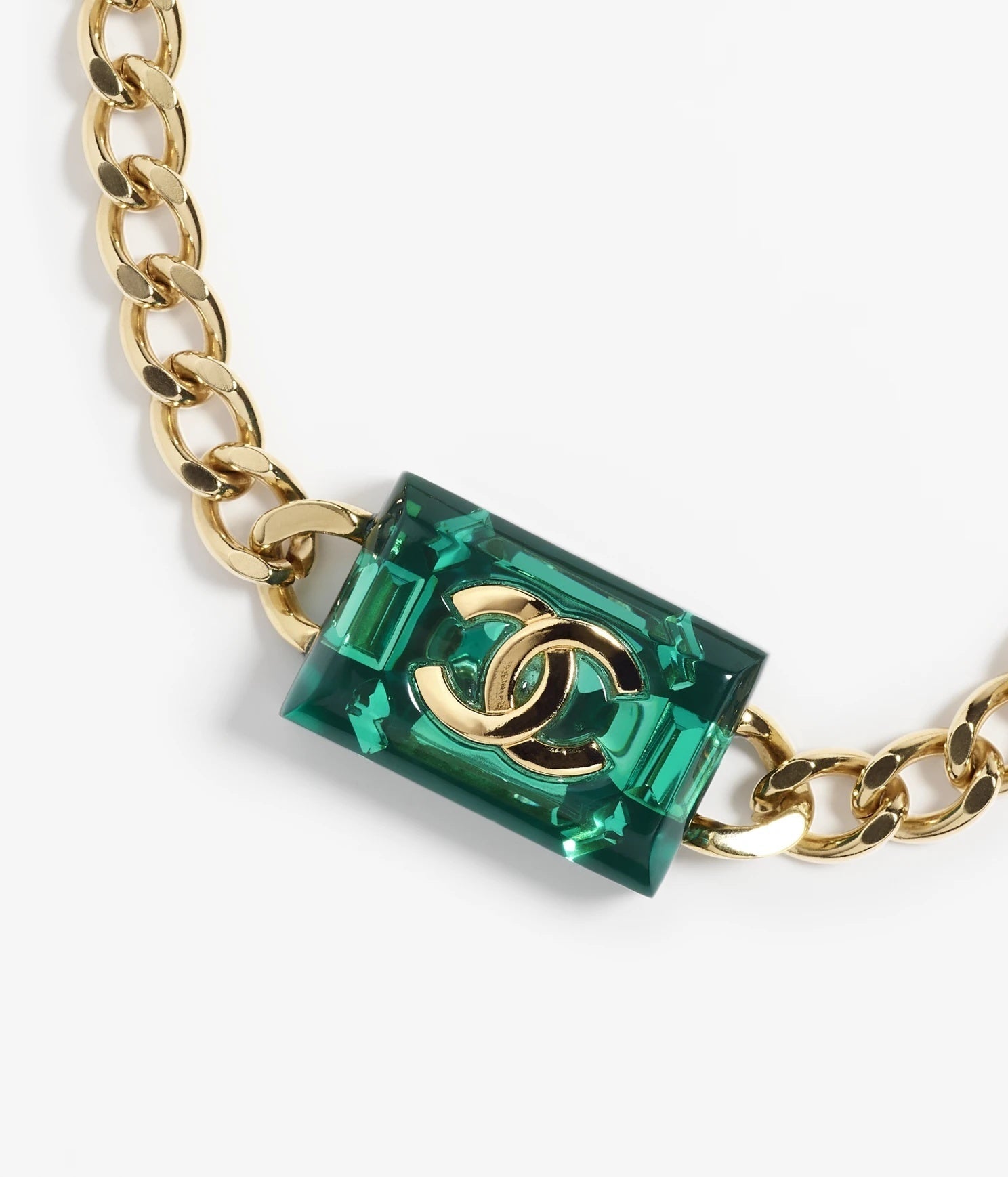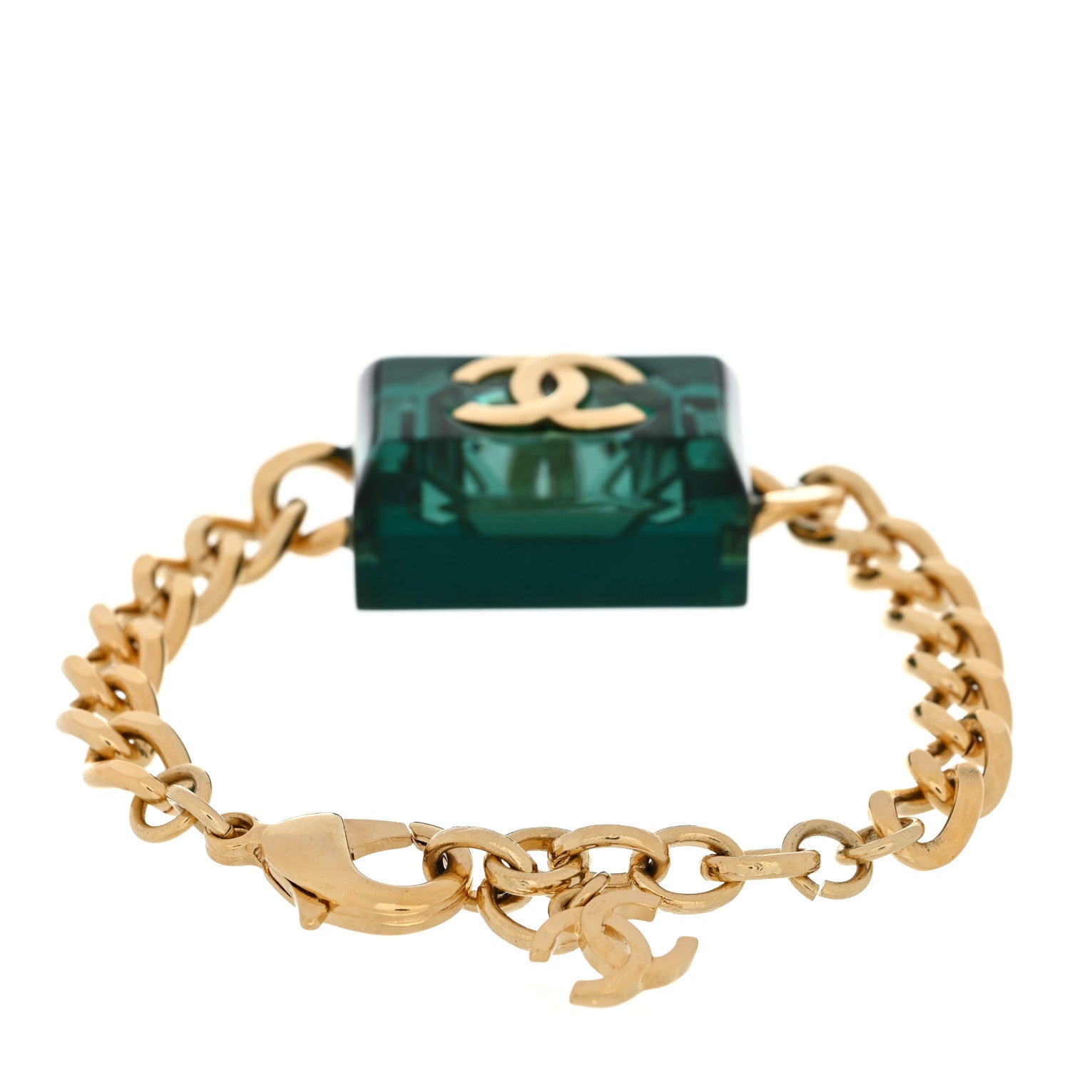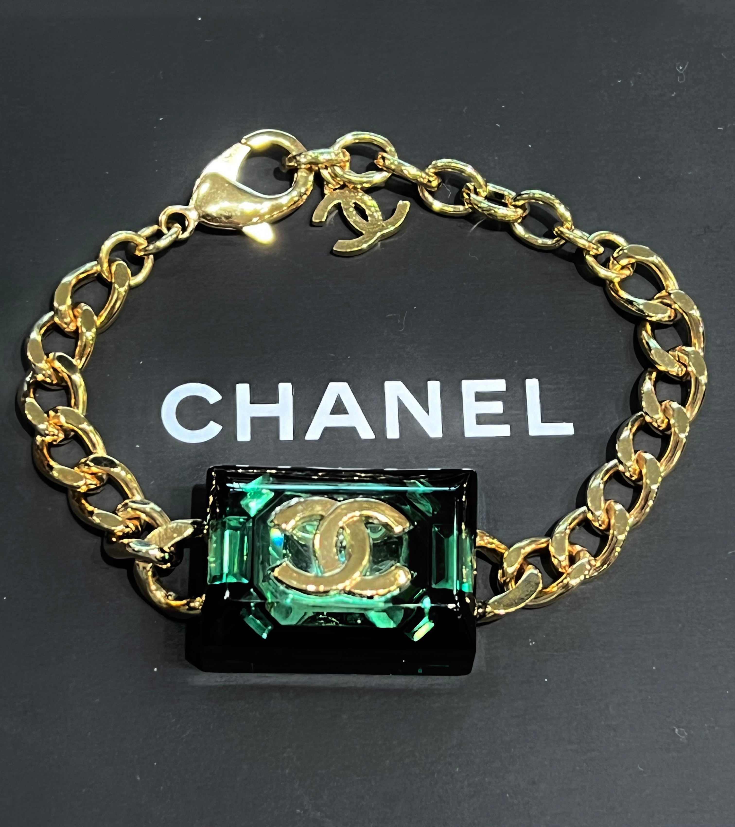 This Stunning Elegant Bracelet is Crafted in Oversized Chain links with a CC Logo set on a Green Mirror Resin Background.