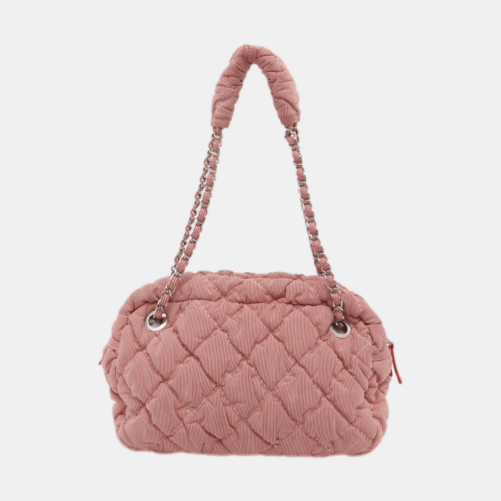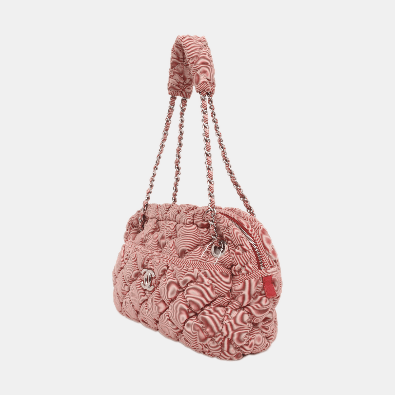 Discover the perfect balance of style and functionality with the Chanel Nylon Bubble Striped Quilt Accordion Flap Bag. Made with a cute bubble design, this bag is not only eye-catching, but also super light and roomy. The red interior adds a pop of color and offers plenty of space for all your essentials. Elevate your everyday look with this must-have accessory.