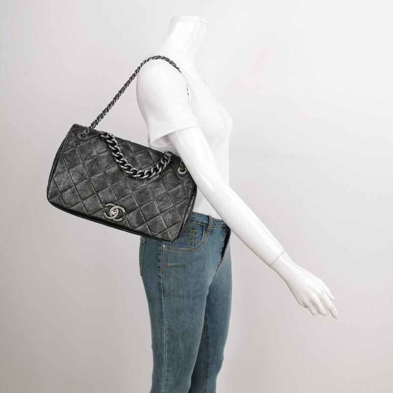 Chanel Paris Bombay Pondicherry Flap Bag Quilted Large Grey Silver Hardware
