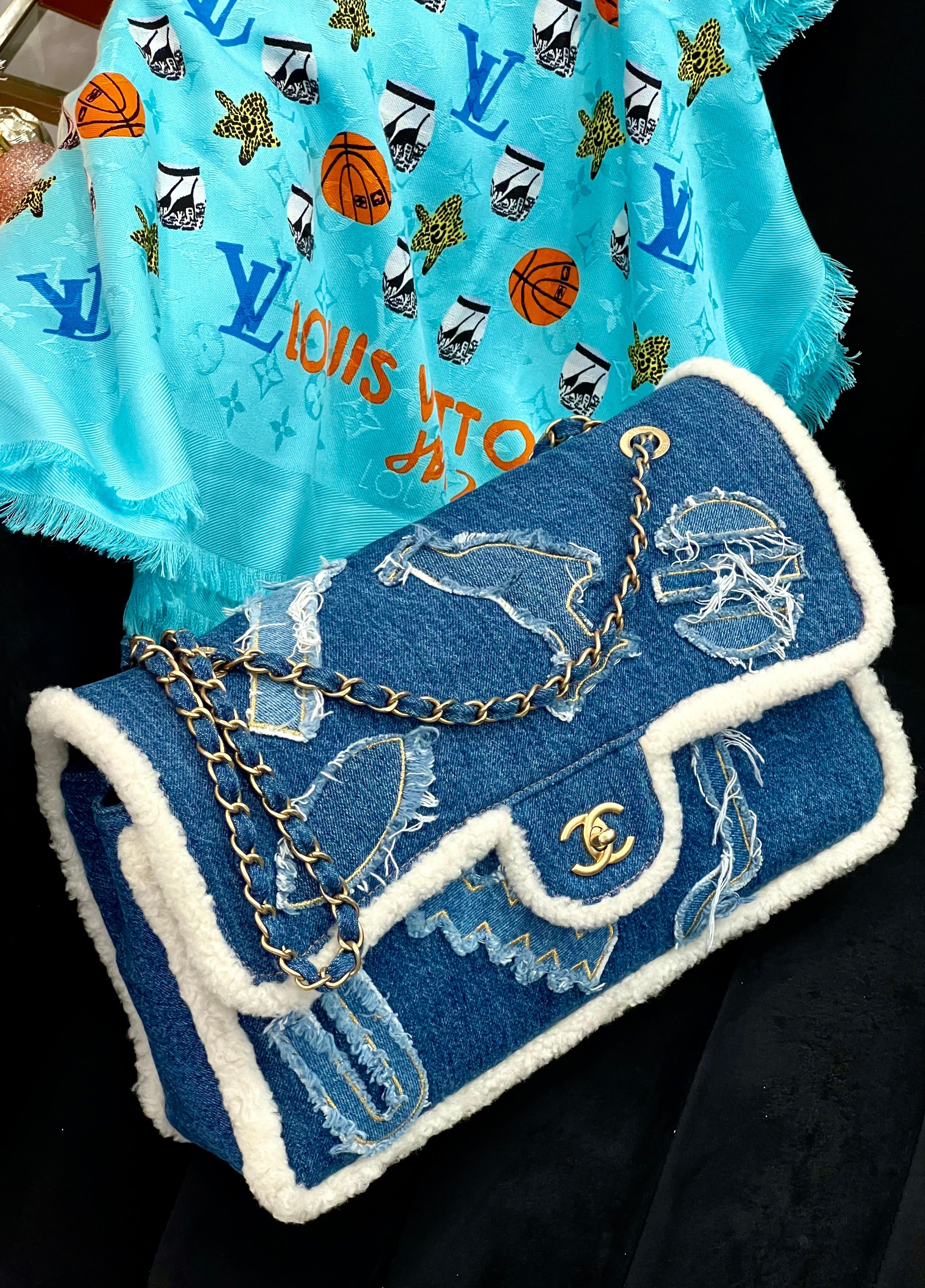 Metiers d’Art Paris-Egypt collection, this updated Jumbo Classic Flap bag is Rendered in Blue Denim and Natural shearling, featuring raw-edge hieroglyph appliqué with gold-tone embroidery along the edges.
