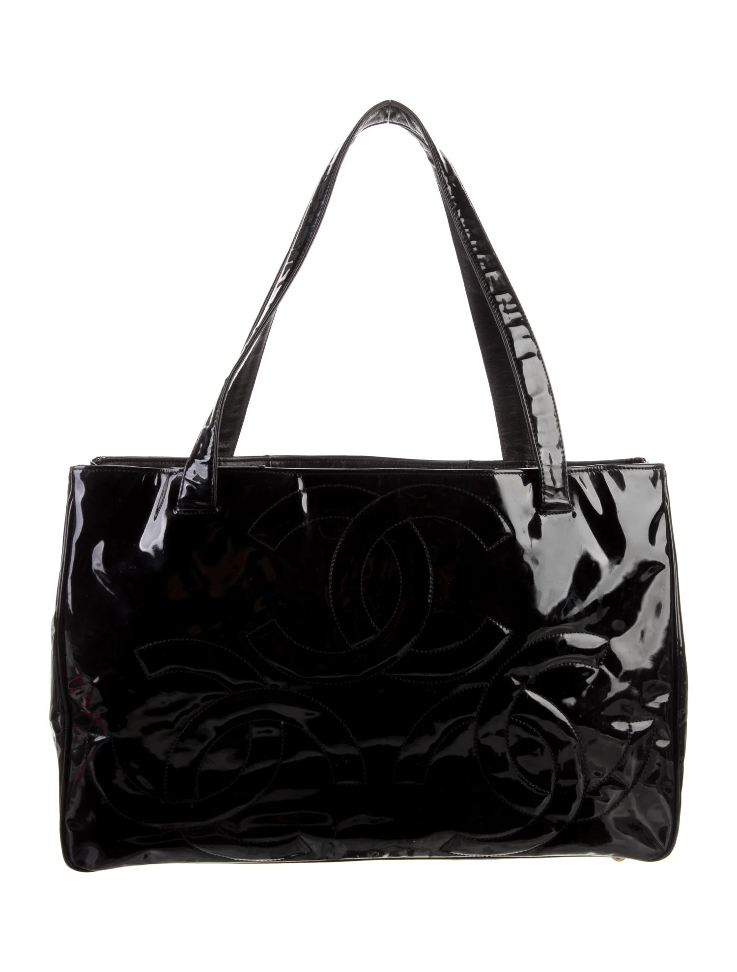Featuring Glossy patent leather and a fun triple interlocking CC logo stitched at the front and back, this tote bag crafted in patent leather Epitomises Chanel sophistication.Â