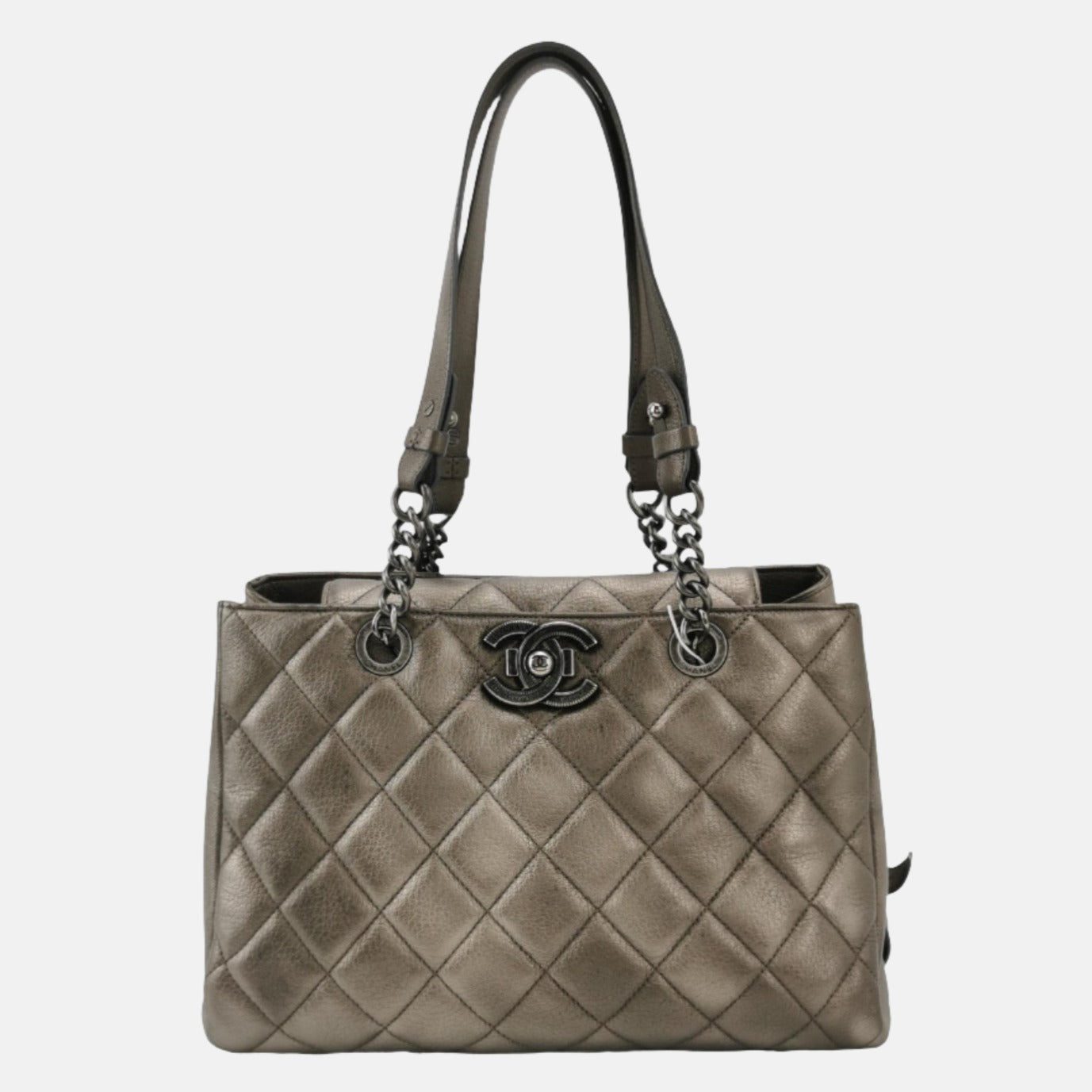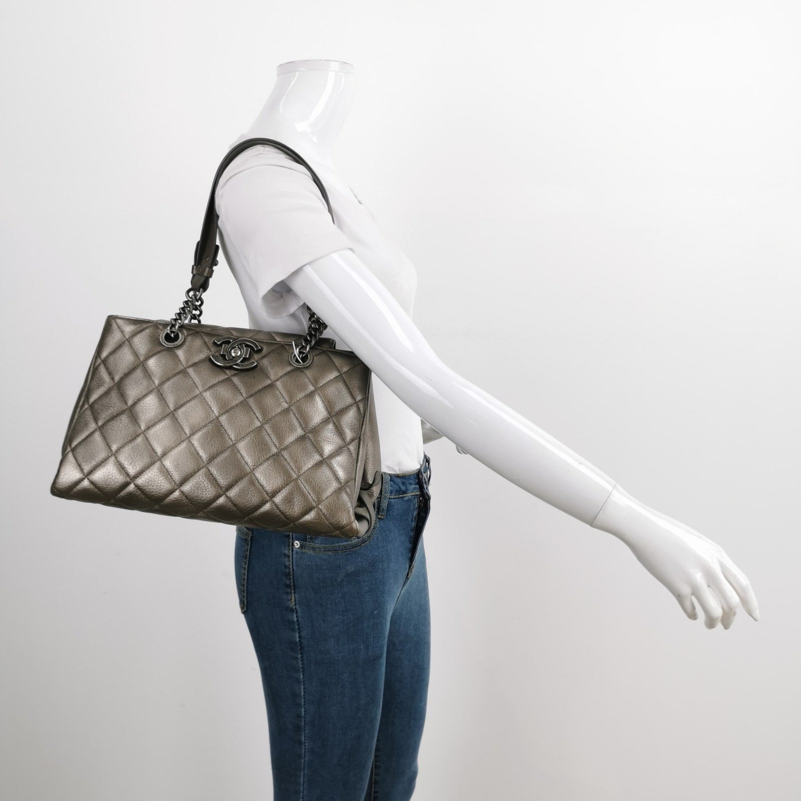 Elevate your style with the Chanel Portobello Tote Bag. Crafted in metallic quilted calfskin leather with dark silver tone hardware, this large tote is perfect for the boss girl on the go.Â